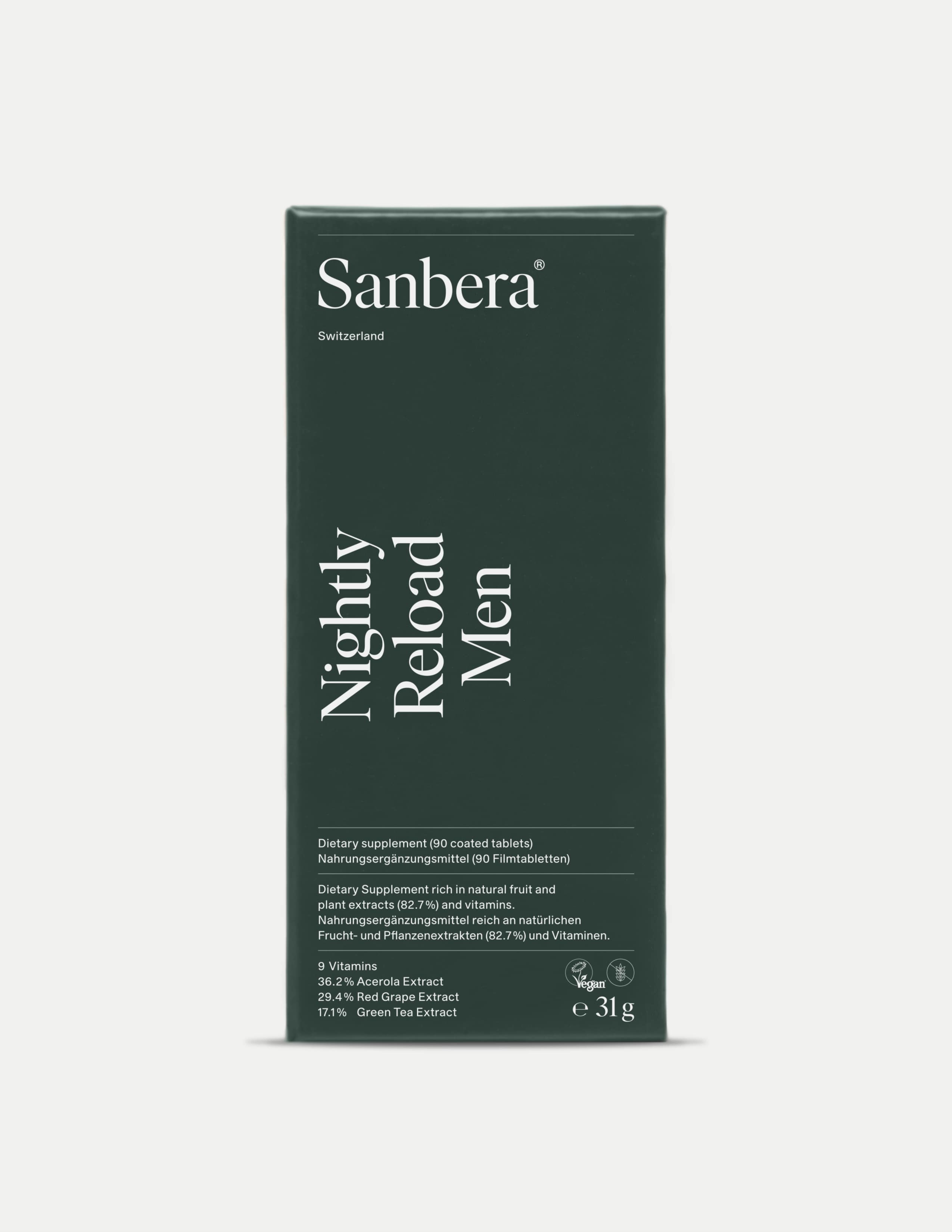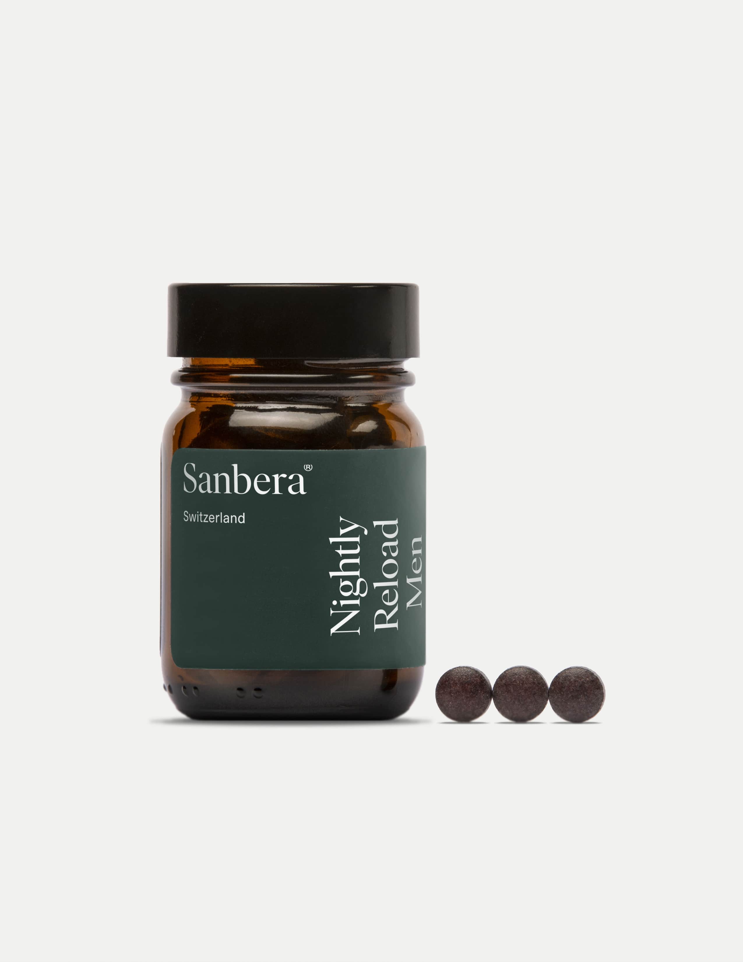 Discover Nightly Reload Men, meticulously designed to optimize men's health and the second phase of the Sanbera system. This vegan supplement assists you in effortlessly meeting your nutritional needs at night, crafted with clean, premium ingredients. It is a potent blend of food extracts and nine essential vitamins from Acerola, Red Grape, and Green Tea known for their effects and benefits on strengthening immunity and regenerating the body from the inside while you sleep.