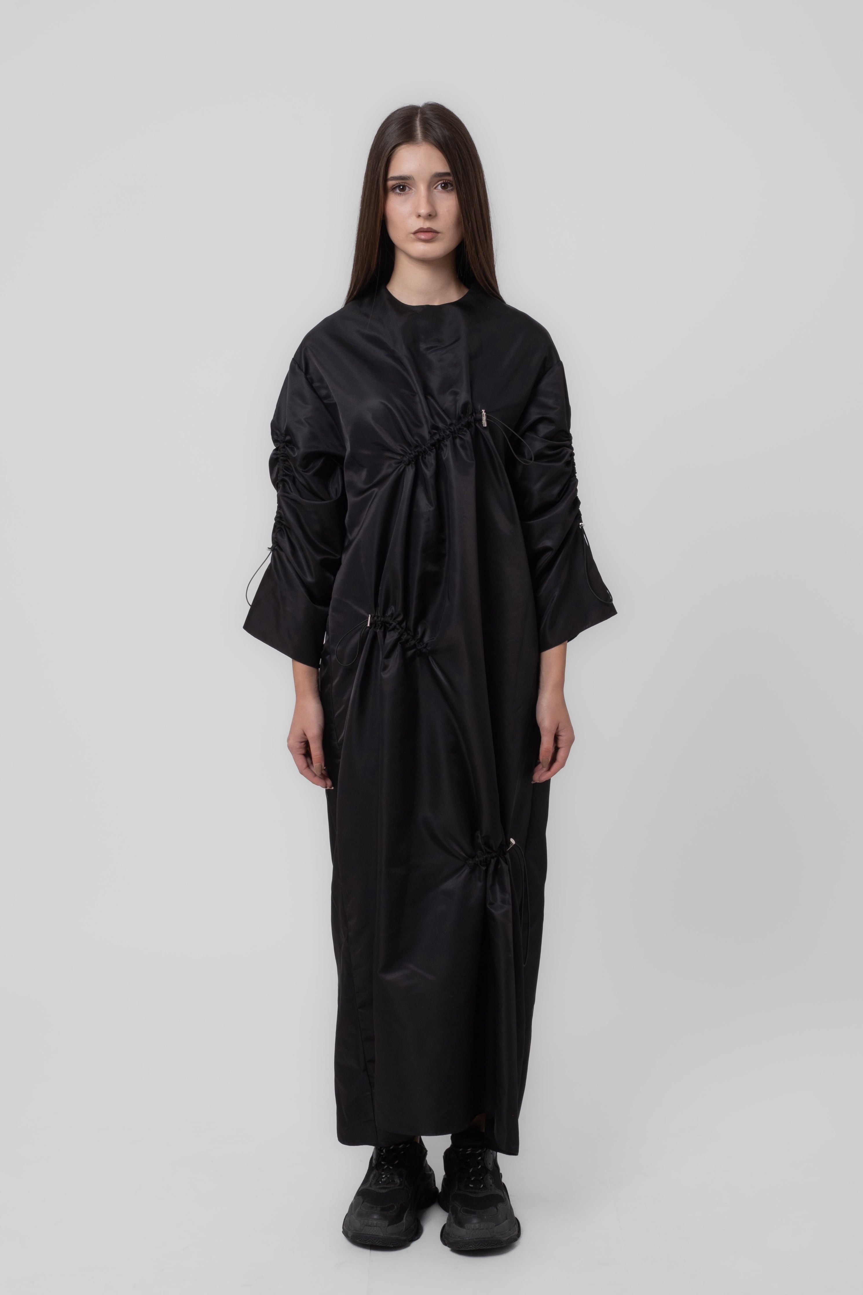 Style: The Nixie Dress is an avant-garde maxi dress crafted from a smooth, technical black fabric that offers both fluidity and structure. This piece uses adjustable detailing to transform its silhouette, making it a true statement garment. Multiple drawstrings are strategically placed across the body, allowing the wearer to dramatically ruche and cinch the fabric. This creates sculptural volume, drapes, and an asymmetric texture across the bodice and skirt panels.