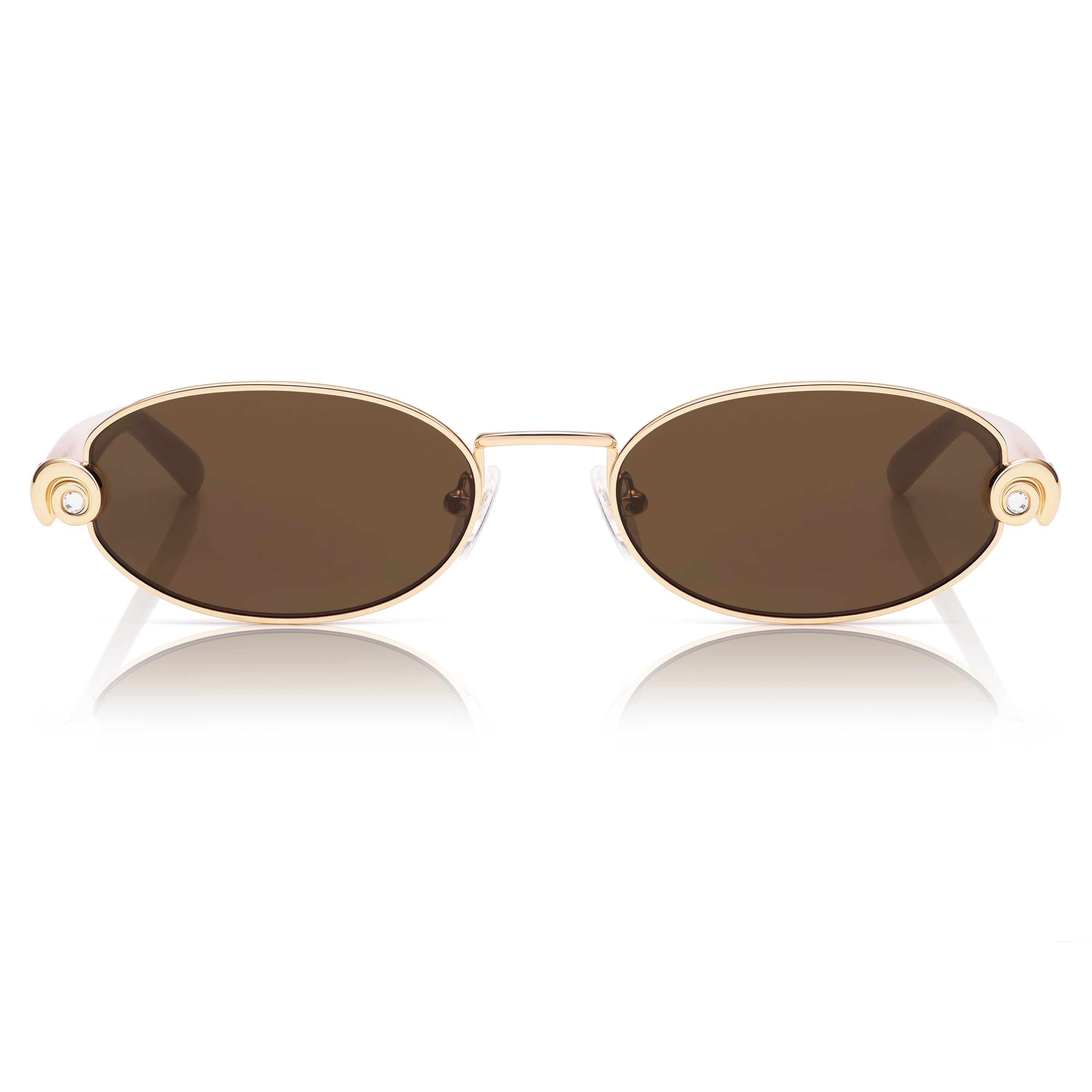- Dimensional shell metal accent on temple