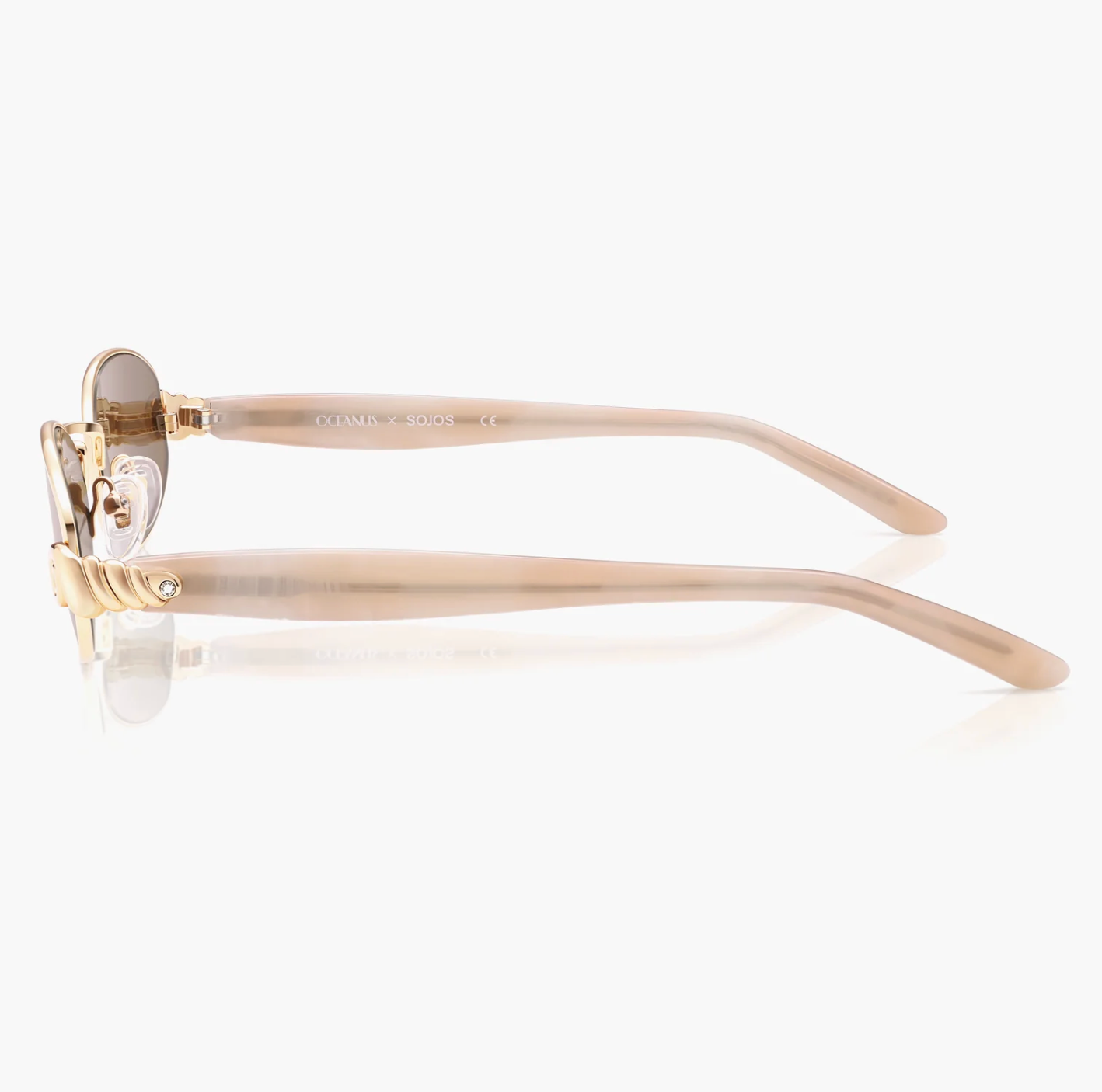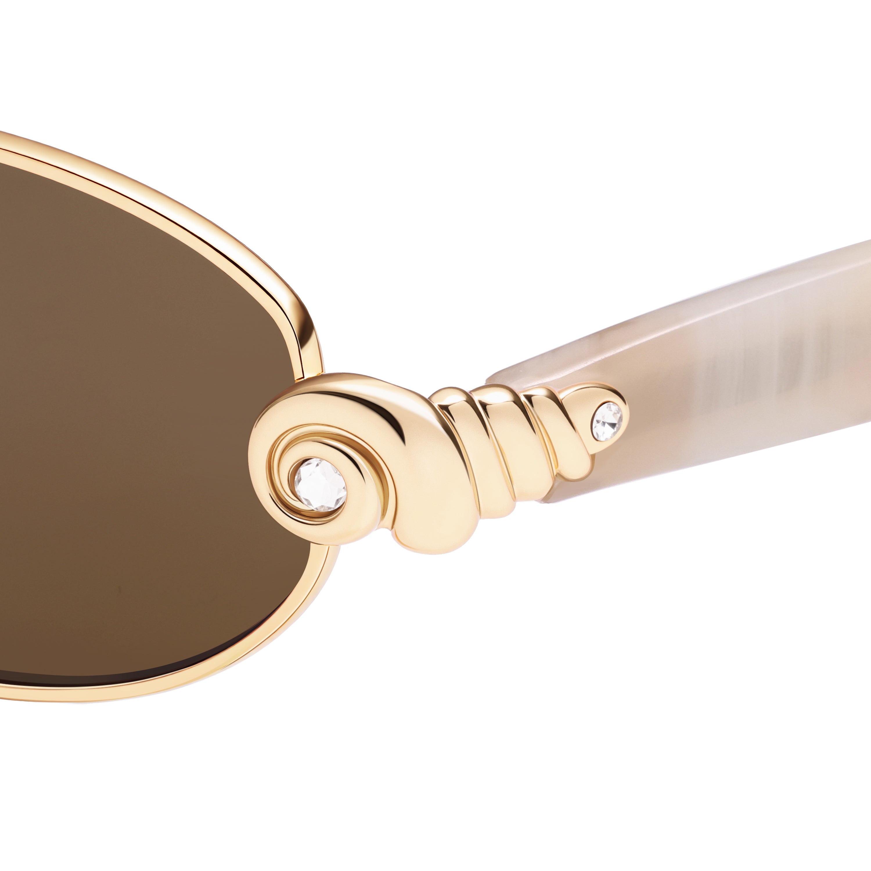 - 3D shell-inspired stud inlaid in temple
