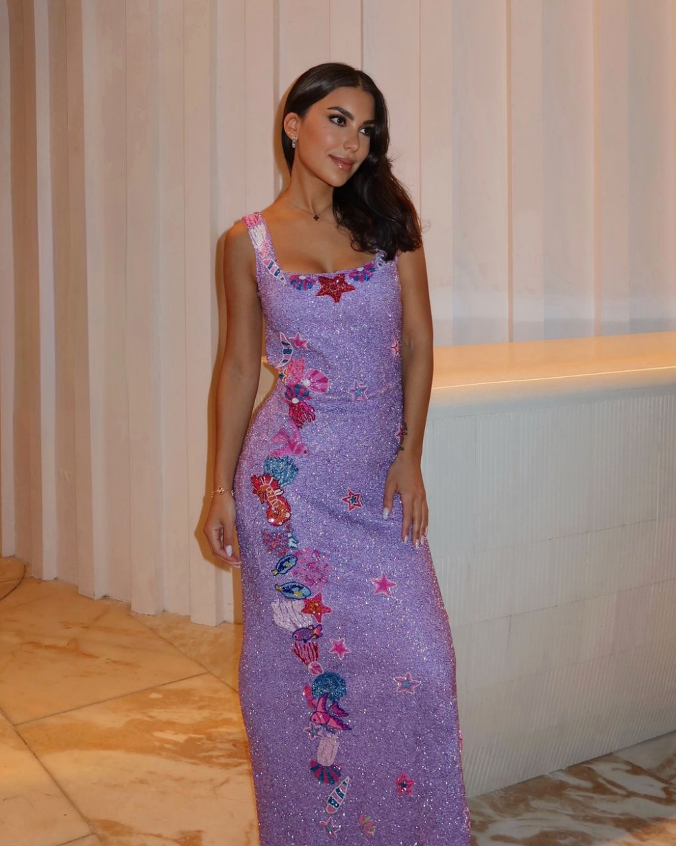 The Coral dress is a stunning, floor-length gown inspired by the beauty of the Red Sea. It features a soft lavender hue evoking the colours of a sunset over the sea. The design is adorned with intricate, hand-sewn embellishments that depict marine life — seashells, starfish, coral, and fish.