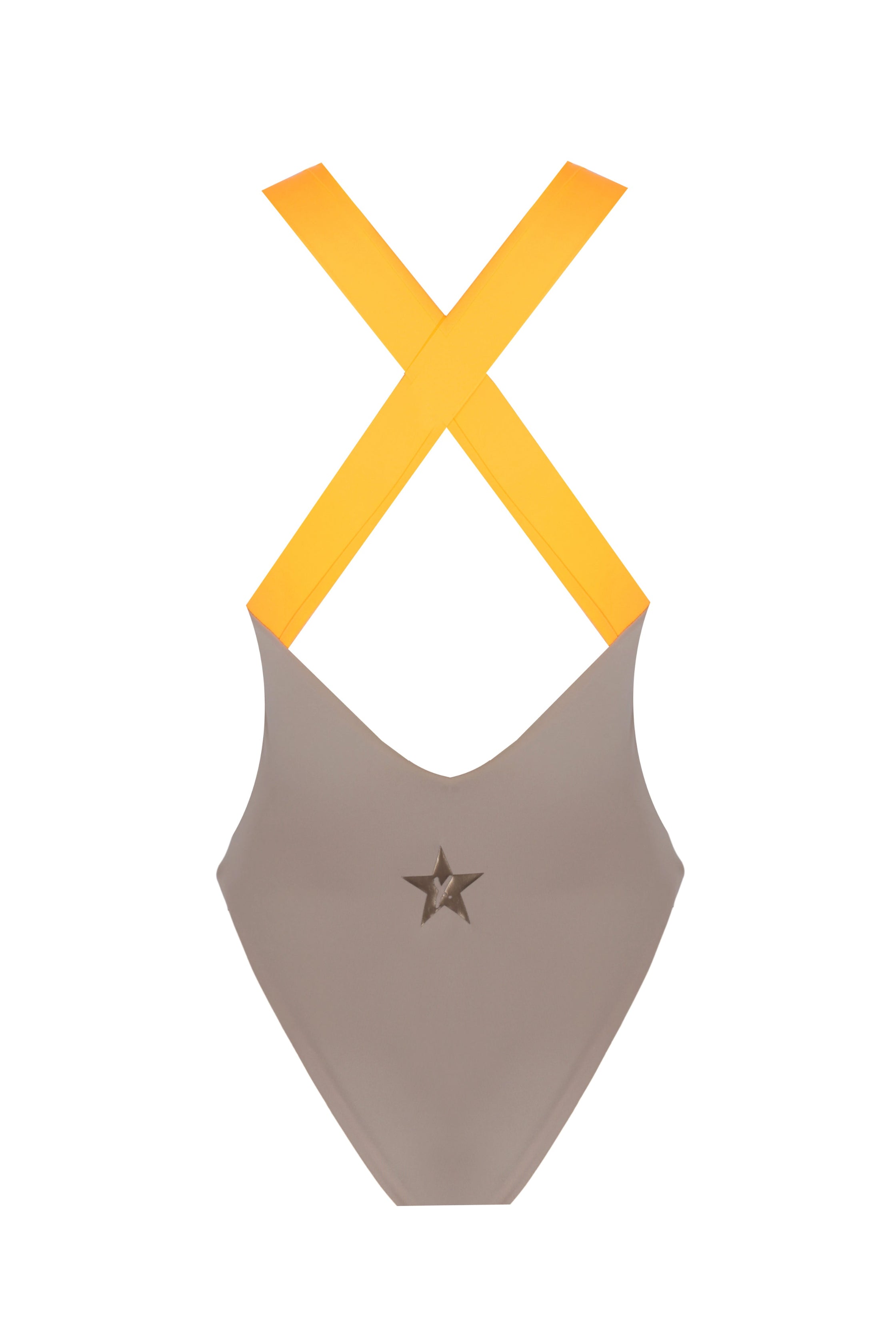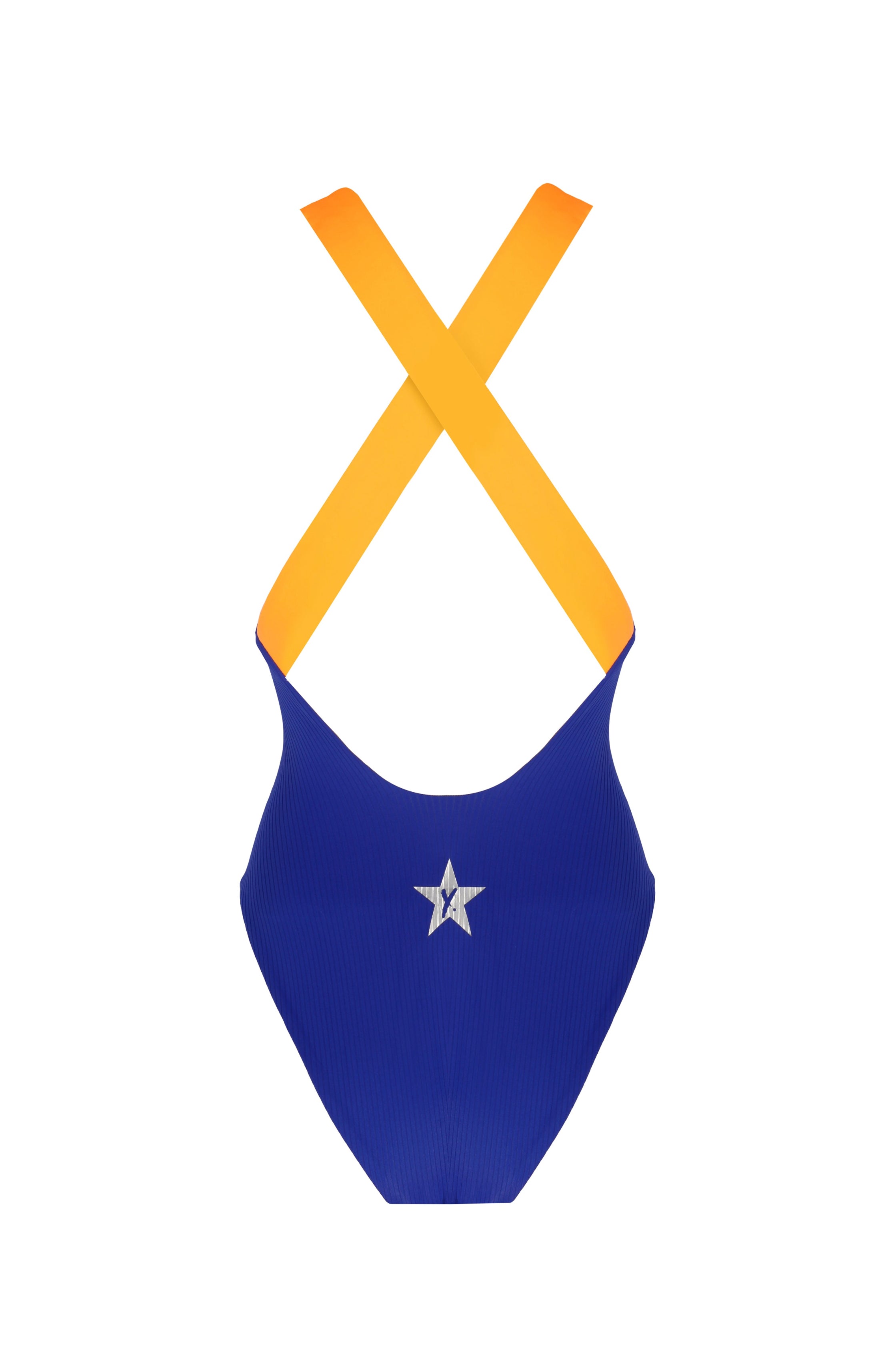 We combined our reversible, cross-back Olympia swimsuit in midnight blue and stone color with papaya! We brought together the most popular colors of the past summer seasons in a single piece for you.