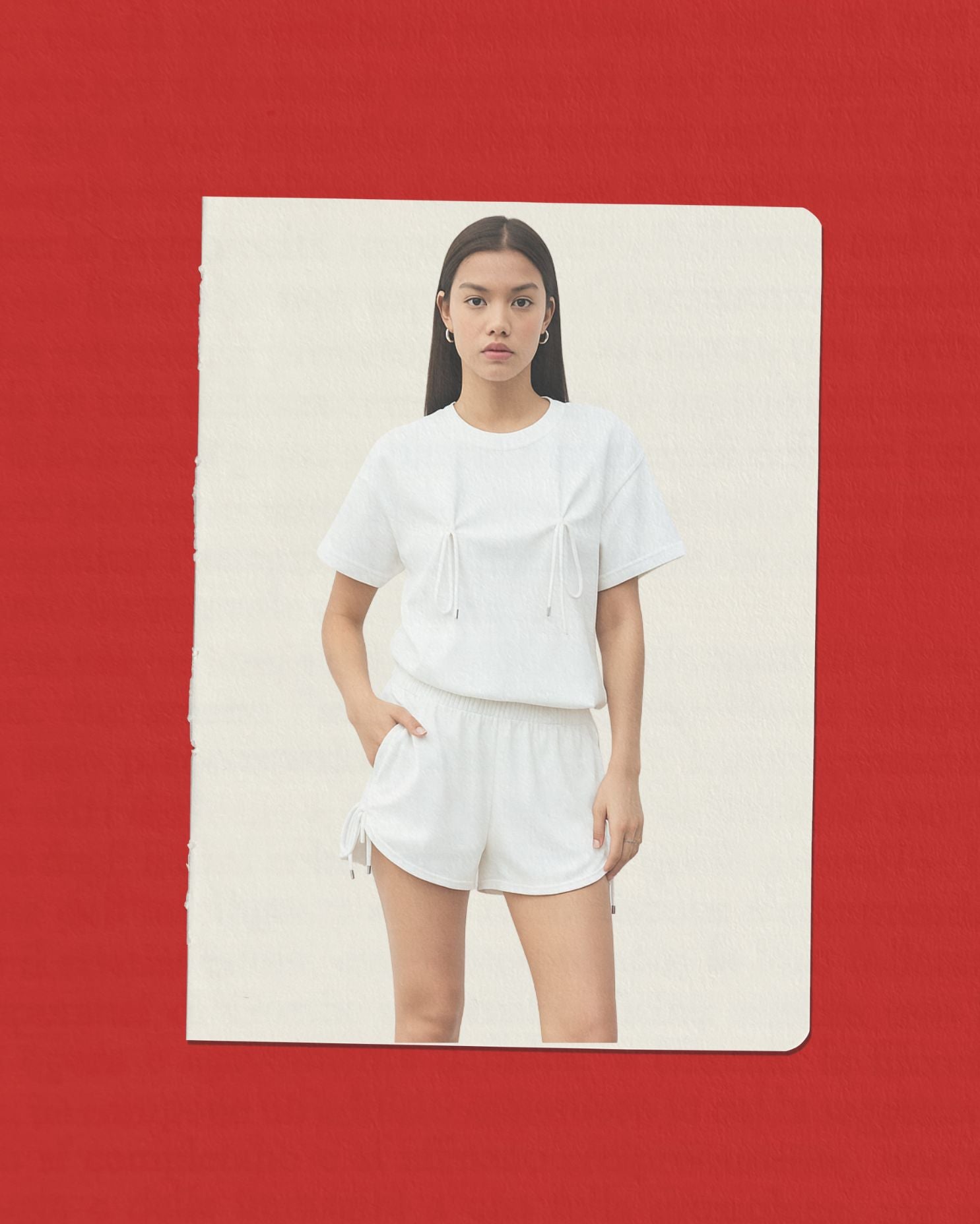 If you want a different T-shirt, here it is. A 100% cotton T-shirt, which comes in white, light and loose. With two hanging links that give it a modern and peaceful vibe at the same time. With this T-shirt you can also make your sporty and classic combinations.