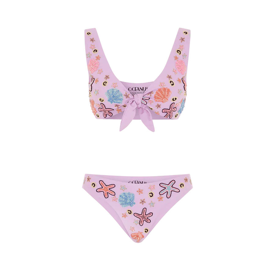 Discover dreamy resort vibes with the Orla Tie-in-the-Middle Bikini Top in Lilac, hand-embroidered with enchanting under-the-sea shell motifs. Crafted from eco-friendly luxury Italian Lycra, this designer bikini top features a feminine tie-front detail and supportive thick straps. Perfect for tropical getaways, luxury beachwear, and summer pool parties, Orla brings a playful yet sophisticated Oceanus touch.