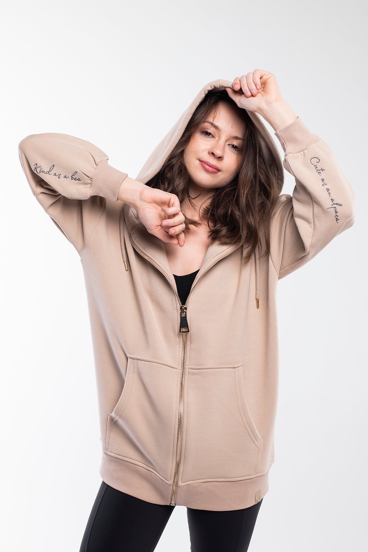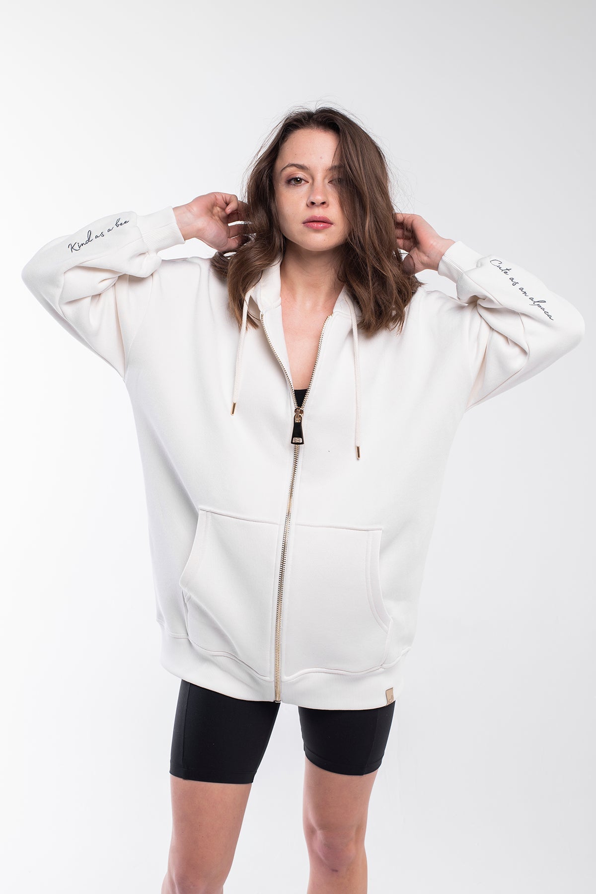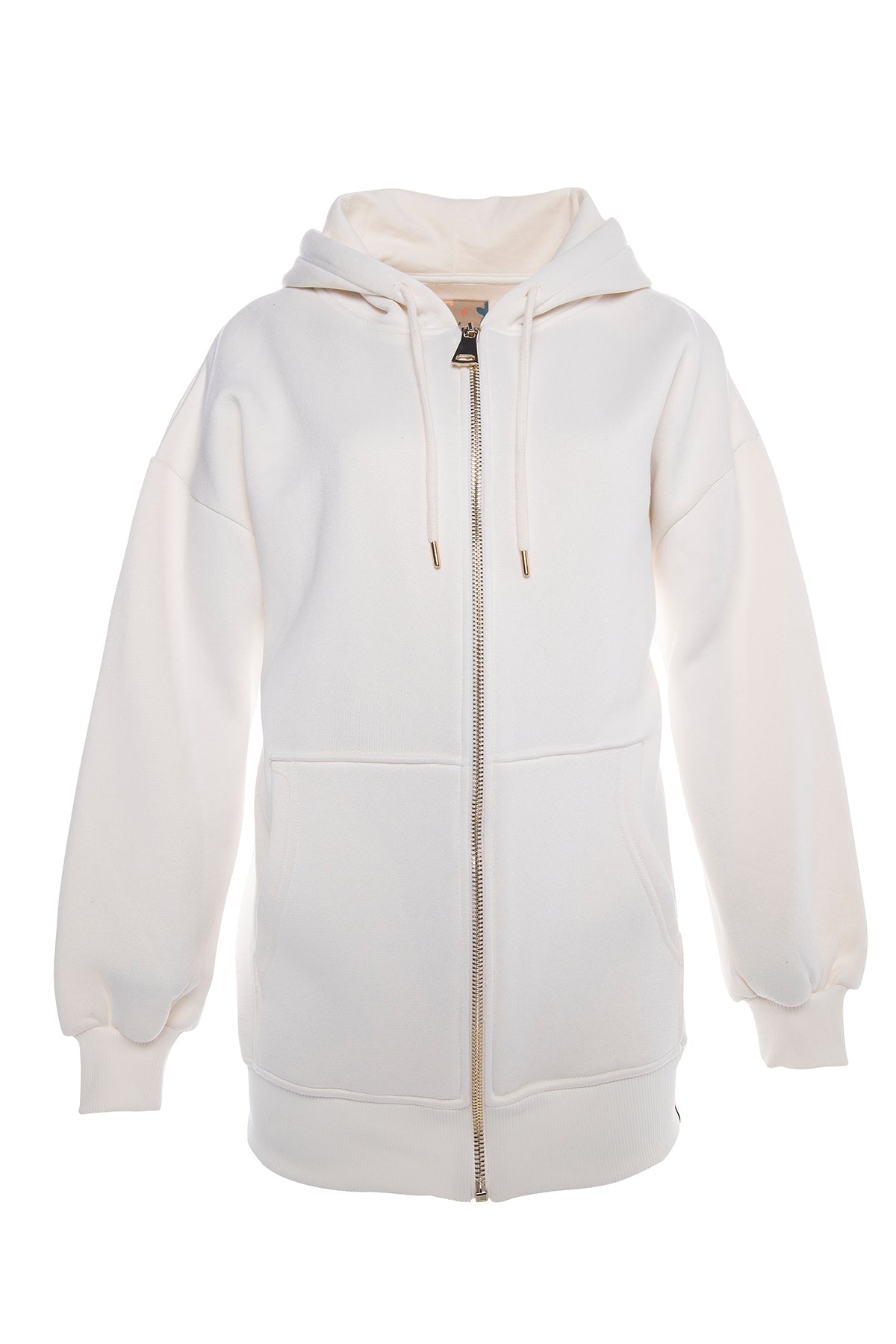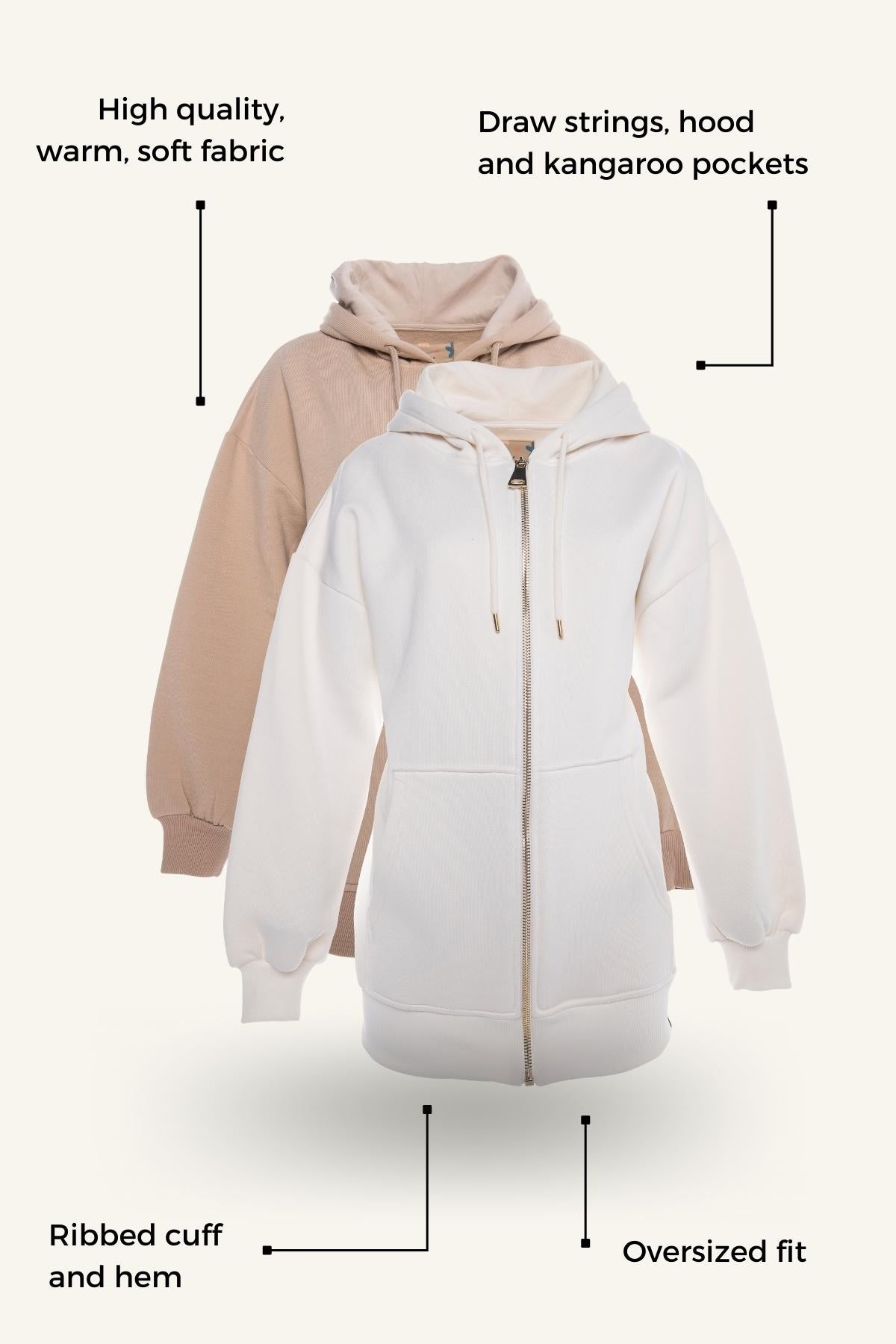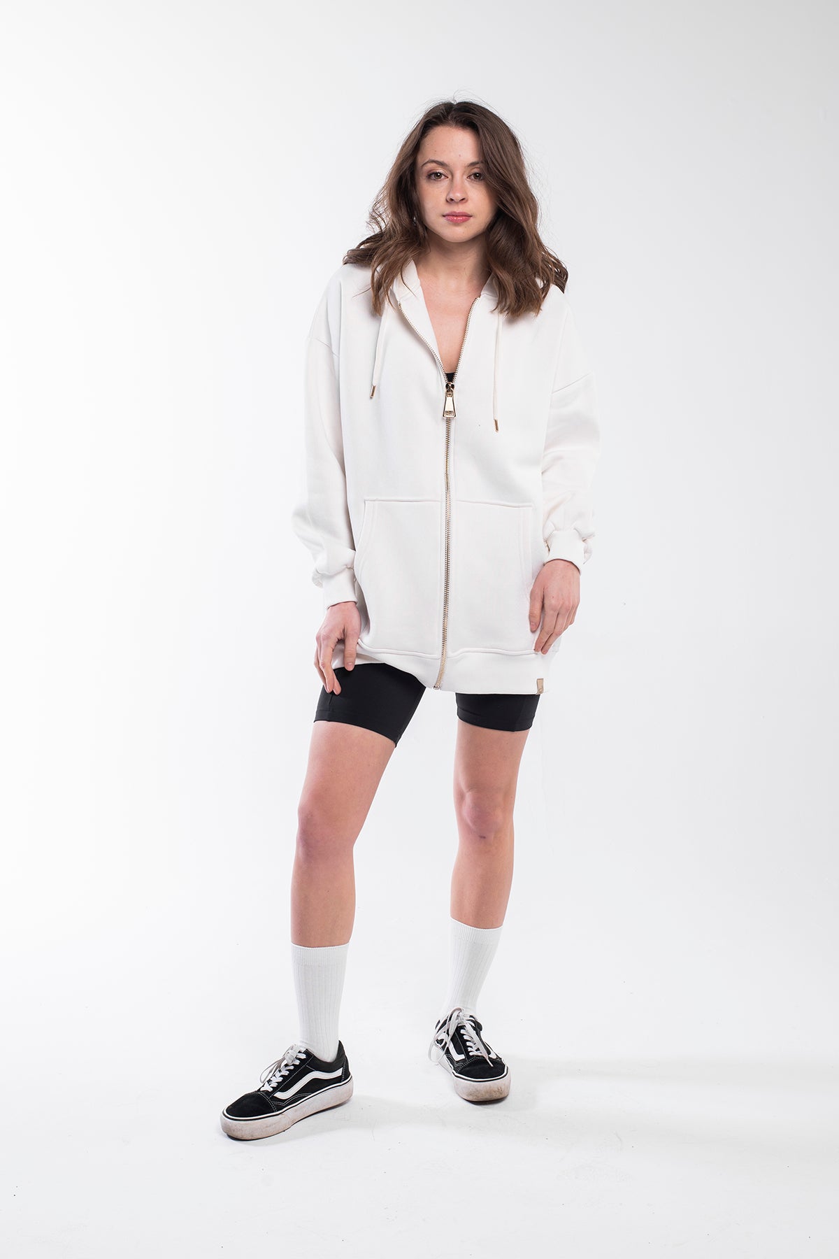 Oversized hoodie with a lined drawstring hood, front zip and kangaroo pockets for keeping your stuff secure. It has a relaxed design with dropped shoulders and long sleeves.