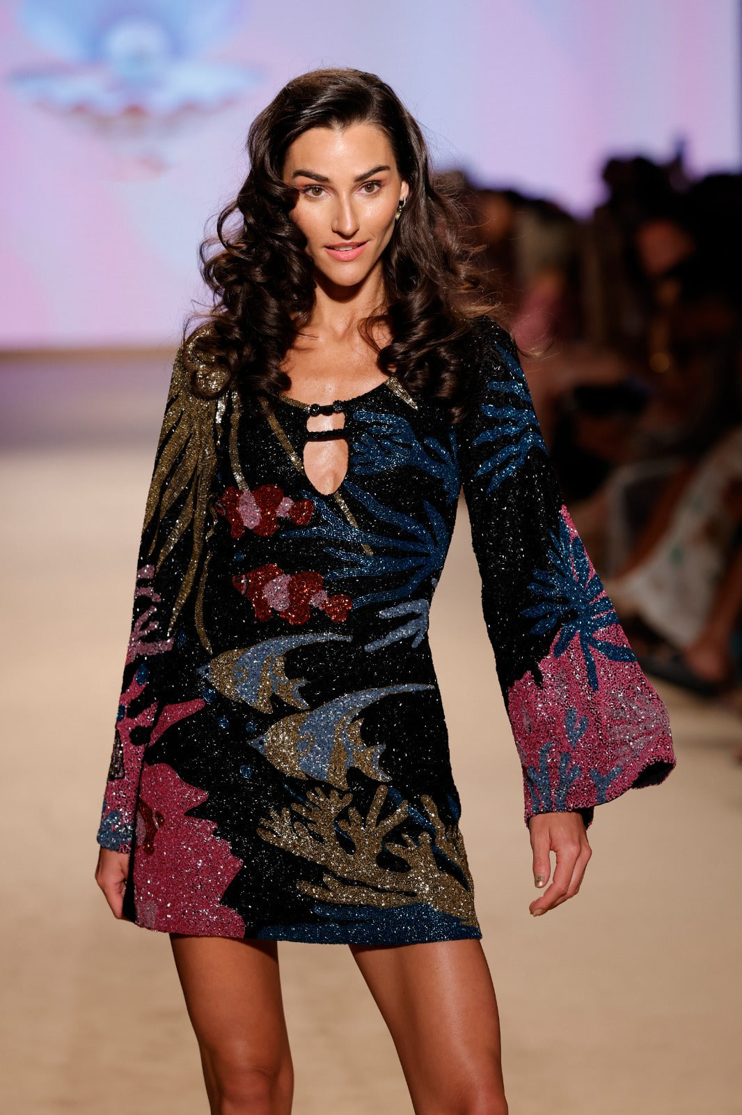 This Oceanus mini dress is a dazzling statement piece, crafted with a black base and adorned in shimmering glass beads that capture the essence of the ocean. Featuring intricate motifs of golden coral, vibrant tropical fish, and lush floral patterns in pink, red, and blue, it radiates bold glamour. The dress is designed with long, flared sleeves and a fitted silhouette, while a front cut-out detail with two delicate straps adds a modern, sensual edge. True to Oceanus’ signature style, this piece merges luxury craftsmanship with a playful, ocean-inspired aesthetic, perfect for evening occasions or making an impact on the runway.