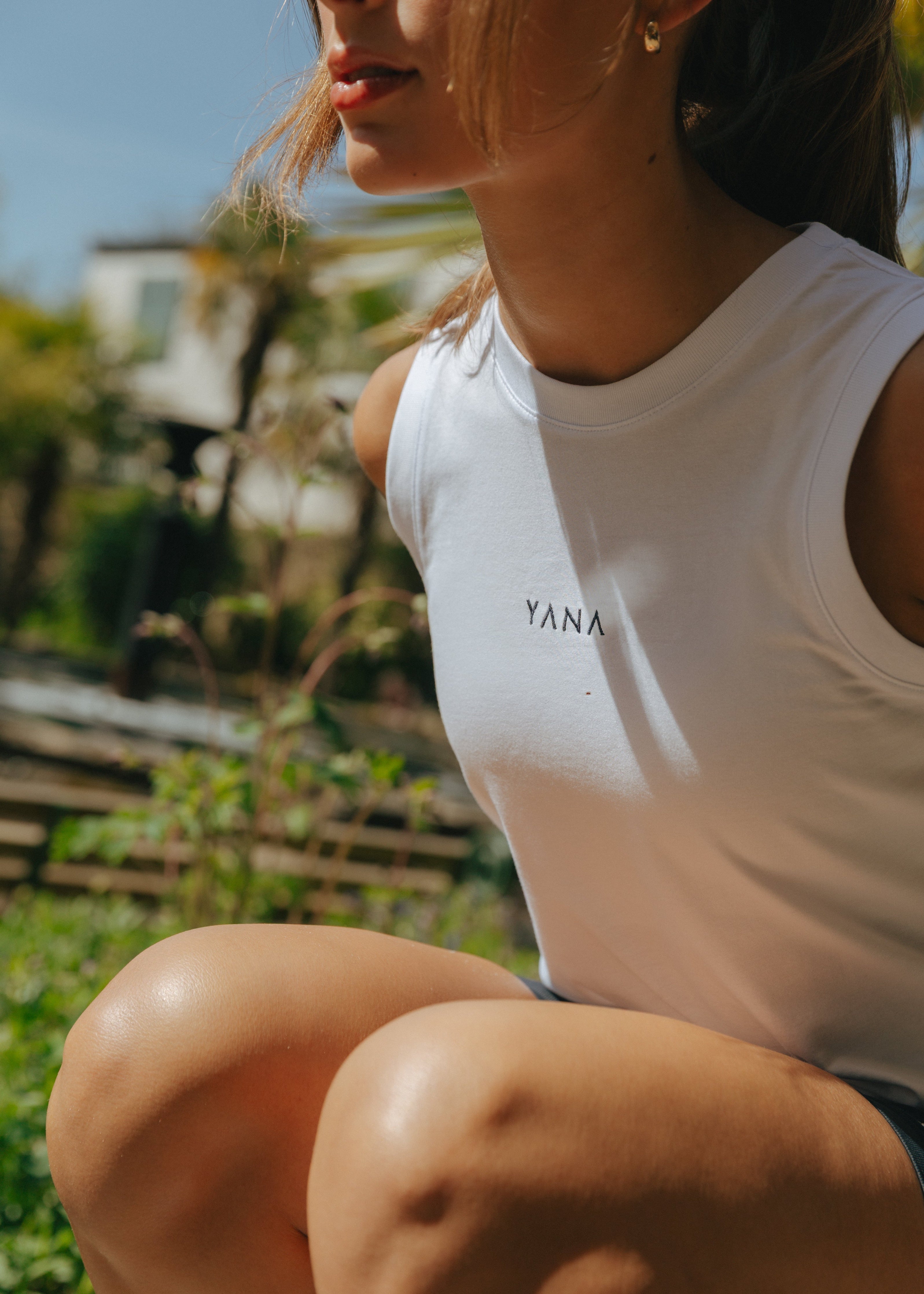 This Palmaire White Vest combines a fresh, crisp white hue with elegant navy blue YANA embroidery for a refined look. Crafted from 100% Organic Cotton, it offers a fitted silhouette that flatters your shape while providing natural sweat-wicking comfort. The super soft fabric ensures breathable wear, making it an ideal choice for both active and casual wearing.
