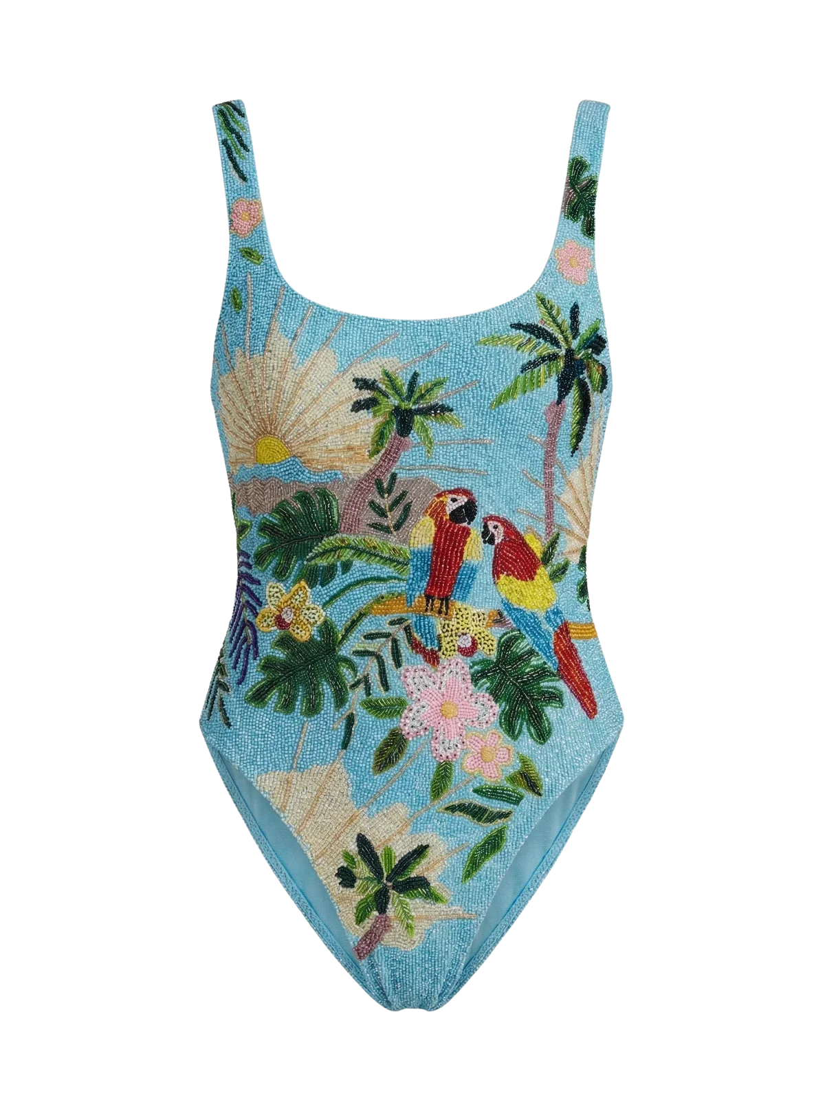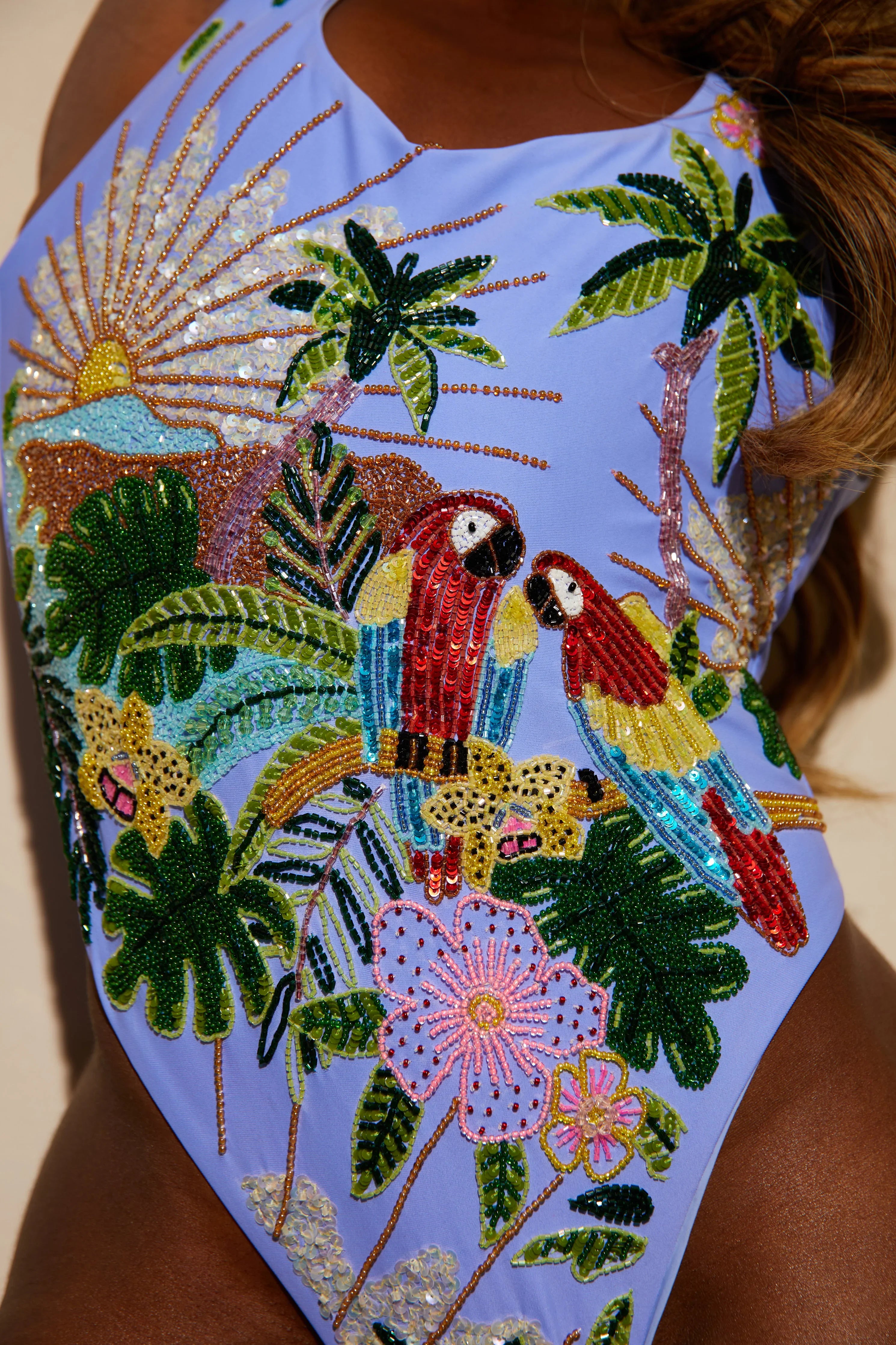 Indulge in the ultimate blend of elegance and tropical allure with this hand-beaded swimsuit. Meticulously crafted with intricate, luxurious beadwork, it features a captivating tropical design that exudes sophistication. Each bead is carefully placed to create a stunning, textured effect, ensuring you stand out in style. Perfect for those who seek refined glamour by the water, this swimsuit is the epitome of high-end beachwear.