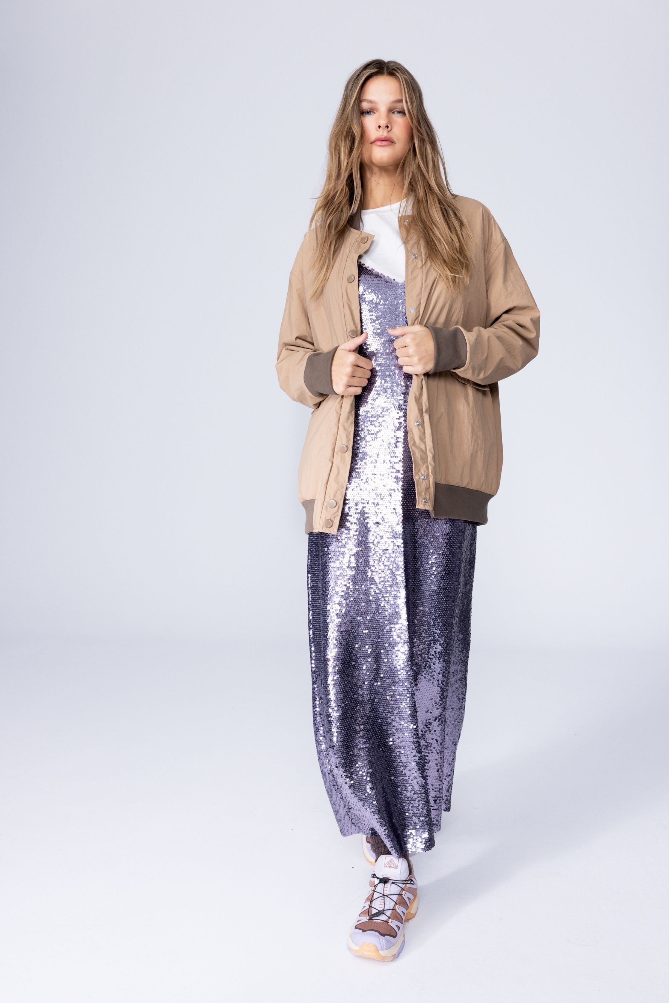 The Parachute Reversible Bomber, made of parachute fabric with a distressed effect and water-repellent properties, combined with a thick cotton lining, offers a versatile outerwear option that will be indispensable in every season. It features pockets on both sides and snap buttons that can be used on either side.