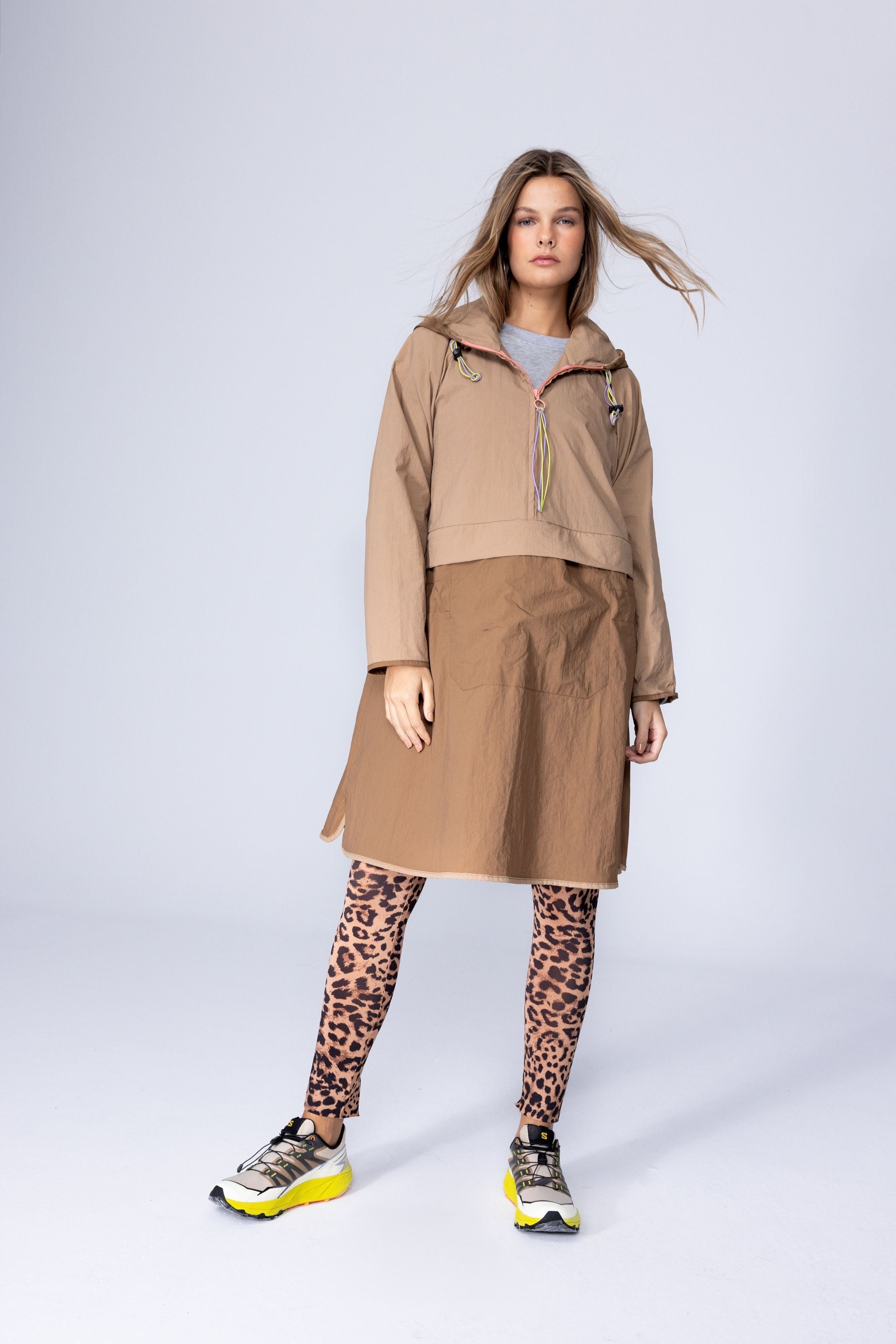 Our windbreaker, which can be worn as a long or cropped design, is now available in our new color. Featuring a hidden zipper on the body, it separates into two pieces, offering a cropped wearing option. It also includes a kangaroo pocket at the front. The hood and back waist have adjustable drawstrings.