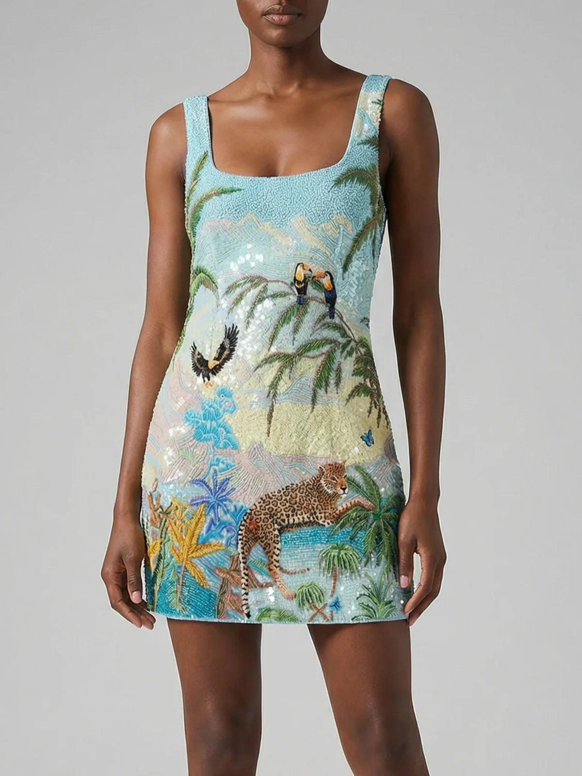 Escape to exotic elegance with this striking beaded mini dress, inspired by safari sophistication. Crafted in a rich blue hue, this piece features intricate hand-applied beadwork that catches light with every movement. The mini silhouette offers a modern, flattering cut perfect for resort wear, evening events, or statement-making occasions. Luxurious detailing and premium construction make this a versatile investment piece that transitions seamlessly from day to night. Pair with strappy heels and minimal jewellery to let the beadwork shine.