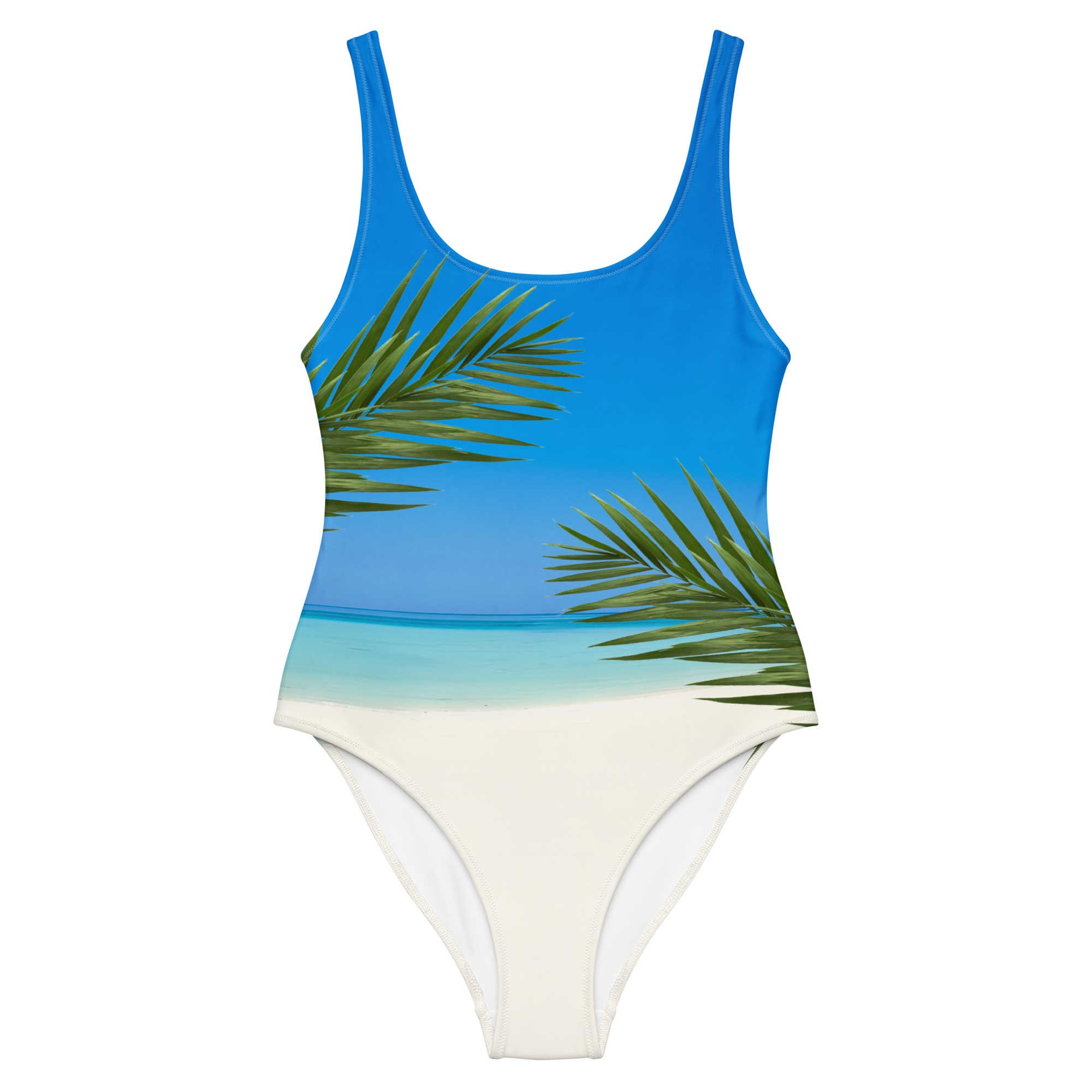 Blue sky, white sand, palm leaves. The whole beach printed on the suit.