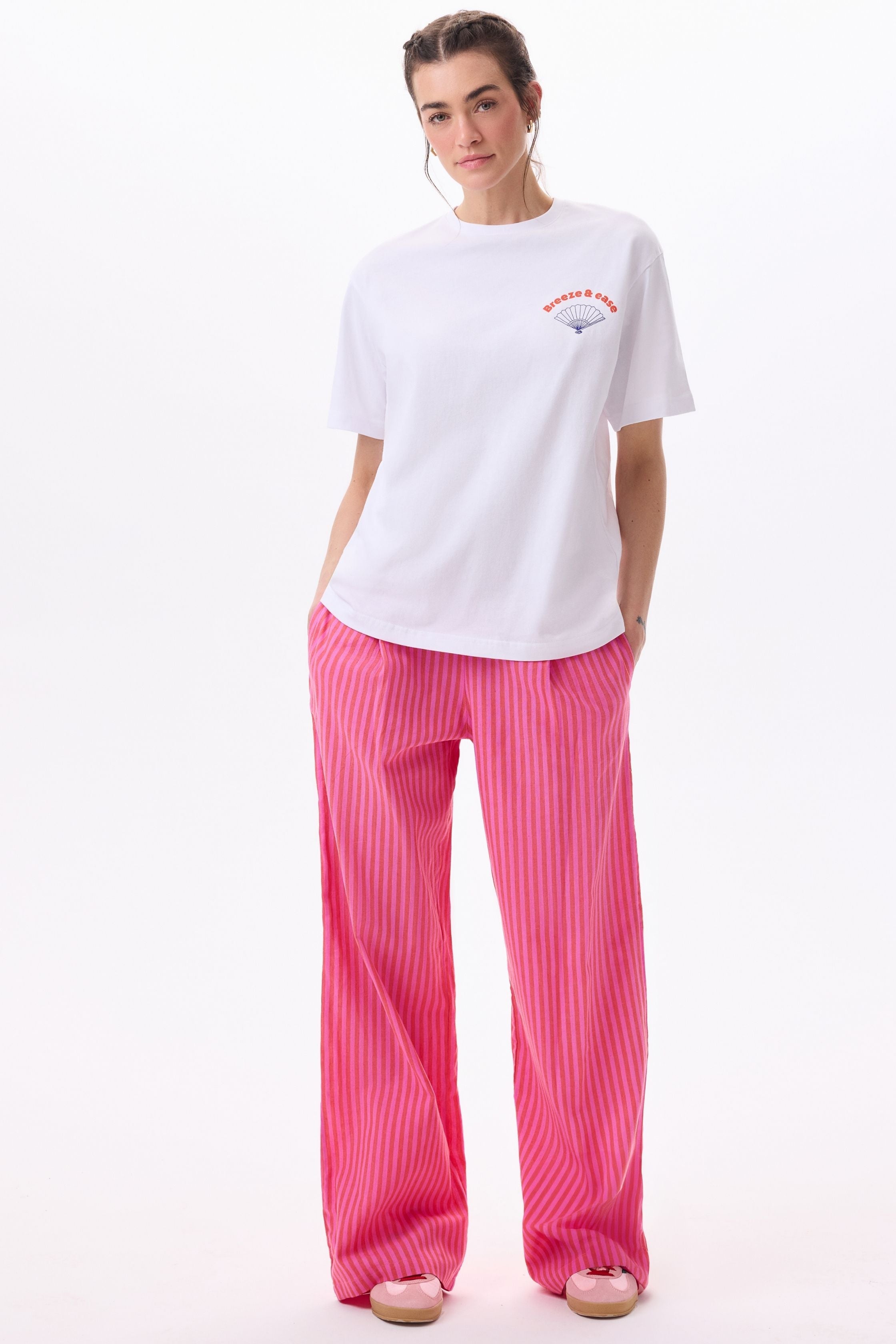 A slightly oversized, crew neck, 100% cotton BREEZE / PICNIC t-shirt. It is in an off-white tone. It features a vibrant fan print on the front and a picnic blanket print on the back. We had a lot of fun creating this sweet design, and we hope you wear it with joy.