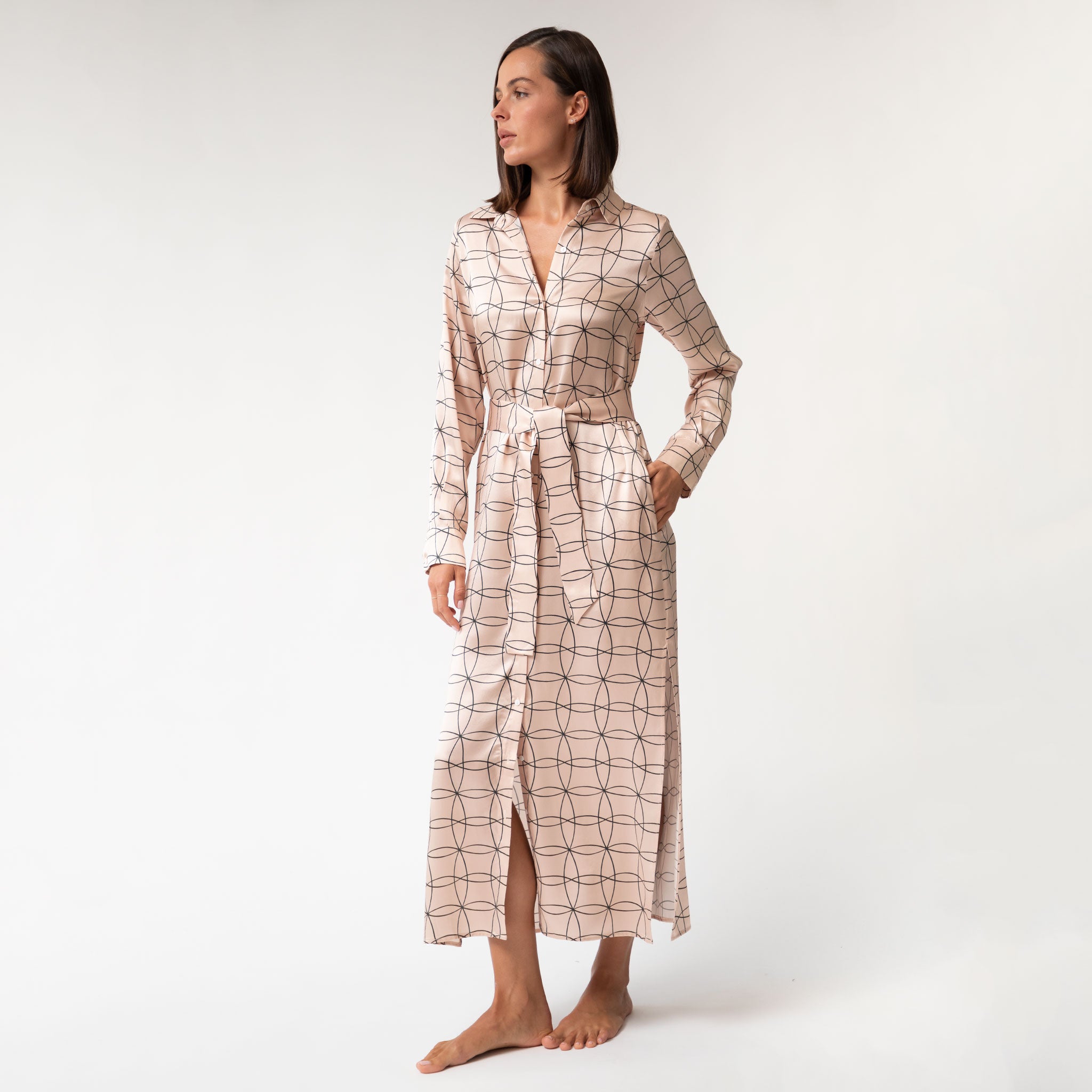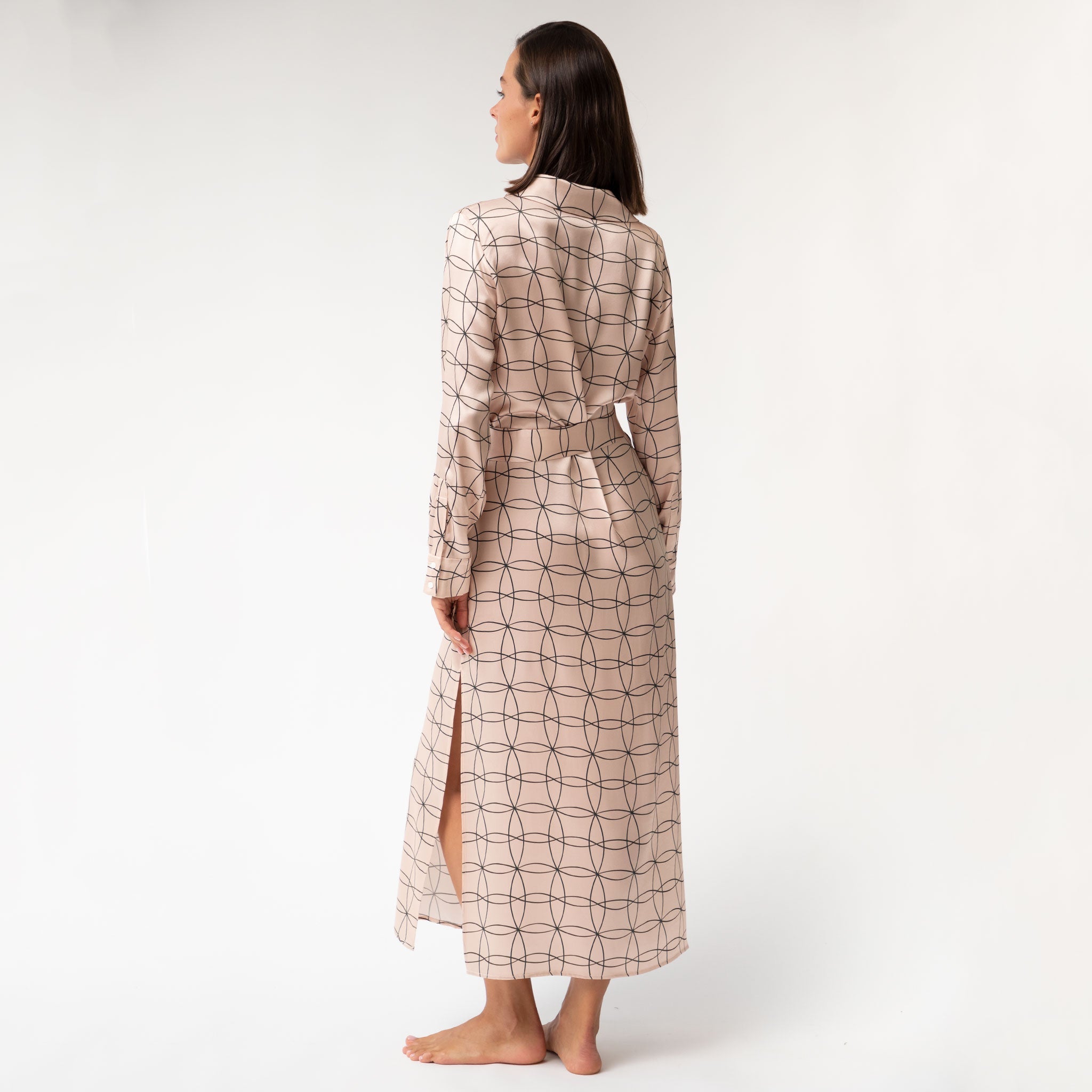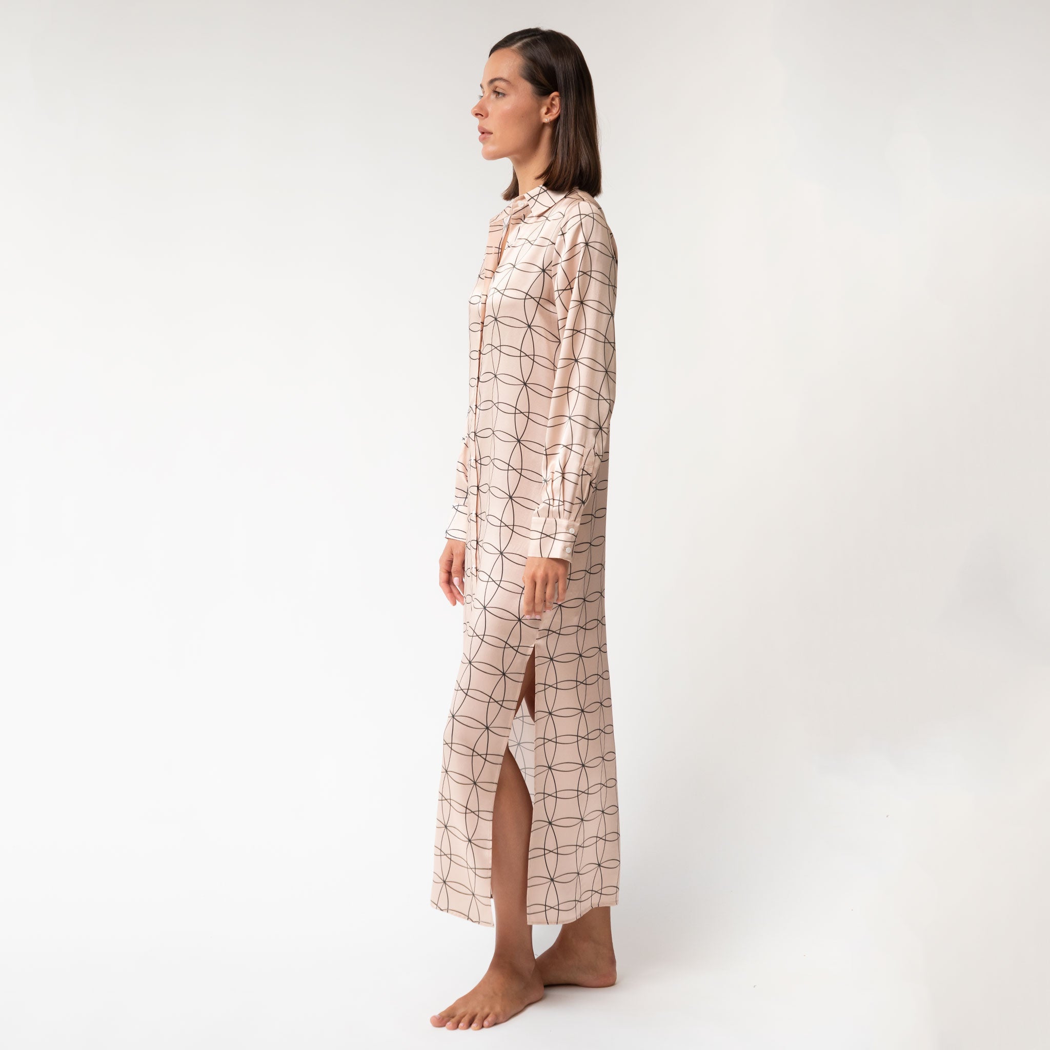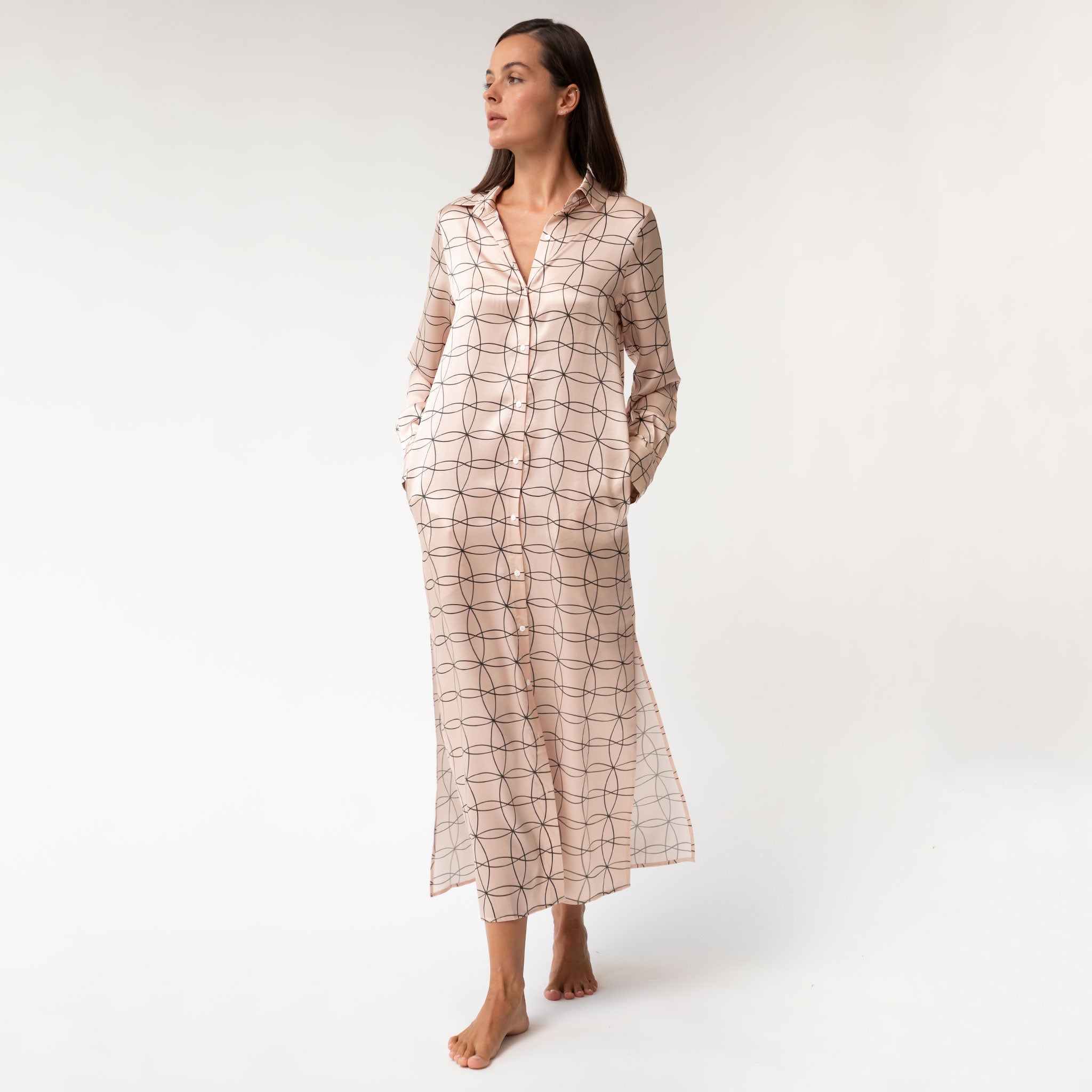 The Neo Geo Silk Long Shirt Dress is designed from 100% washable Mulberry Silk, offering both luxury and practicality. The print’s fixed placement ensures a consistent and striking design, while the button-down front provides a touch of timeless elegance and comfort. Designed for a slim fit, if you prefer a looser fit, consider sizing up.