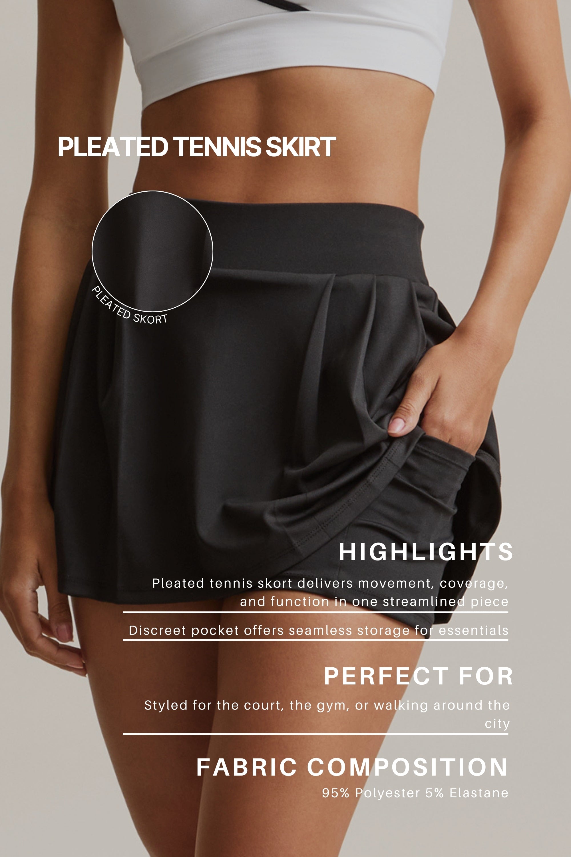 Blending sport and streetwear, this pleated tennis skort delivers movement, coverage, and function in one streamlined piece. Designed with concealed built-in shorts, it guarantees confidence in every step—no unwanted flashes. A discreet pocket offers seamless storage for essentials, while 3M reflective silicone branding adds a subtle performance edge. Whether styled for the court, the gym, or the city, this skort is built for versatility.