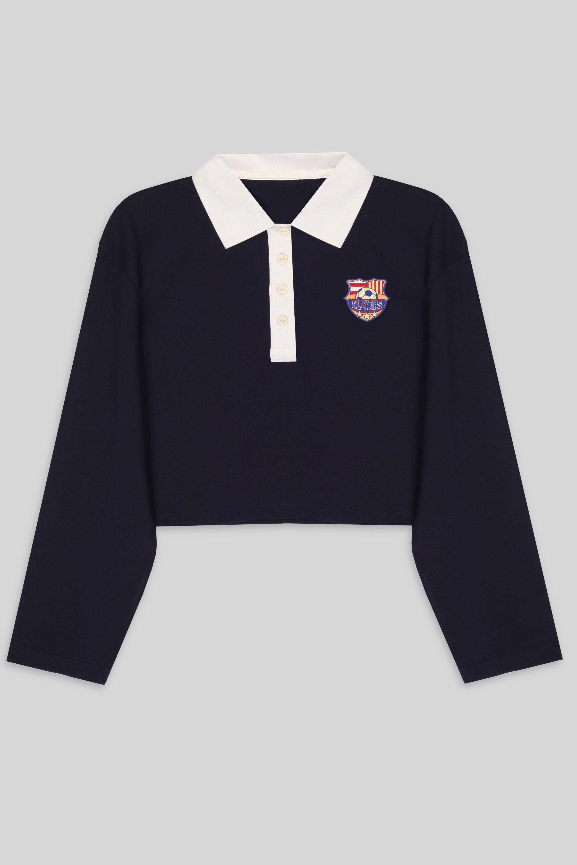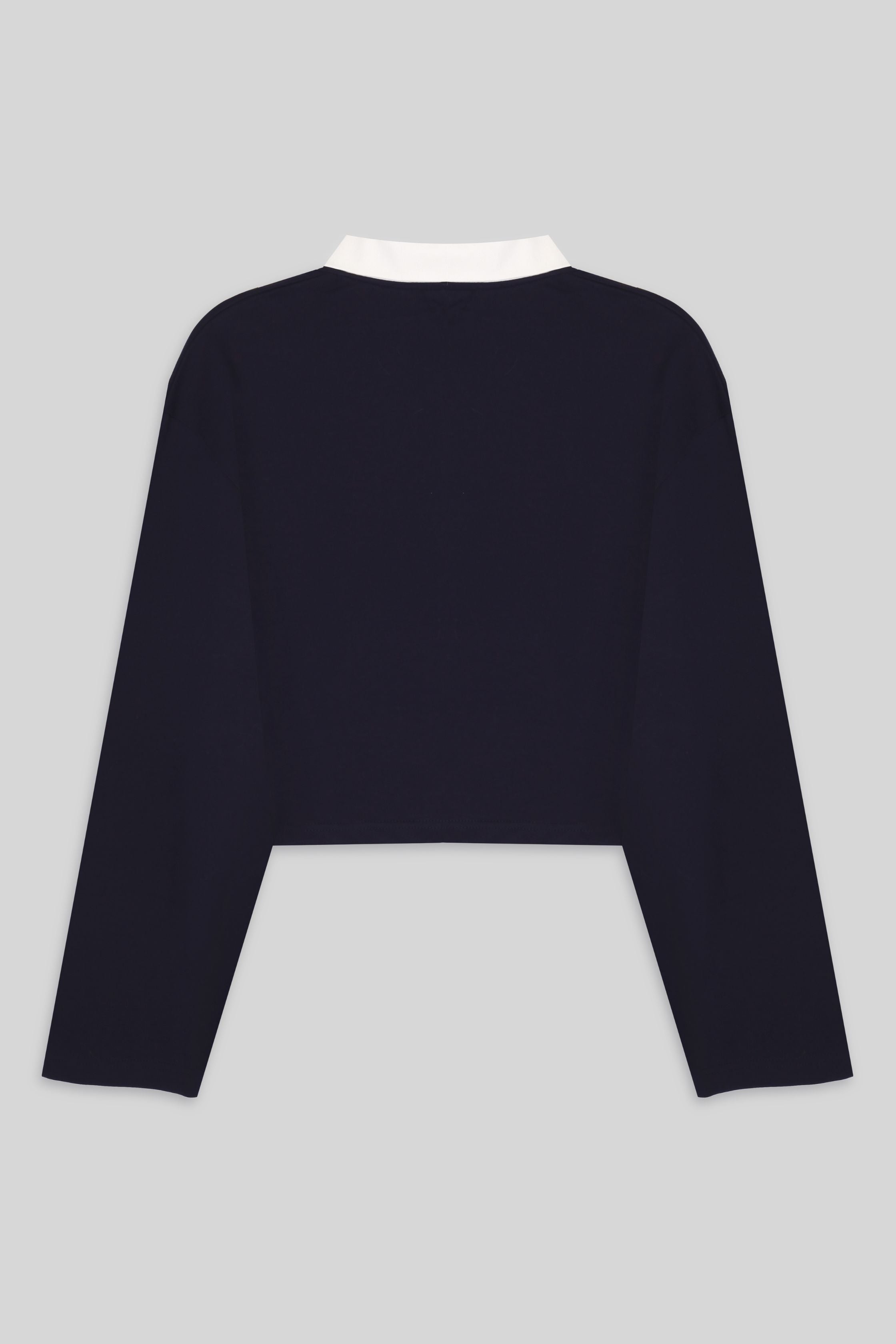 A polo-neck oversized cropped top with the ALLYORS emblem on the left chest. Made from 100% cotton, with a stretchy and structured fabric. The collar and front placket are in a crisp off-white color. It comes with an extra button. You can wear it as a second layer over a shirt, pair it with a skirt, or match it with our beloved Twist Pants model. This top can also be worn over your bikini or swimsuit at the beach.