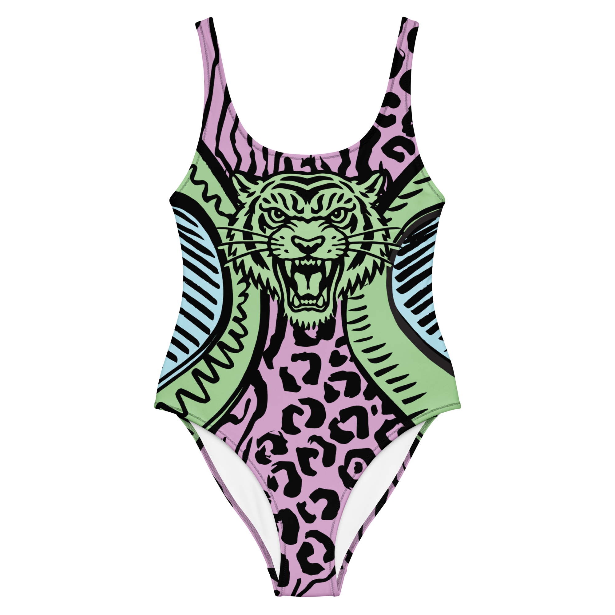 Leopard in pink. Tiger in green. Stripes in blue.