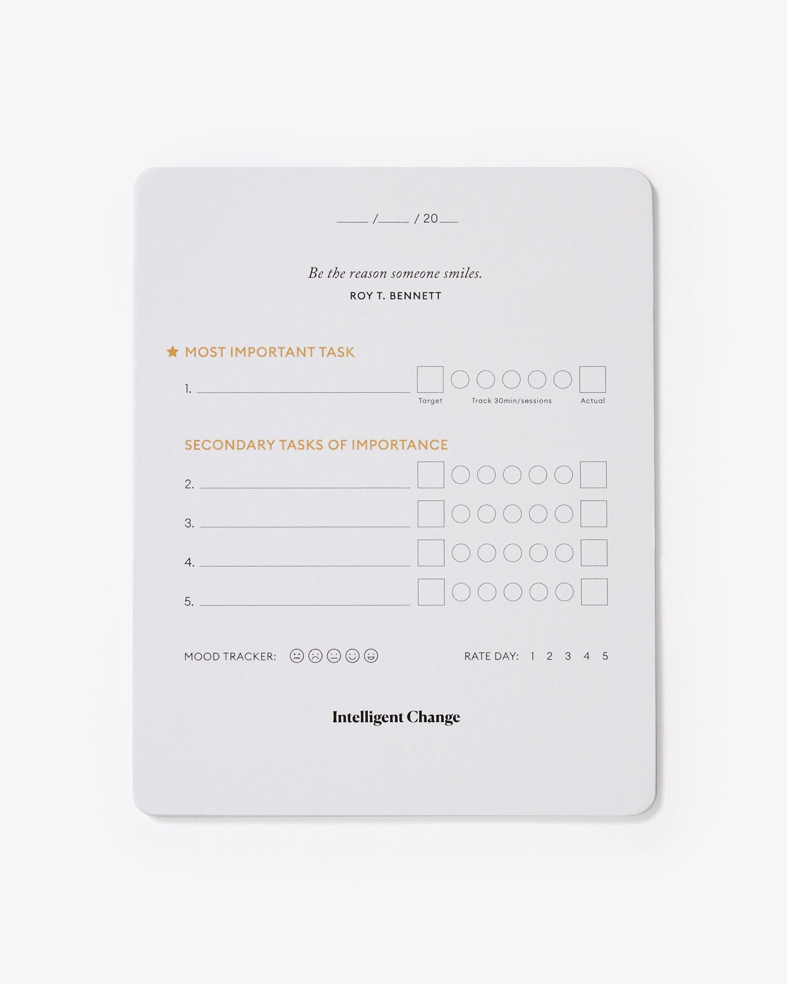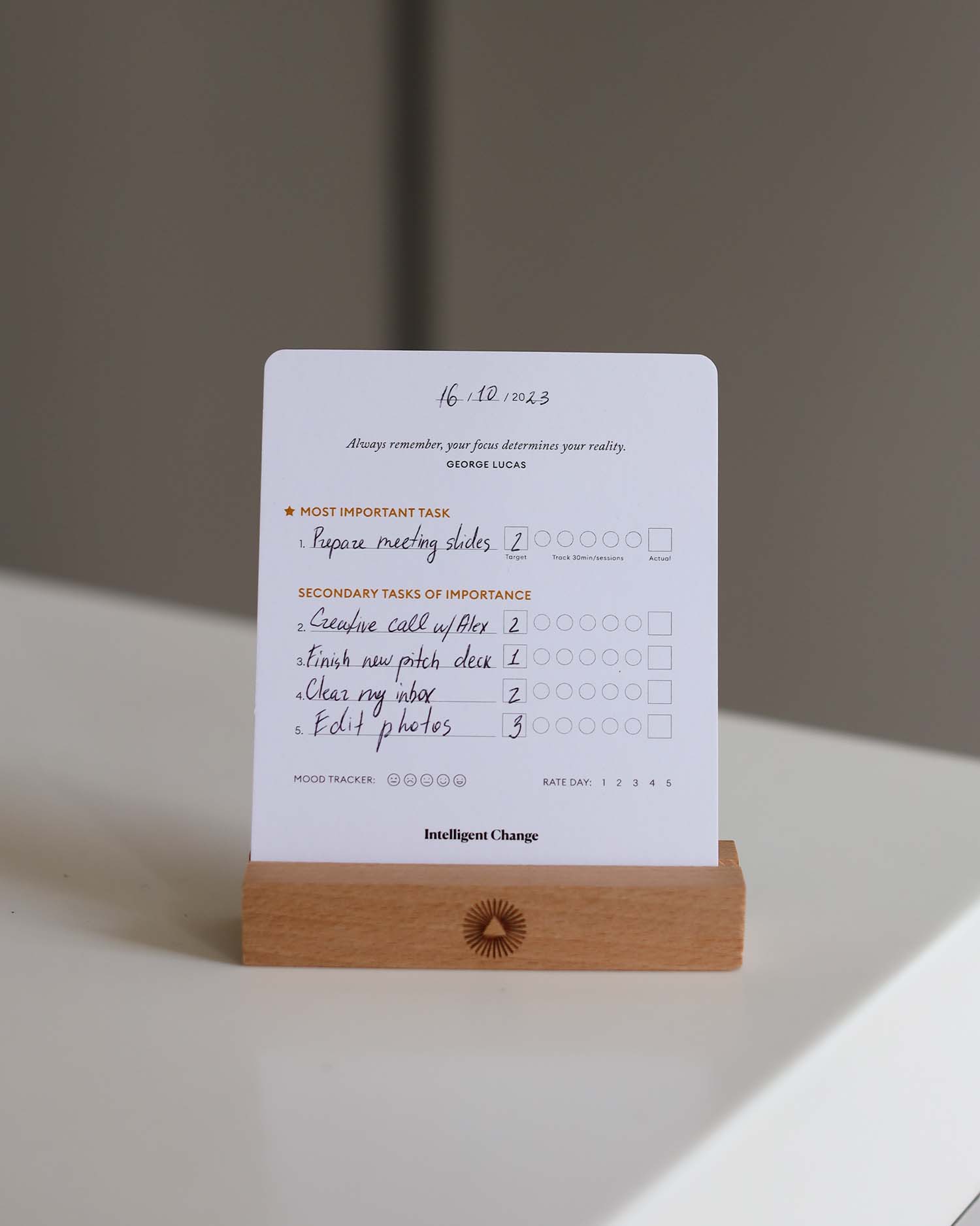 Beat procrastination with Productivity Cards. Display your priorities, use the Focus Time technique, and cultivate a positive mindset with inspirational quotes. Place the stand on your desk or near your workspace to keep today's priorities in plain sight. Ideal for visual learners and small workspaces. Includes 2 months of daily cards made from 100% recycled FSC paper and an FSC beechwood stand. Makes a perfect gift.