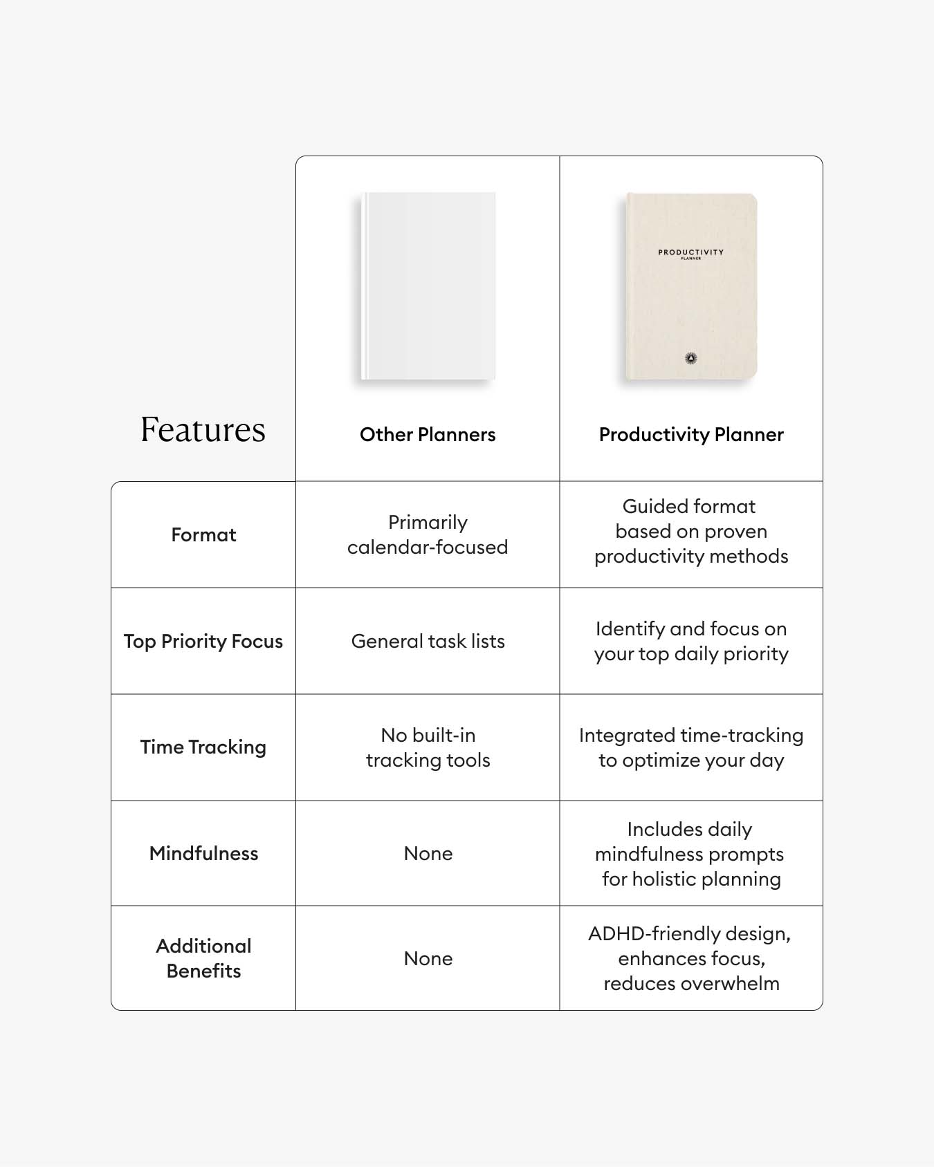 Beat procrastination and get more done in less time with The Productivity Planner. It's your personal coach guiding you to manage time effectively, achieve goals efficiently, and reflect on your growth. Ignite your productivity with The Productivity Planner. Lasts 3 months.