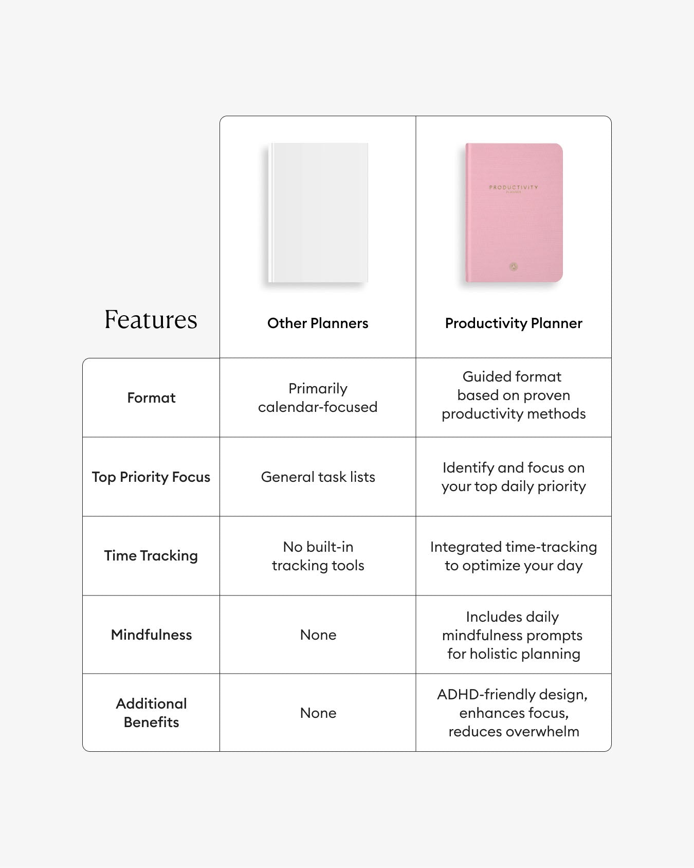 Beat procrastination and get more done in less time with The Productivity Planner. It's your personal coach guiding you to manage time effectively, achieve goals efficiently, and reflect on your growth. Ignite your productivity with The Productivity Planner. Lasts 3 months.