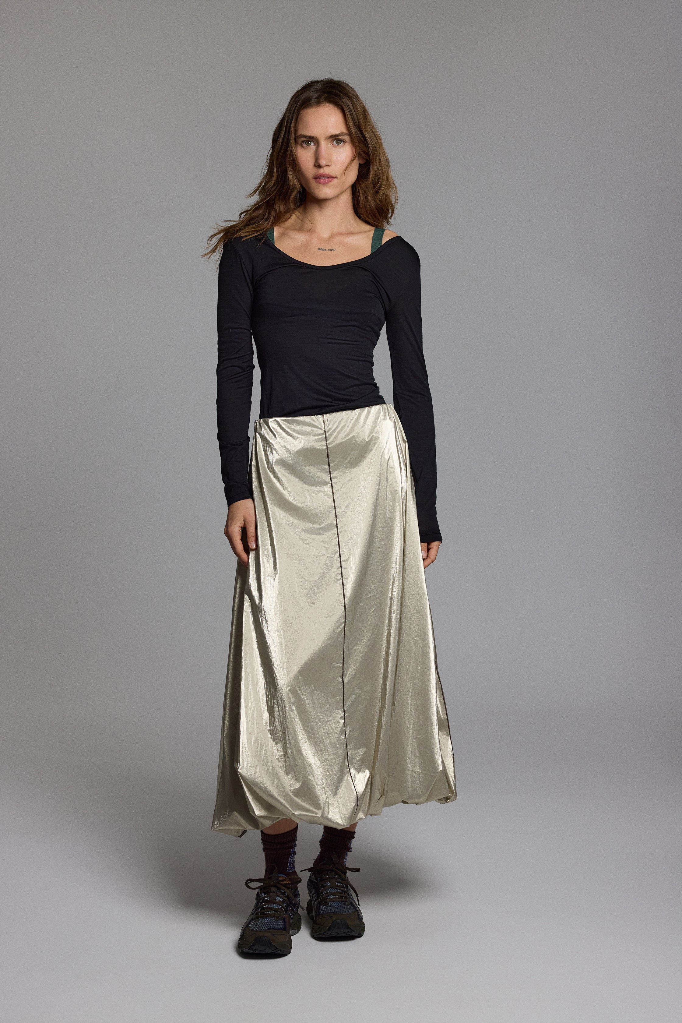 This shiny gold skirt brings together feminine elegance and sporty ease. Its lightweight textured fabric creates a fluid motion as you walk, while the modern cut offers a strong silhouette. Adaptable to any moment of the day, it can be worn effortlessly both in the city and for evening occasions.