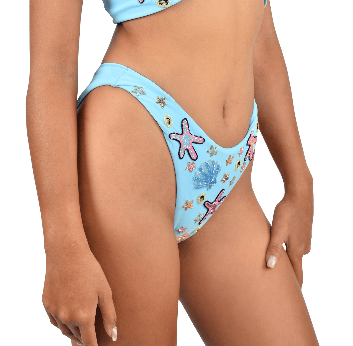 The Quinn Bikini Top in blue is a sustainable hand-embroidered swimwear piece made from eco-friendly Lycra. With tropical-inspired detailing and a comfortable slip-on fit, this luxury bikini top is ideal for beach escapes, resort lounging, and summer vacations.