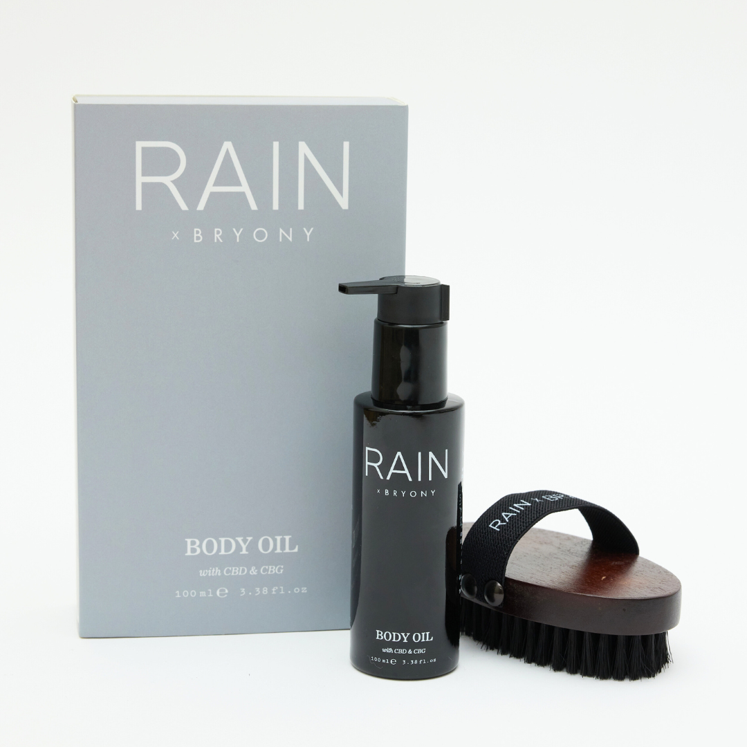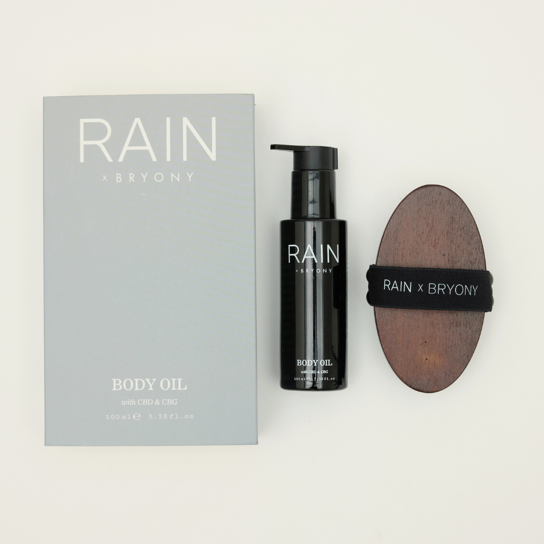 This is the CBG Body Oil and Dry Brush Set by RAIN x Bryony.