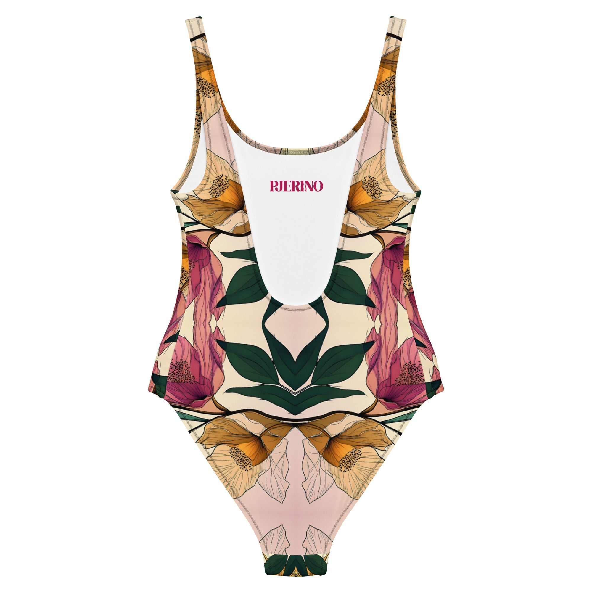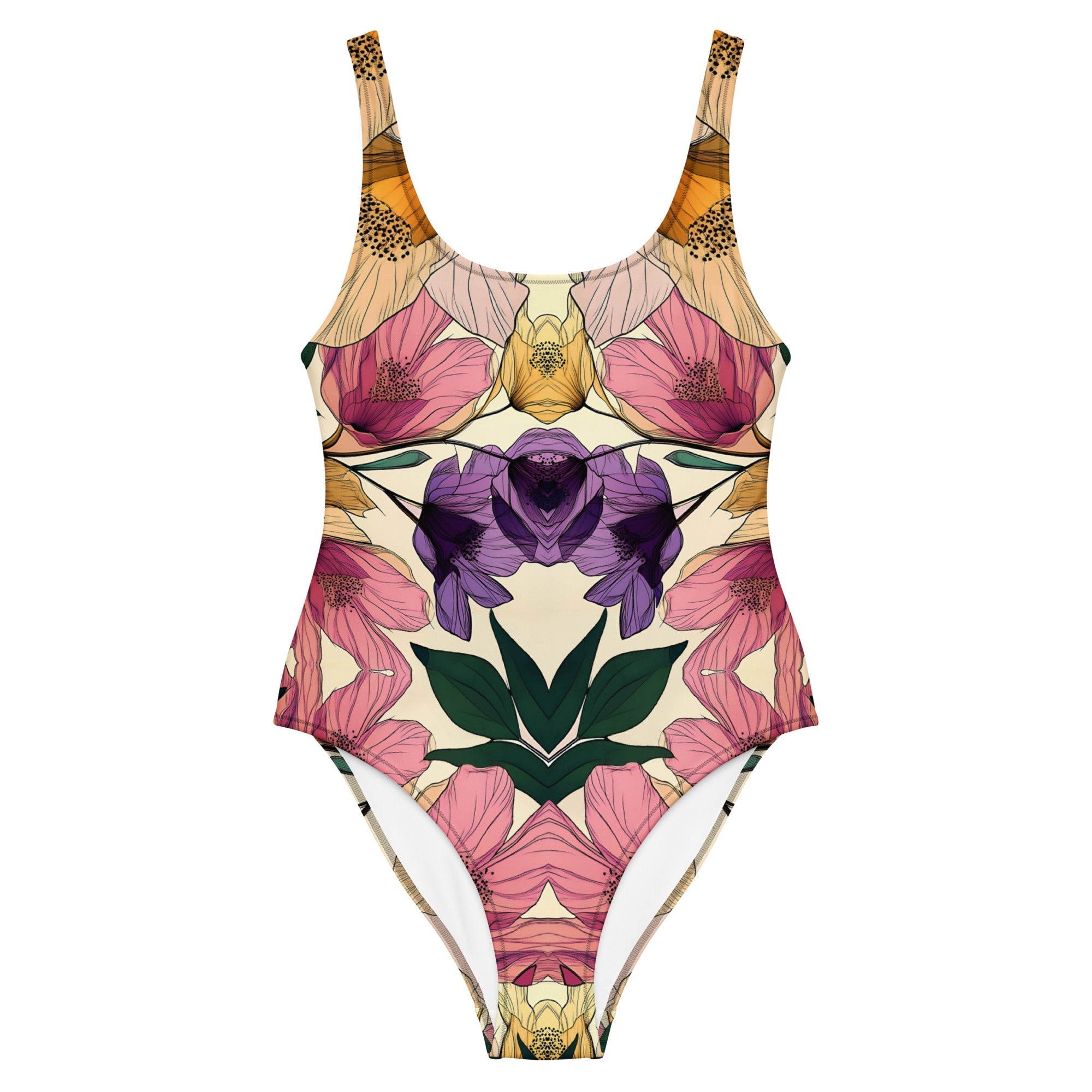 Step into timeless elegance with our Retro Floral Swimsuit, a design that blends feminine charm with striking symmetry. Featuring mirrored blossoms in deep purples, soft pinks, and golden tones, this swimsuit flatters and frames the body with effortless grace.