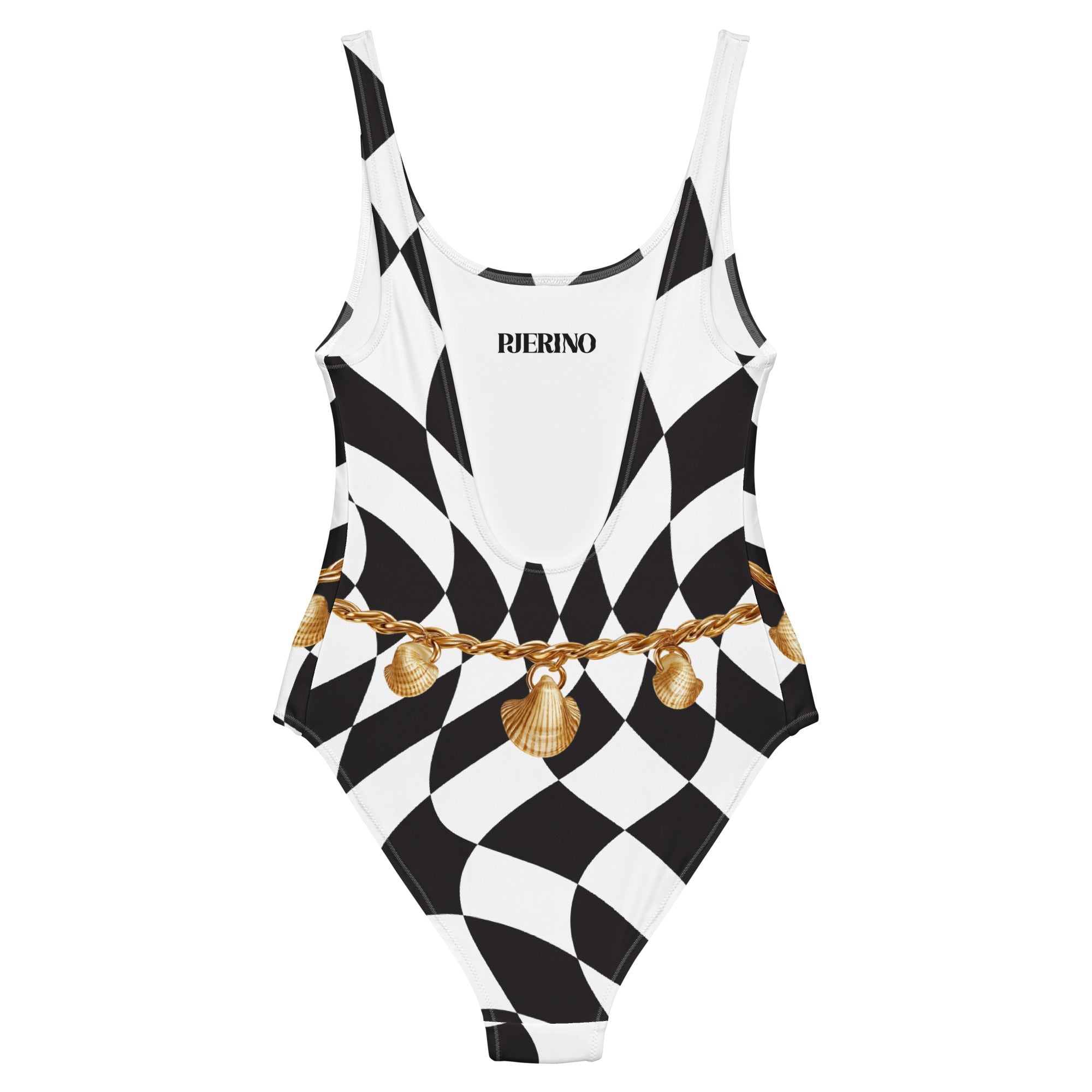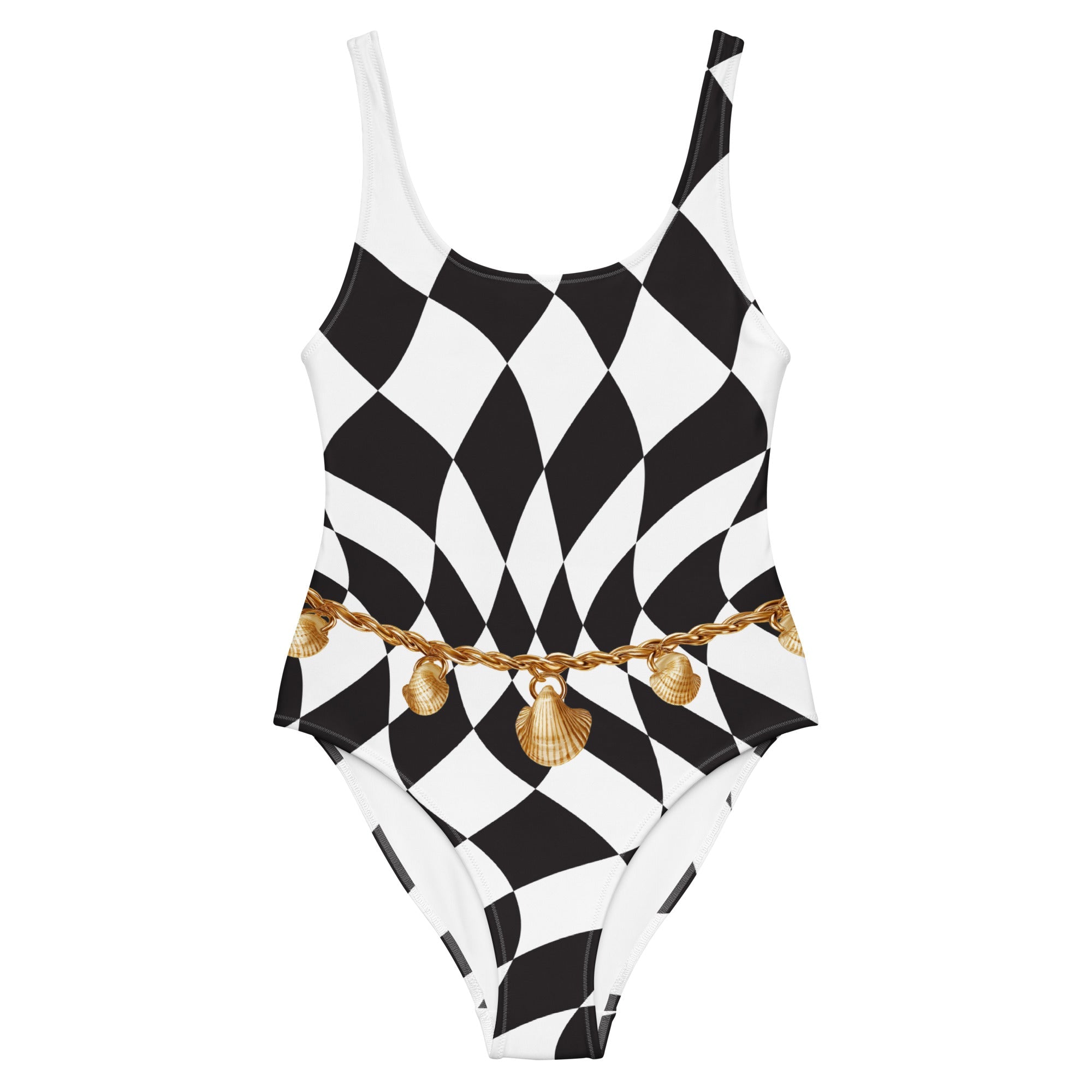 Step into bold elegance with our Retro One Piece Swimsuit, a statement design that fuses vintage charm with modern sophistication. Featuring a black-and-white harlequin pattern and an ornate golden shell belt print, this swimsuit transforms classic geometry into contemporary luxury.