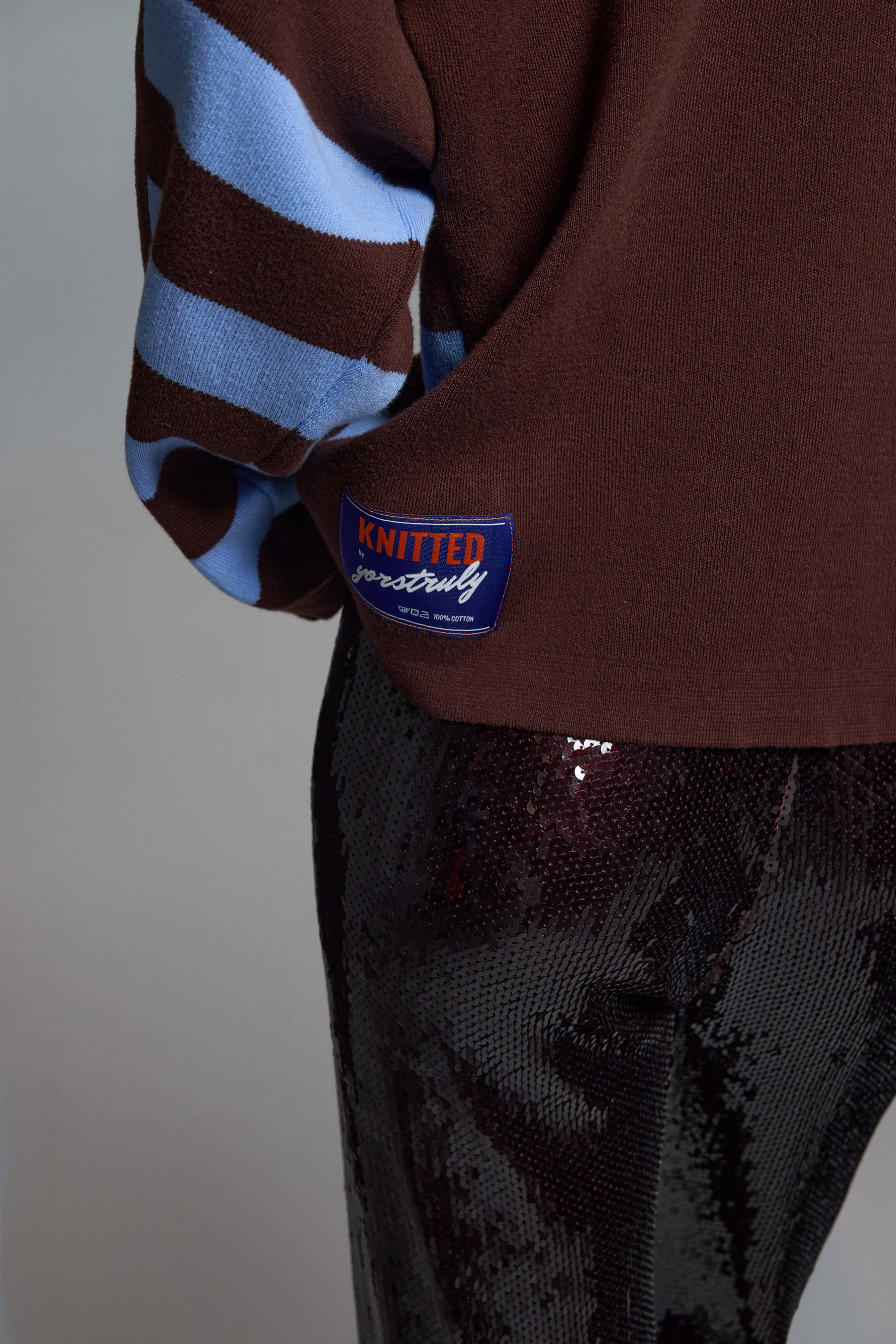 This brown and blue wide-striped knit combines a sporty silhouette with a timeless color contrast. Its soft texture and oversized fit offer a relaxed look, while the buttoned collar detail adds a nostalgic character to the design.