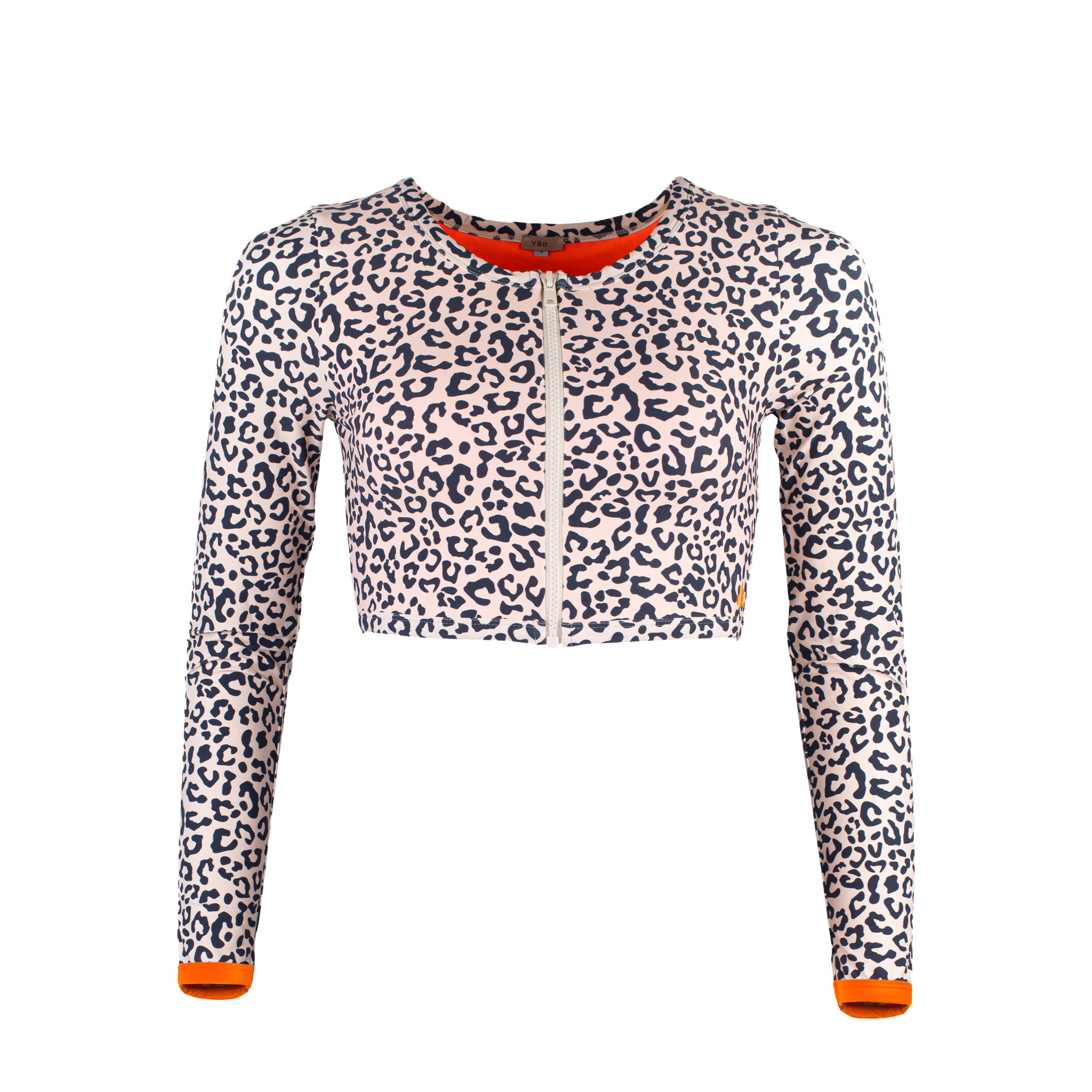 Introducing the long-sleeved crop top that offers maximum sun protection, in animal print with orange lining.