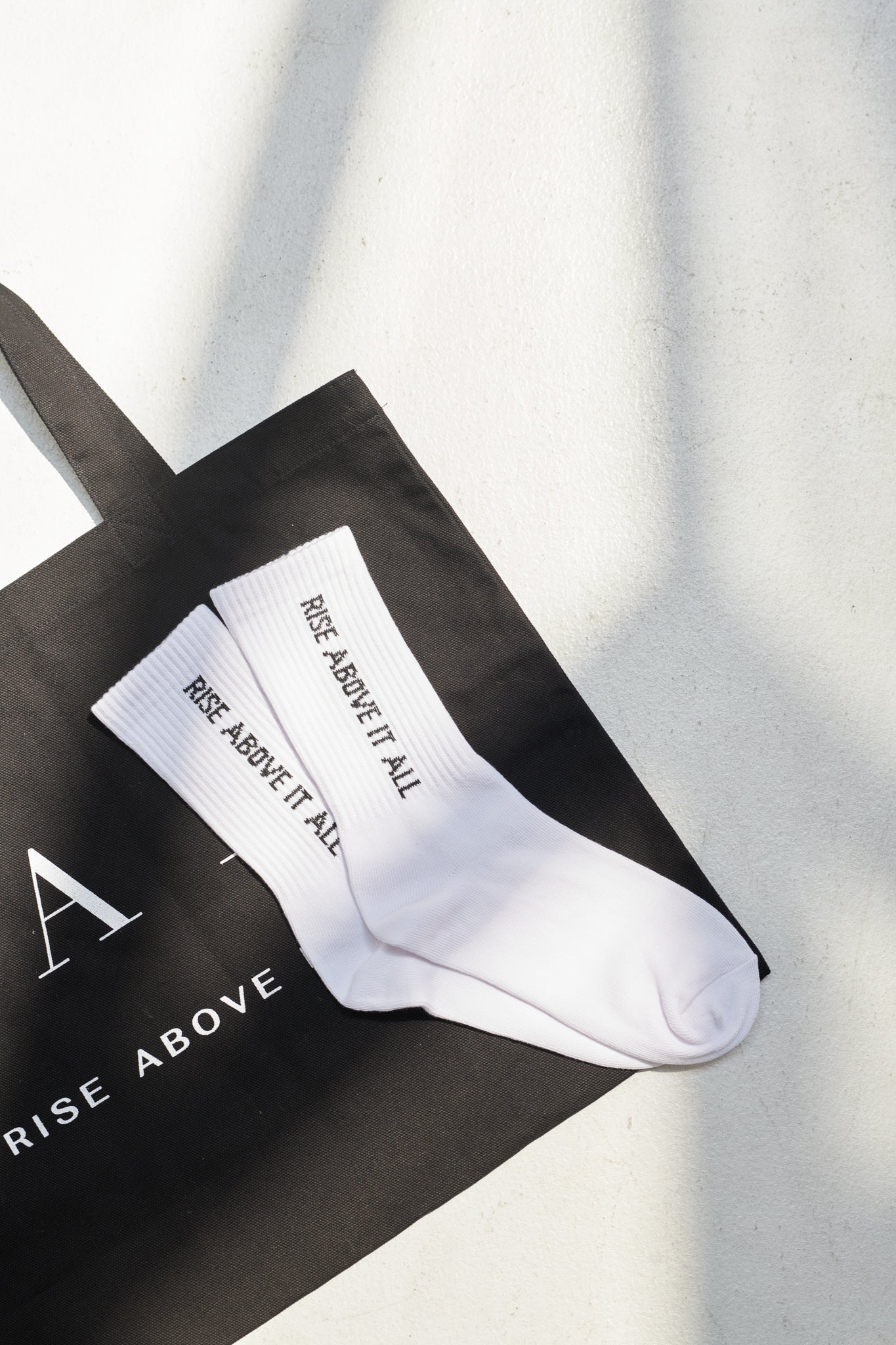 Step up your game with our “Rise Above It All” logo socks. Designed for both comfort and style, these socks are the perfect addition to your everyday wardrobe, providing a constant reminder to stay motivated and reach new heights.