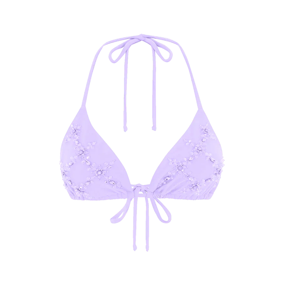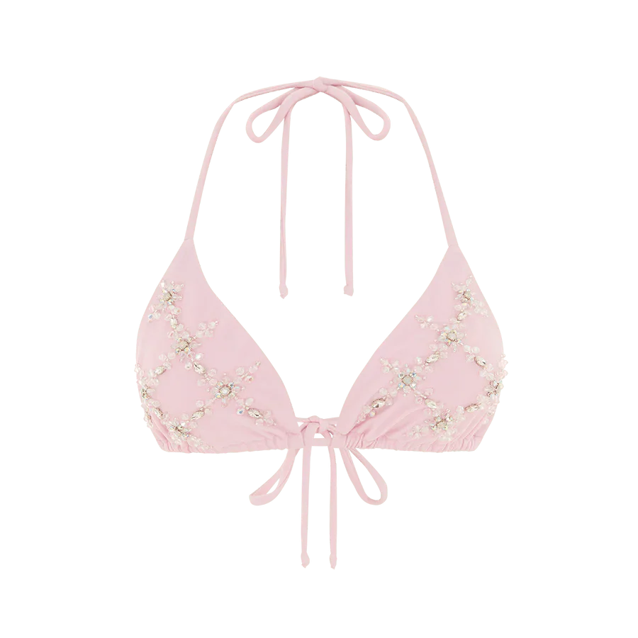 The Rose Luxe Self-Tie Bikini Top in pink is the ultimate luxury swimwear essential, handcrafted from eco-friendly Italian Lycra with delicate hand-embroidered crystal and opal bead details. With adjustable self-tie straps, this designer bikini top offers a flattering fit and second-skin comfort. Perfect for romantic getaways, luxury poolside lounging, and resort holidays.