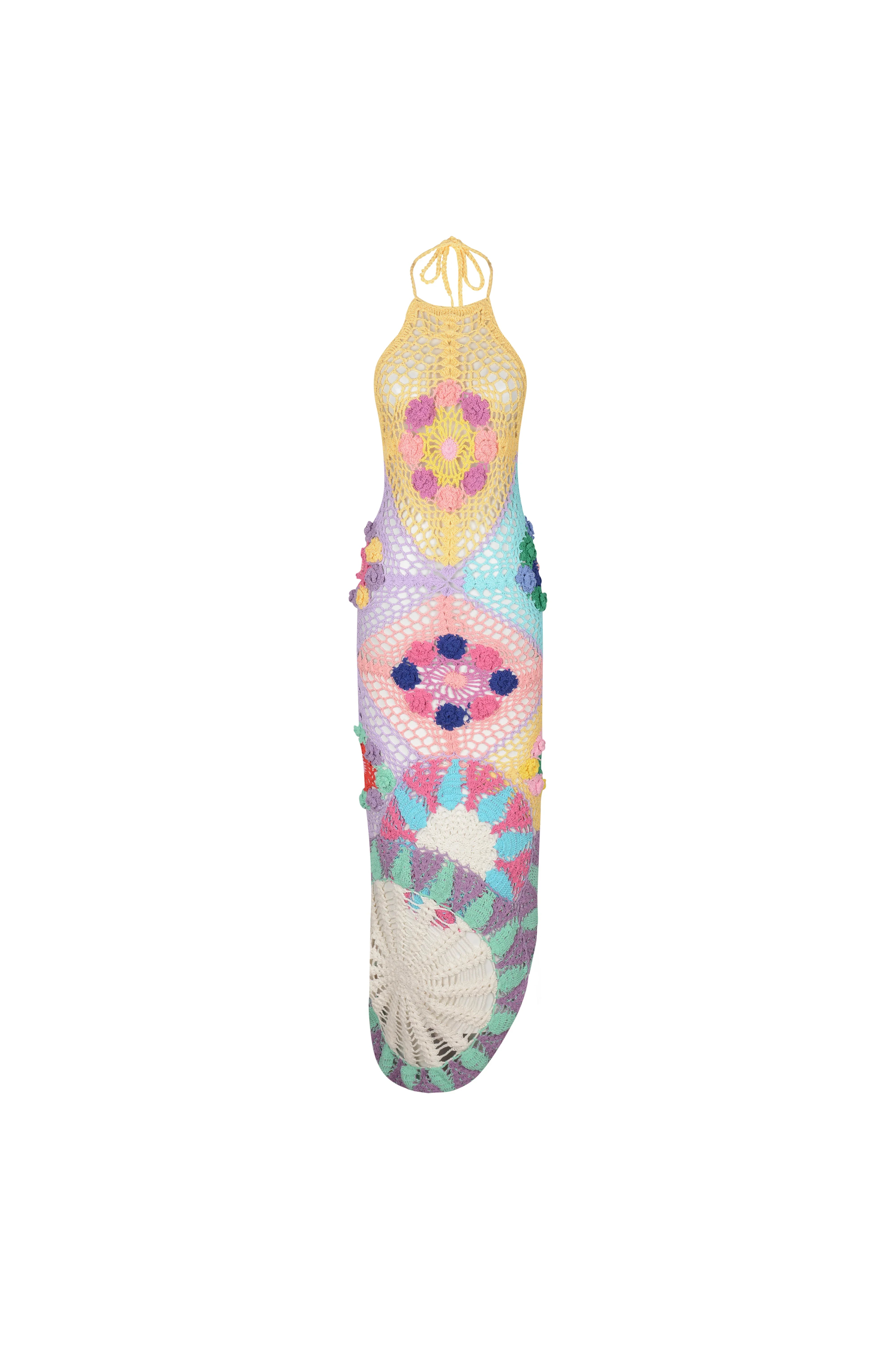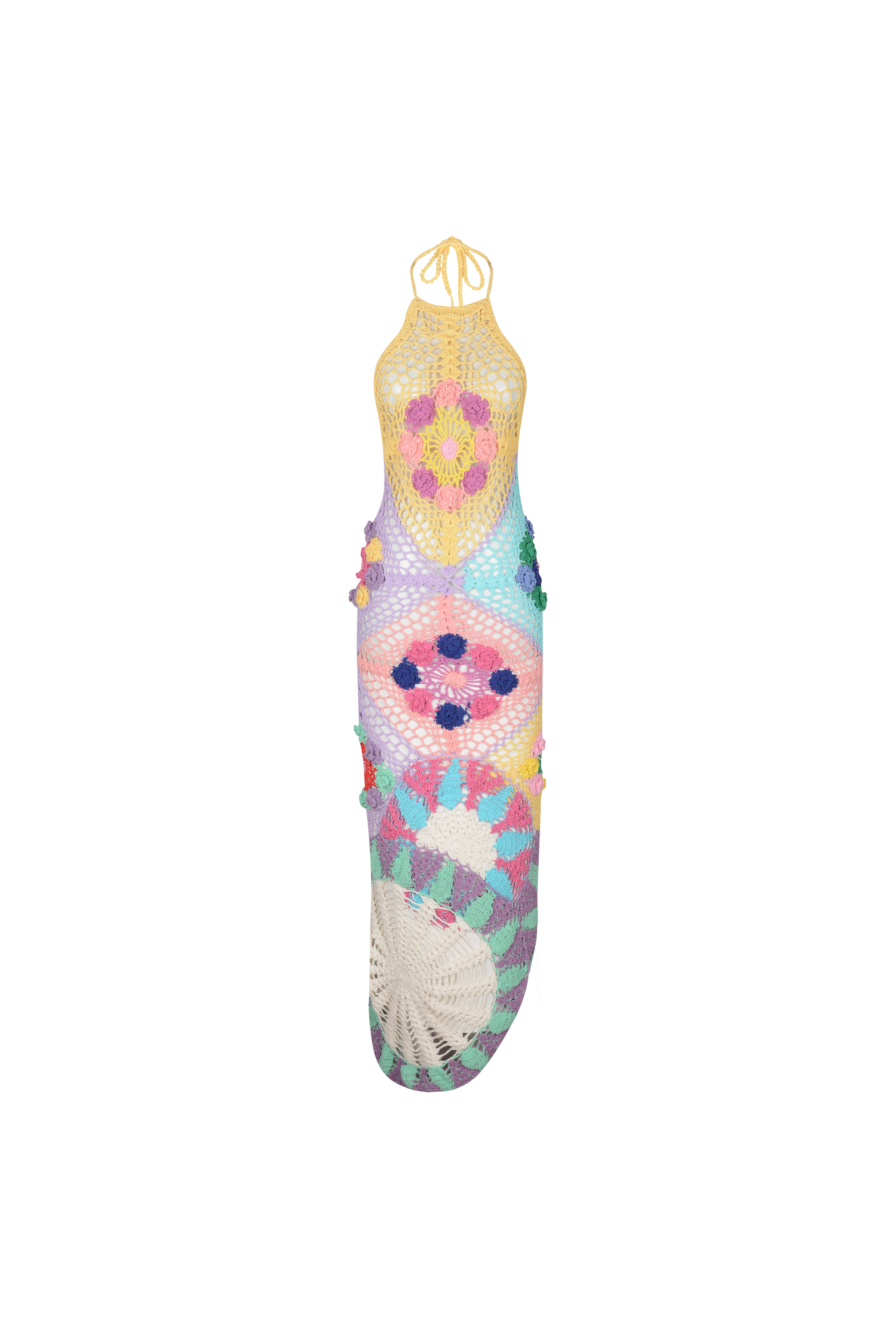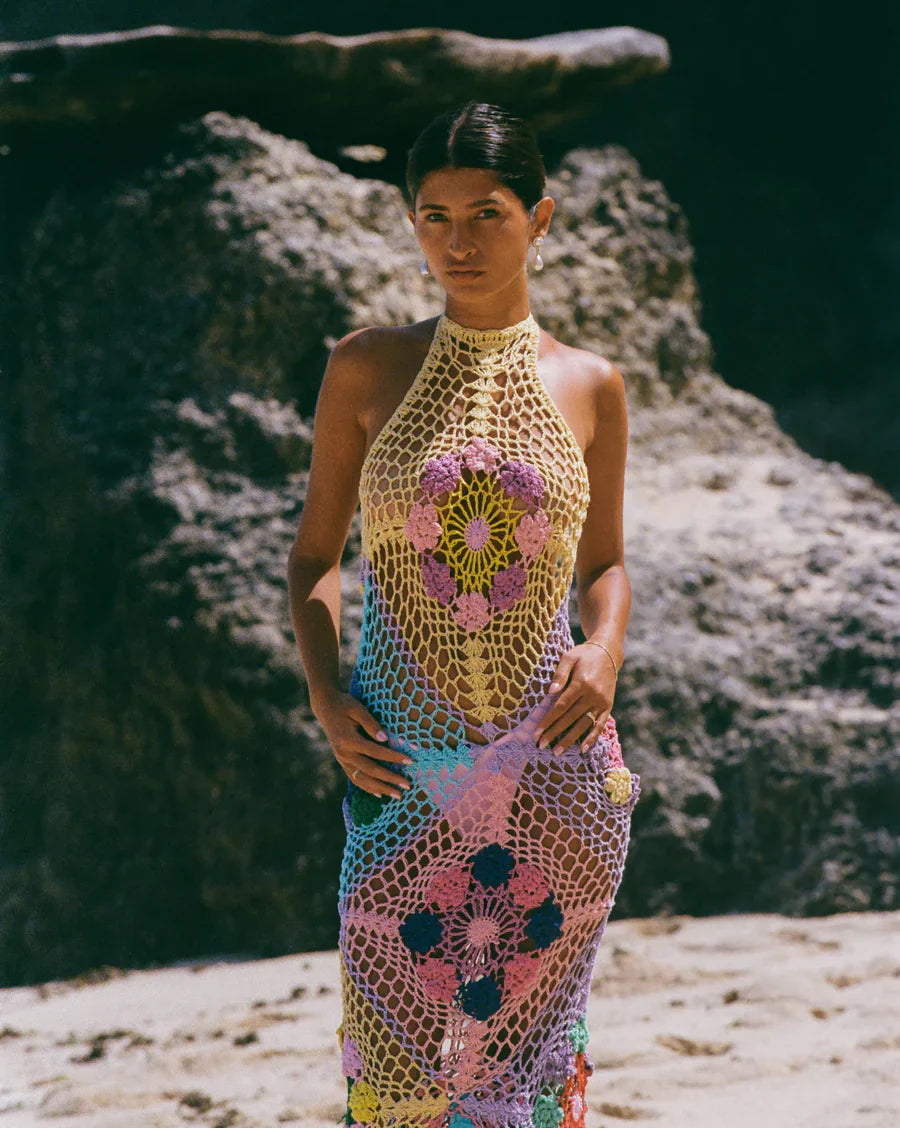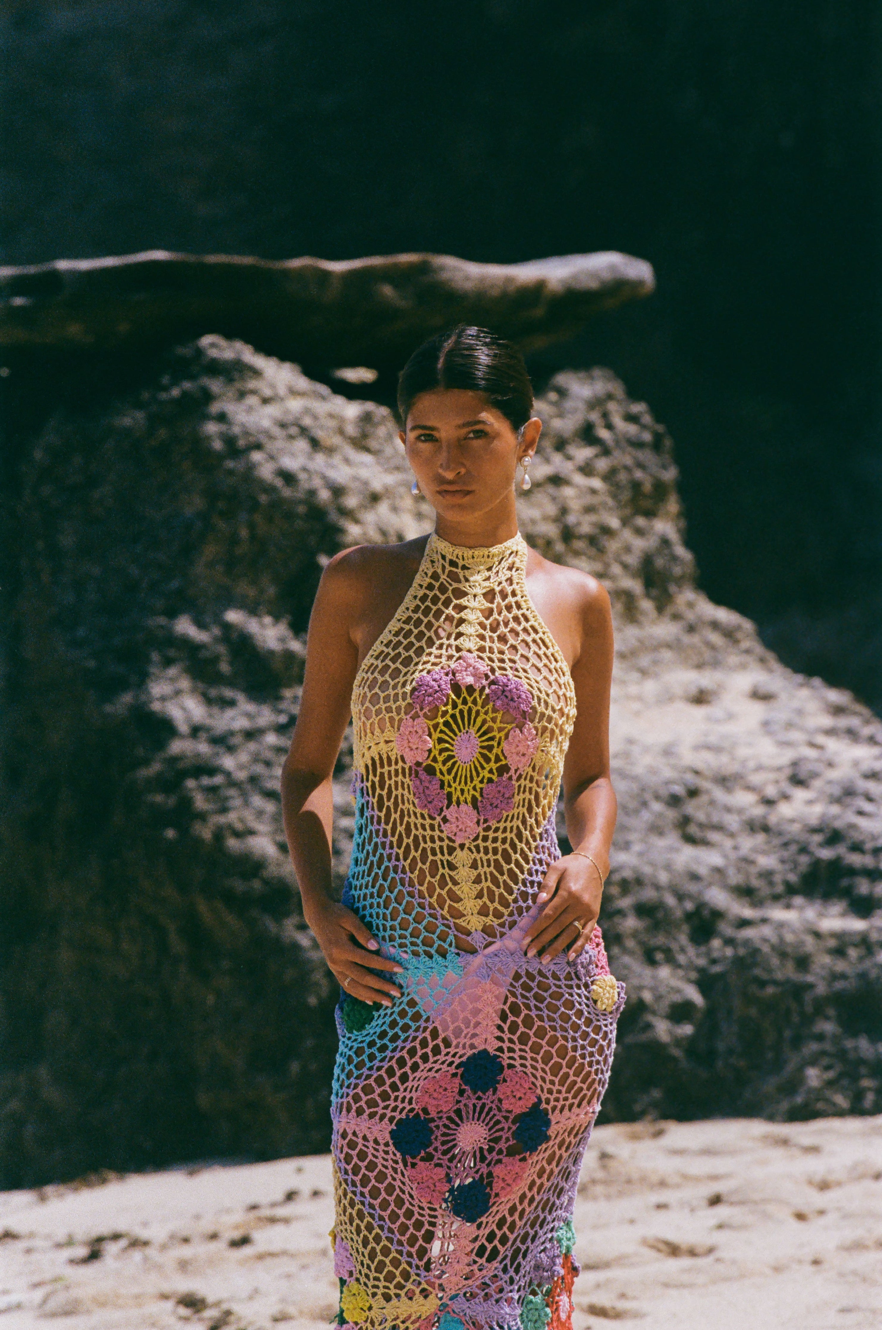 Embrace the beauty of the ocean with our stunning multicoloured Rowan crochet maxi dress. The intricate crochet design features a vibrant mix of colors, creating an eye-catching and dynamic pattern. This dress is adorned with delicate seashell and reef embellishments, capturing the enchanting essence of the underwater world. The maxi length offers a graceful and flowing silhouette, perfect for beach outings and summer parties.