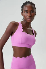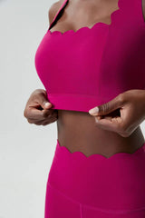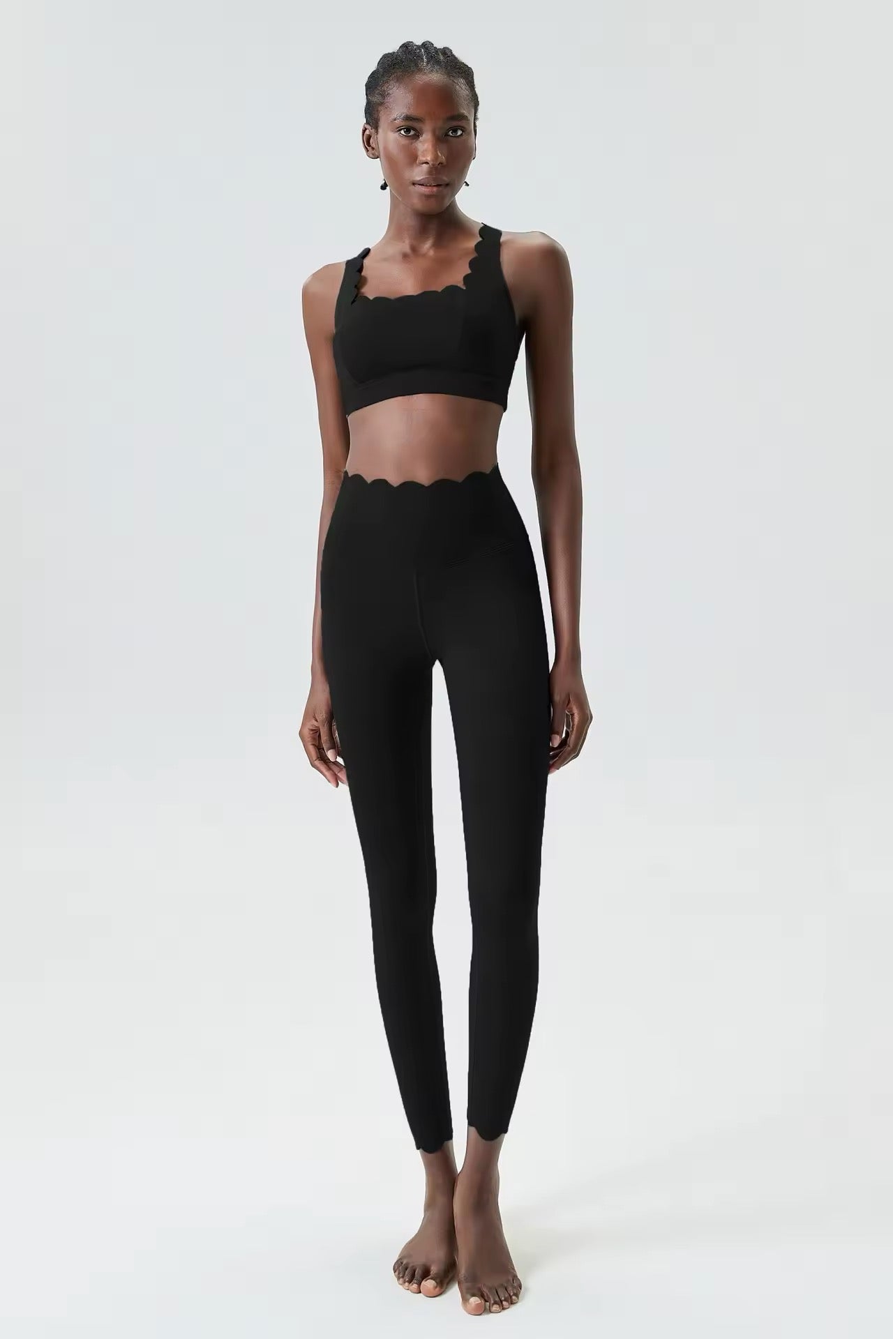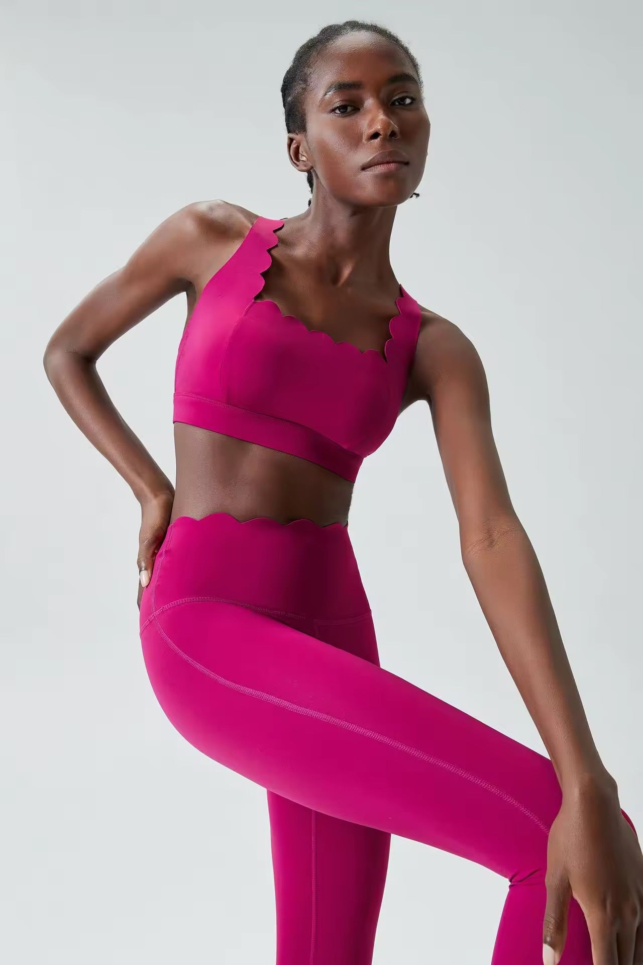Experience the unmatched comfort of our buttery-soft Scallop Sports Bra and leggings, now available in sleek onyx black, sophisticated raspberry or stylish blueberry top with scallop leggings.