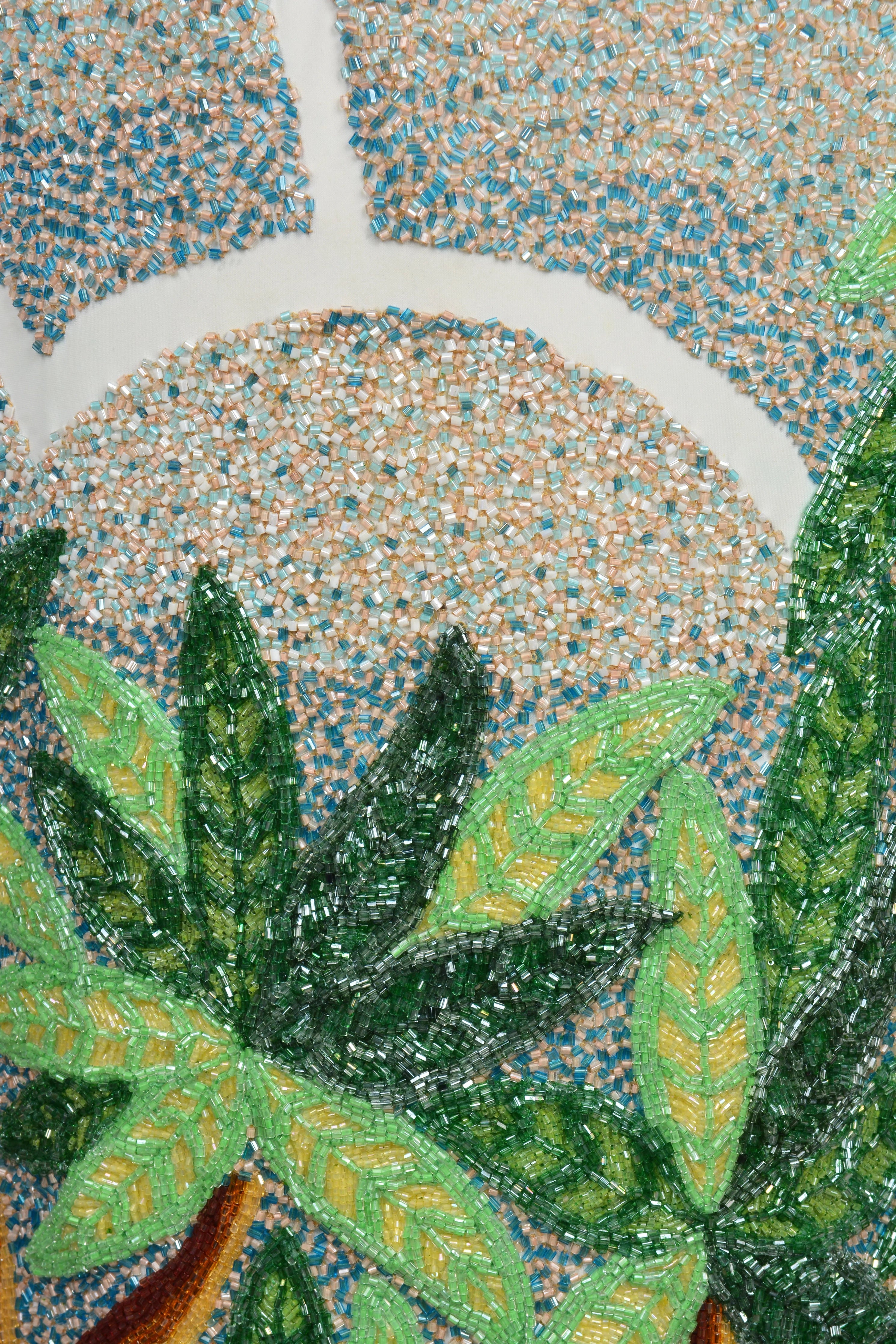A Tropical Dream, Hand Beaded Scalloped design dress features a stunning palm tree motif, capturing the essence of a sun-soaked paradise. With an open front and back, and a flattering neck tie, it offers a relaxed yet elegant silhouette. The delicate scallop detailing adds a refined touch, while the palm tree pattern evokes effortless beachside glamour. Perfect for warm evenings or resort wear, this dress brings tropical elegance and effortless style together in one captivating design.
