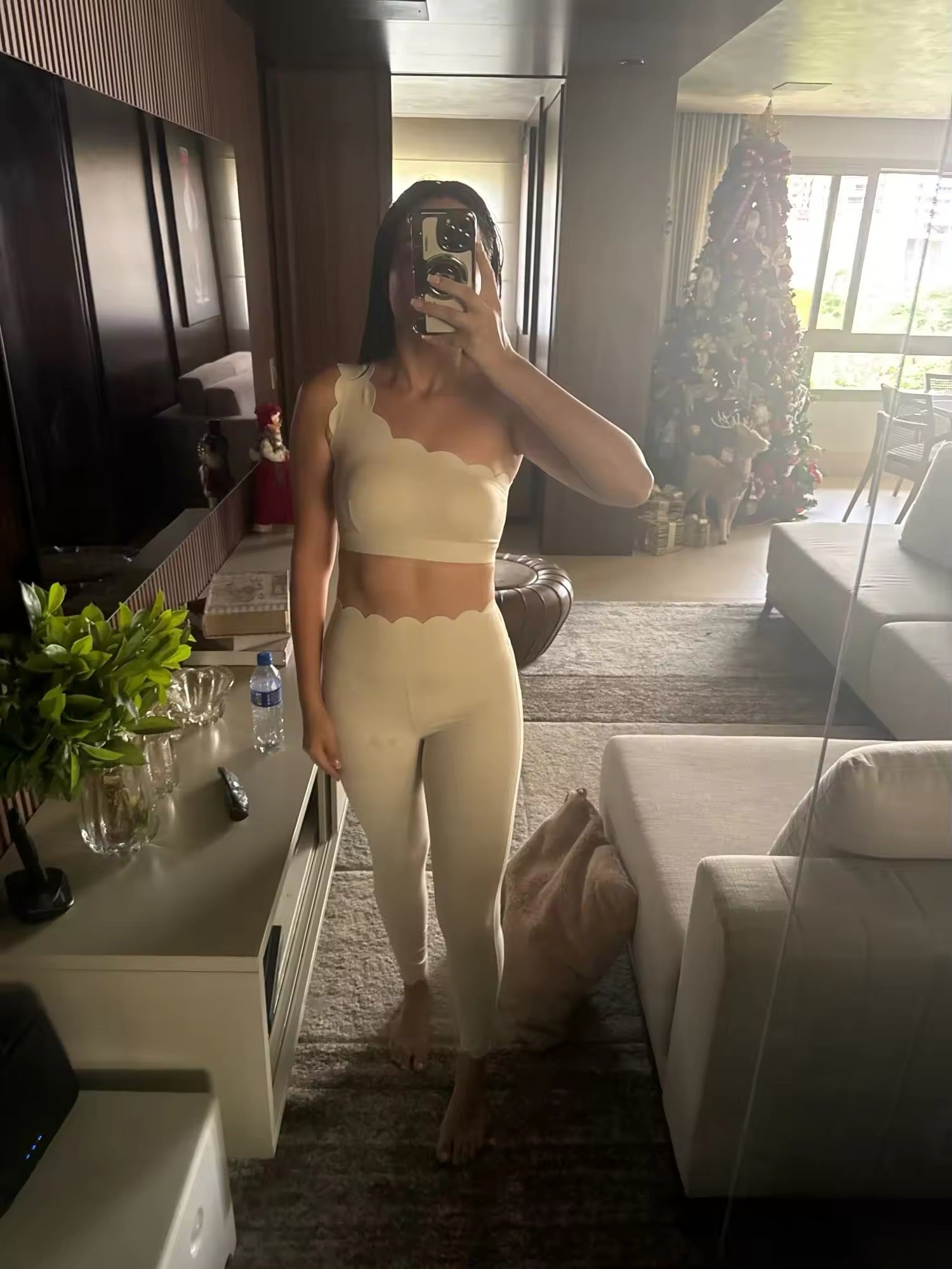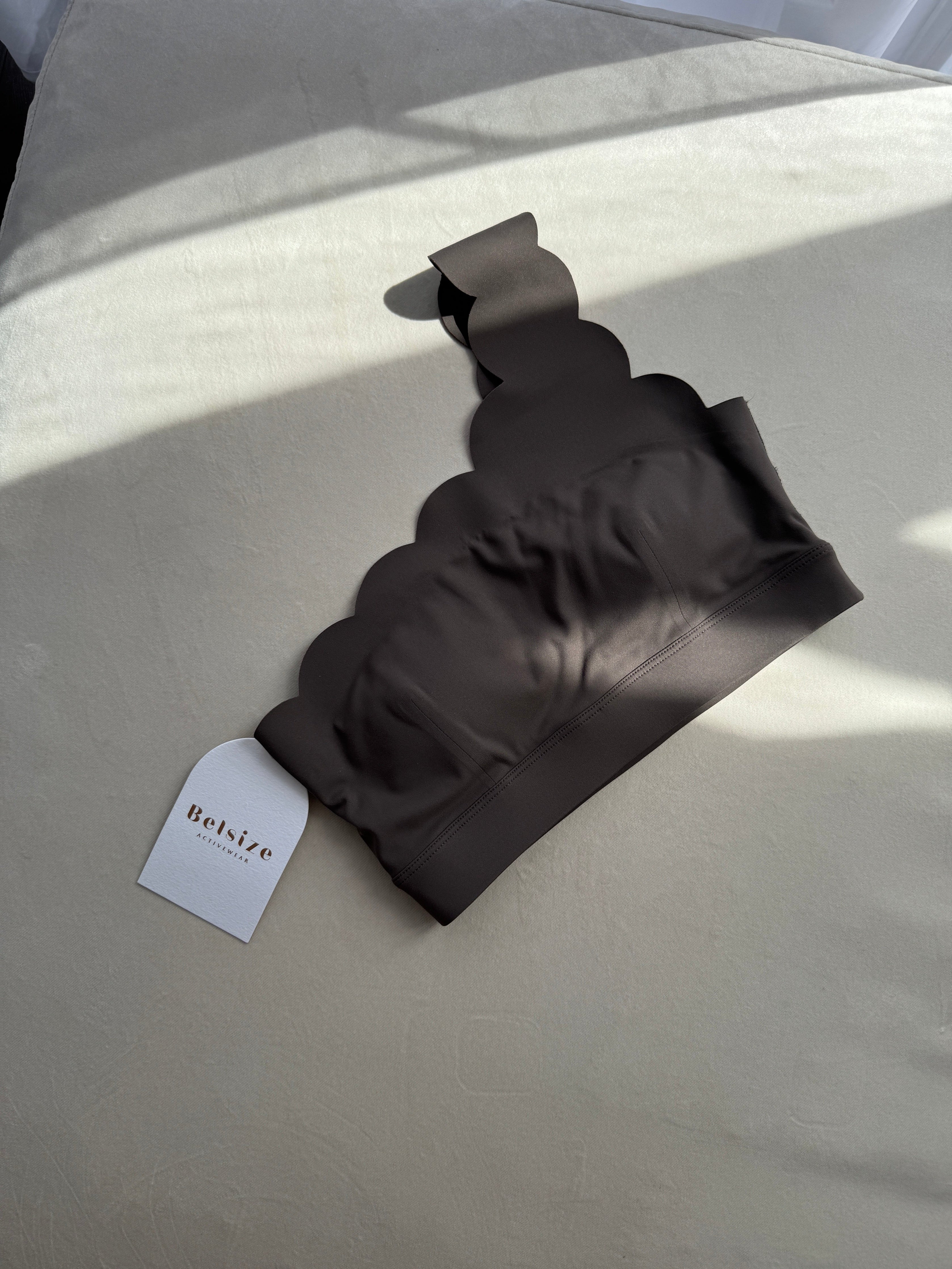 Experience the unmatched comfort of our buttery-soft Scallop Sports Bra and leggings, now available in sleek onyx black, sophisticated taupe and a mix light blue top and navy blue leggings.