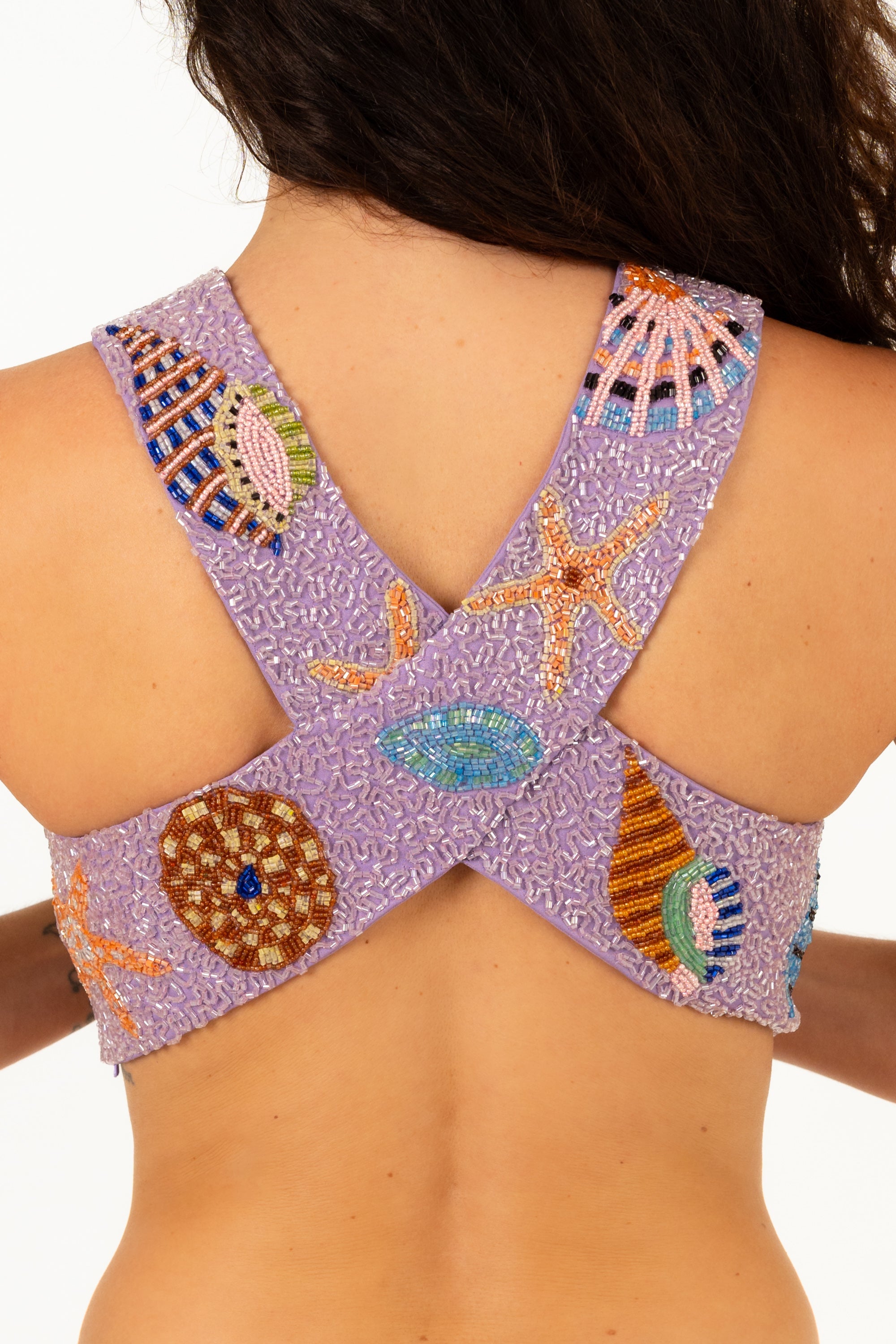 A true showstopper, the Seahorse Top is meticulously hand-adorned with intricate crystal beadwork, creating a shimmering finish that catches the light with every step. Crafted with precision and care, each bead is placed by hand, making every piece a work of art.