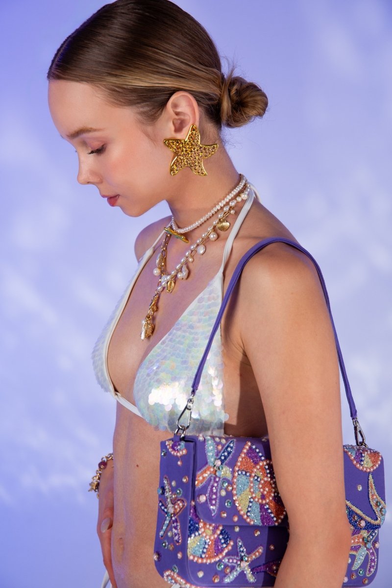 An Oceanus icon reimagined in dreamy shimmer and satin. The Selene Bag returns in a rich lilac beaded satin, recreated as a luxury statement evening bag for fashion-forward women. Expertly hand-embellished with crystal-studded starfish, seashells and swirling coral motifs, this coastal-inspired clutch is the perfect party, cocktail and vacation accessory. Ideal for weddings, summer beach events, and destination resort nights, it adds an elegant ocean-themed touch to any outfit.