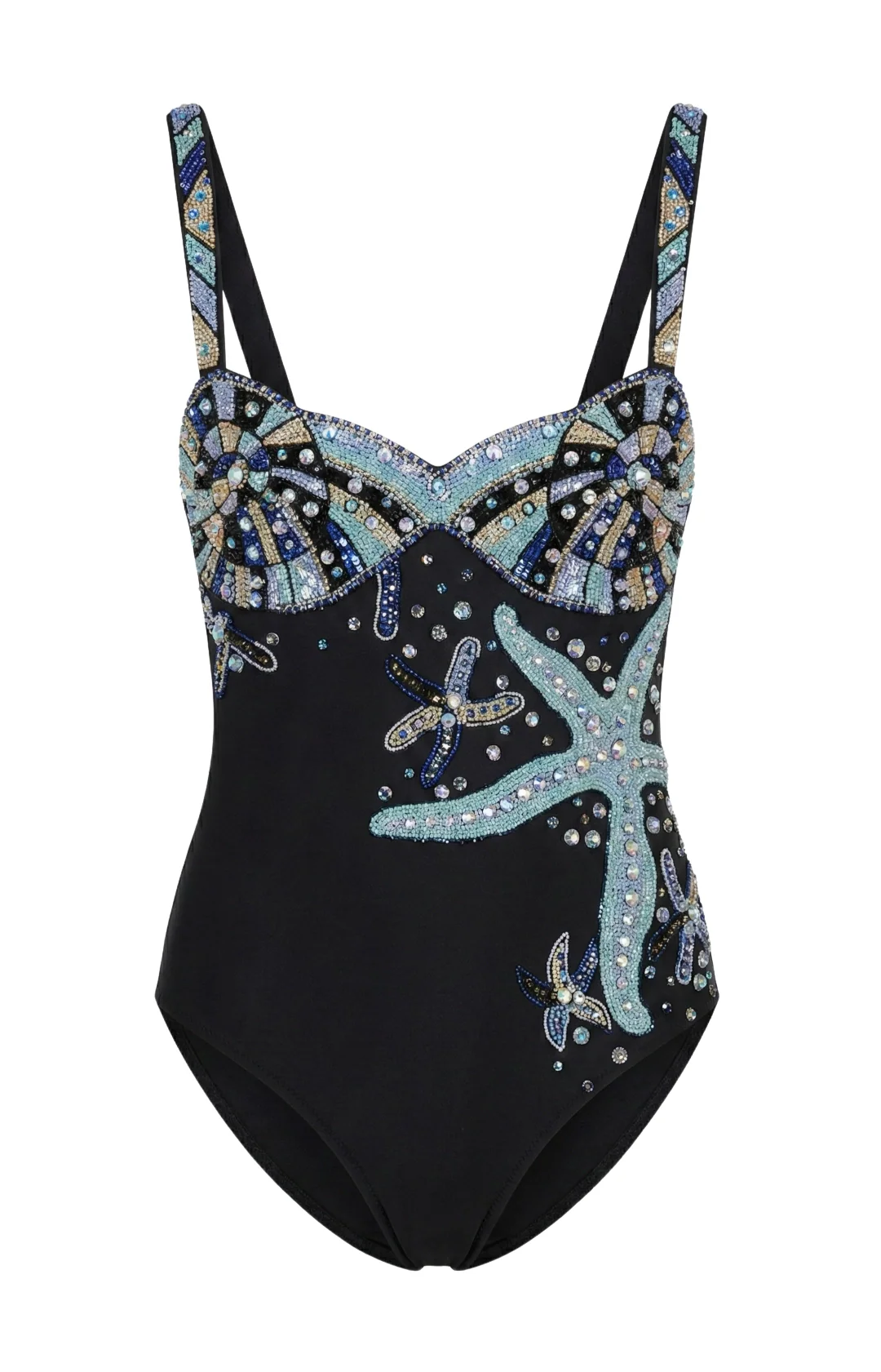 This striking one-piece features intricate shell-inspired detailing and beaded embellishments that evoke luxury resort wear.