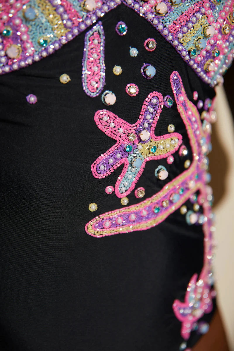 The Selene Black One-Piece Swimsuit with pink shell bust features exquisite hand-beaded seashell embellishments in pink, lilac, and purple tones. Crafted in London from luxury Lycra, it offers a figure-hugging fit while radiating underwater-inspired glamour. Ideal for resort wear, luxury swim collections, and holiday beach style, this limited-edition designer swimsuit is a summer essential.