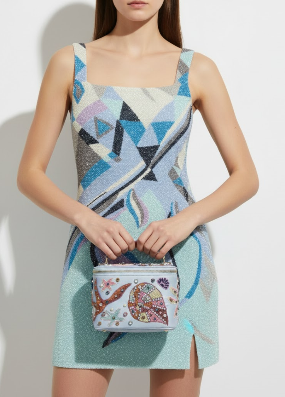 Dive into ocean-inspired elegance with this beautifully handcrafted vanity case. Featuring intricate beadwork of seashells, starfish, and coral motifs, this pastel-blue case captures the charm of the sea with shimmering pearls and gemstones. Designed with a sturdy handle and a full zip closure, it’s perfect for storing your beauty essentials or jewelry in style. Whether at home or on your travels, this statement piece adds a touch of luxury and whimsy to your collection.