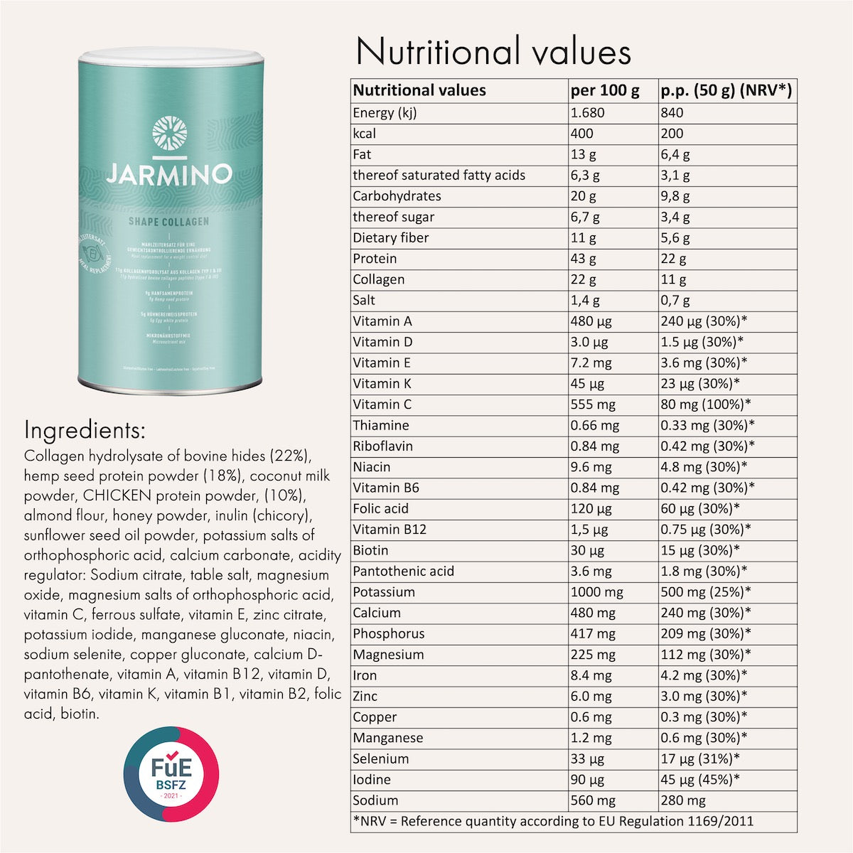 One tin contains 500g of JARMINO Beauty Collagen (10 servings of 50g each). A 50g portion is very rich, 25g is recommended for a snack or as a shake.