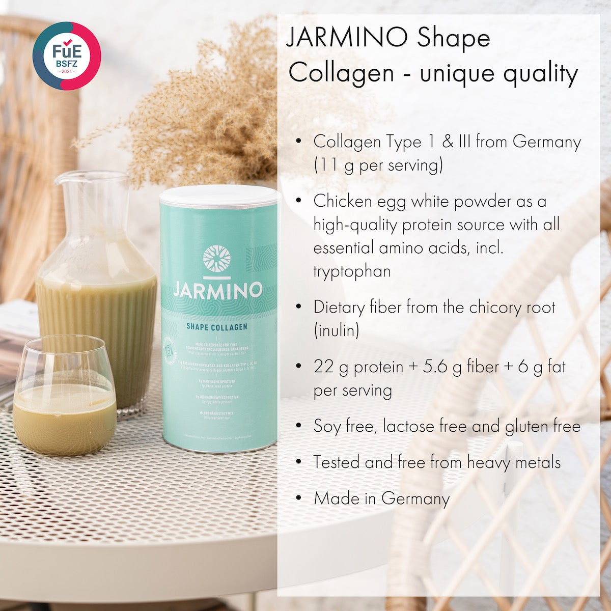 What do I need to keep in mind while dieting? In order to lose weight successfully, it is important that you adhere to the consumption recommendations, eat a low calorie diet and ensure sufficient fluid intake. In addition to water and unsweetened tea, we recommend bone broth or vegetable broth.. Are there any side effects? As our Shape Collagen is a natural product, there are usually no side effects. However, as a diet or change in nutrition always means a change for the body, symptoms such as tiredness or headaches may occur at first. However, these are usually withdrawal symptoms, e.g. due to the reduction of sugar, which quickly disappear.. If you have any further questions, just send us a quick email to support@jarmino.co.uk. |