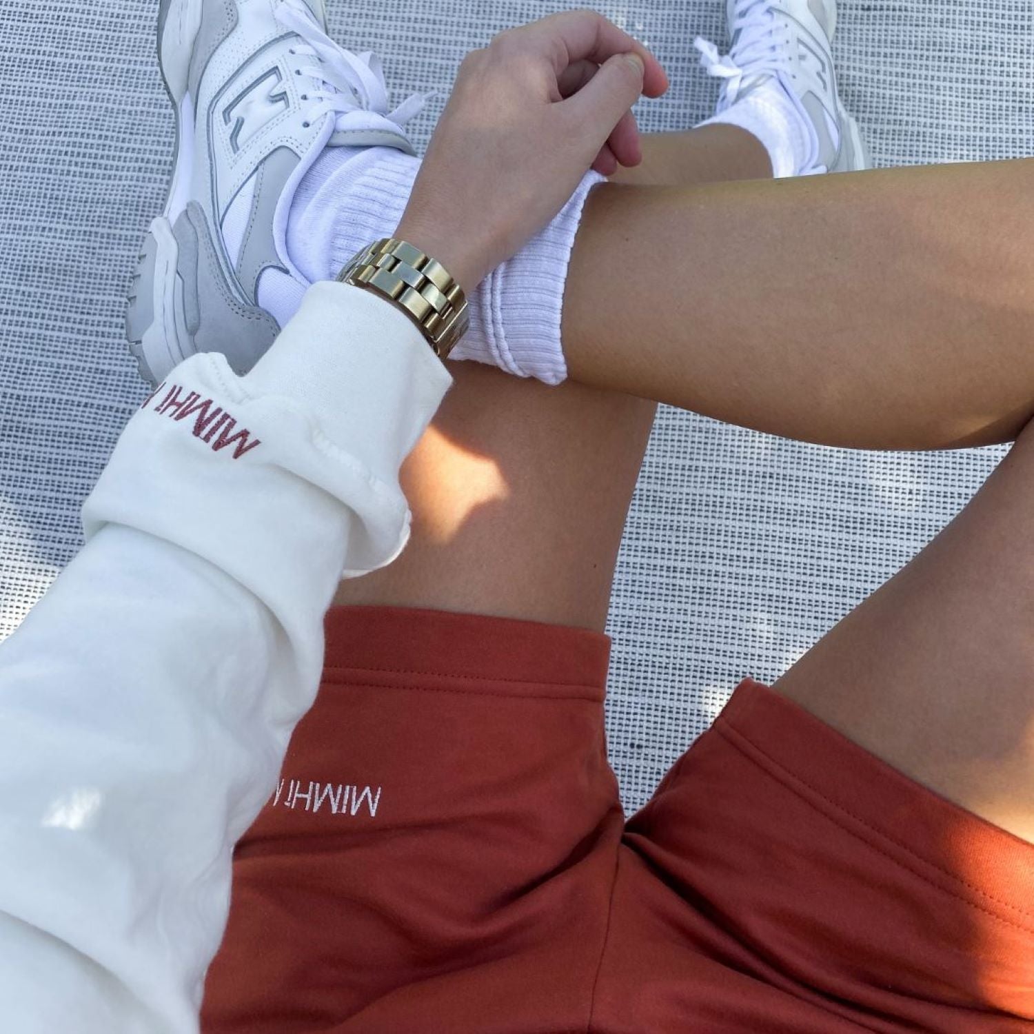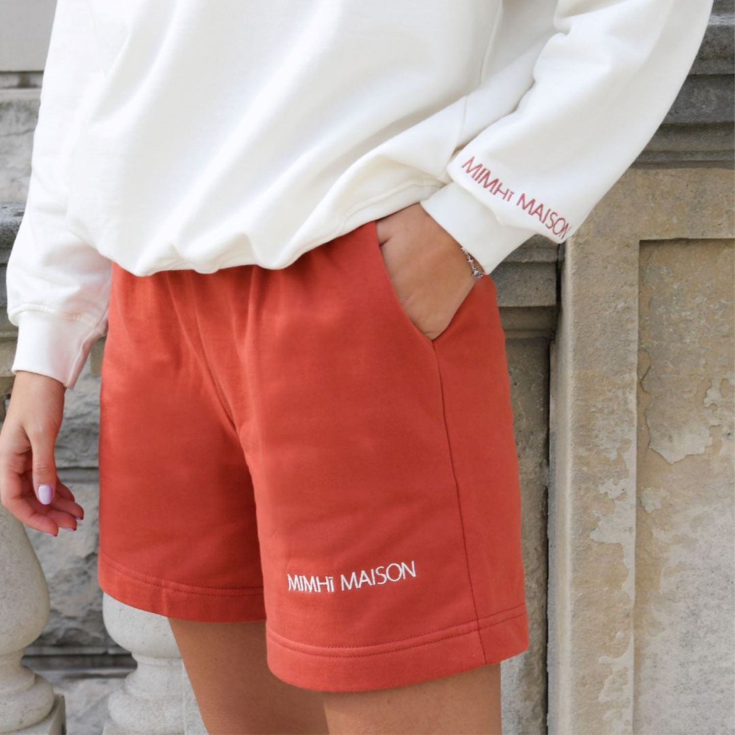 The terracotta shorts are made of 100% organic fleece cotton. It has the logo embroidered in white and features double stitching on the elastic waistband.