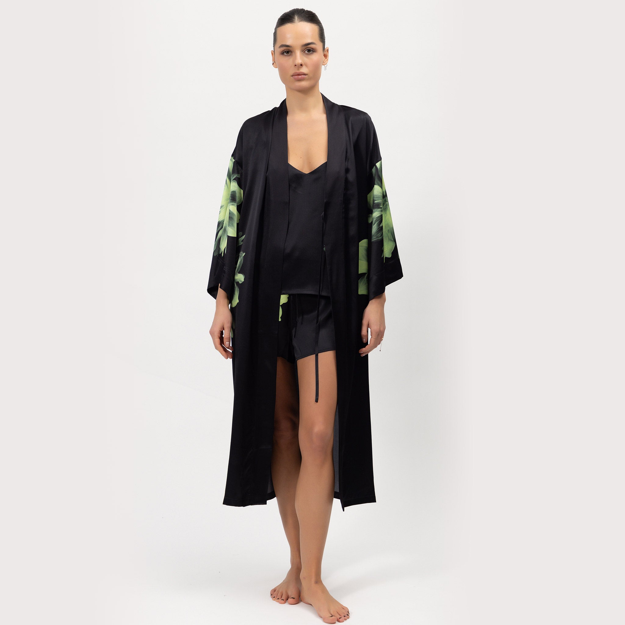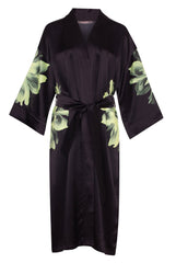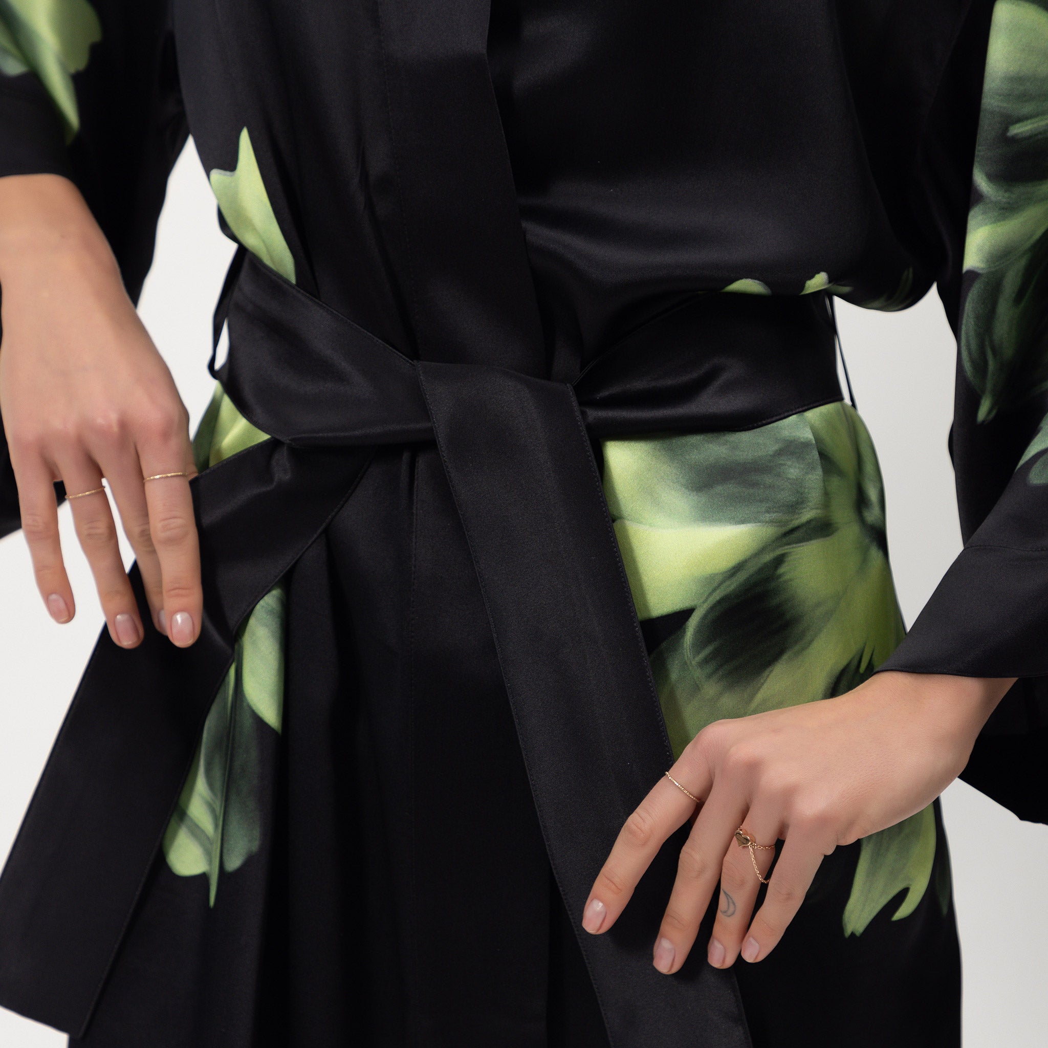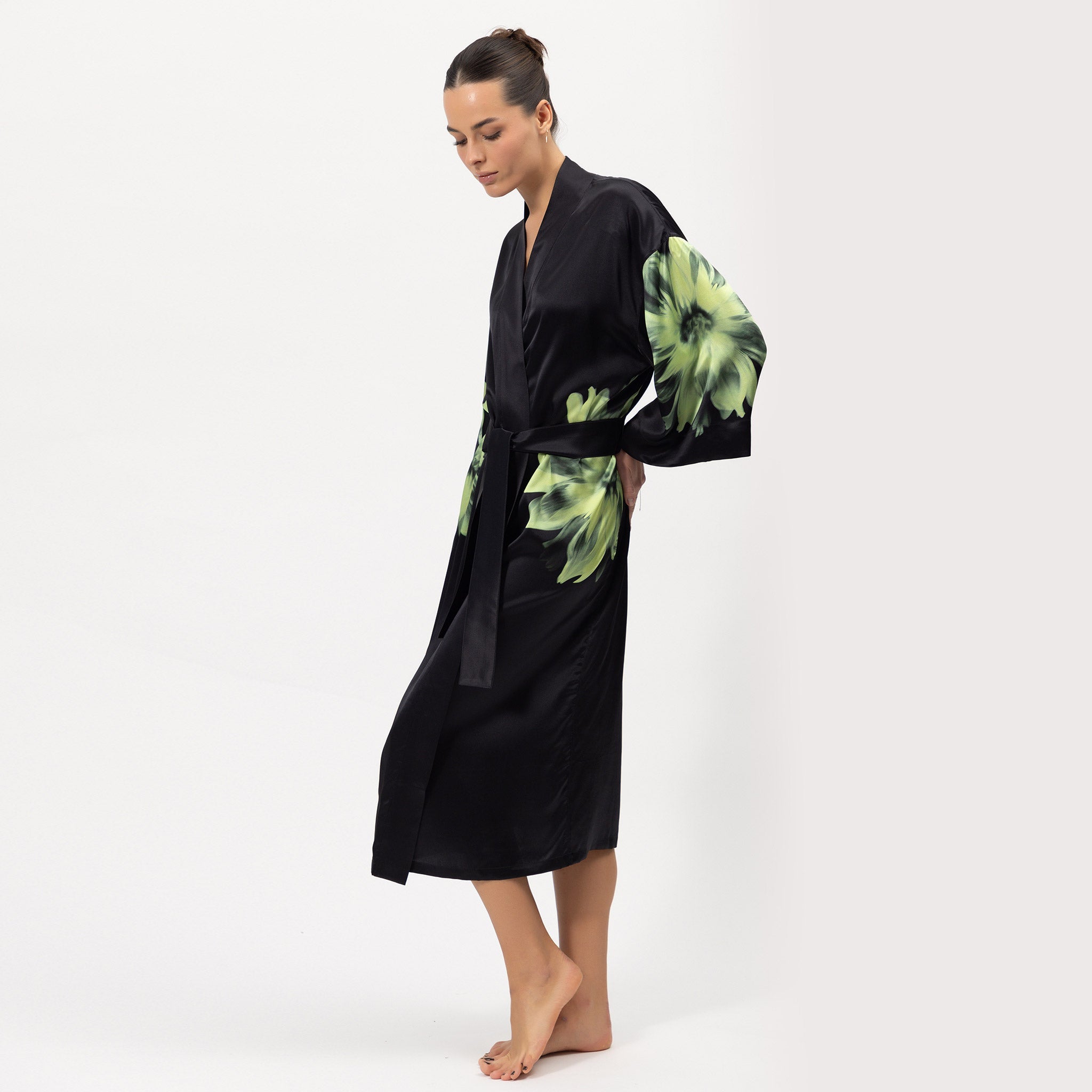 The Silk Dreamscape Long Kimono Robe is crafted from washable 100% Mulberry Silk, perfect for those who embrace a luxurious yet effortless lifestyle. It embodies a seamless blend of comfort and sophistication.