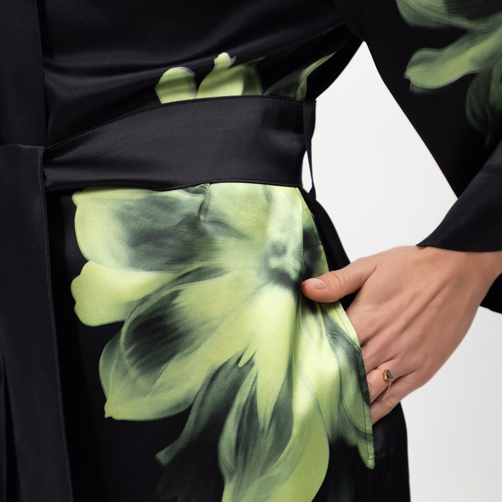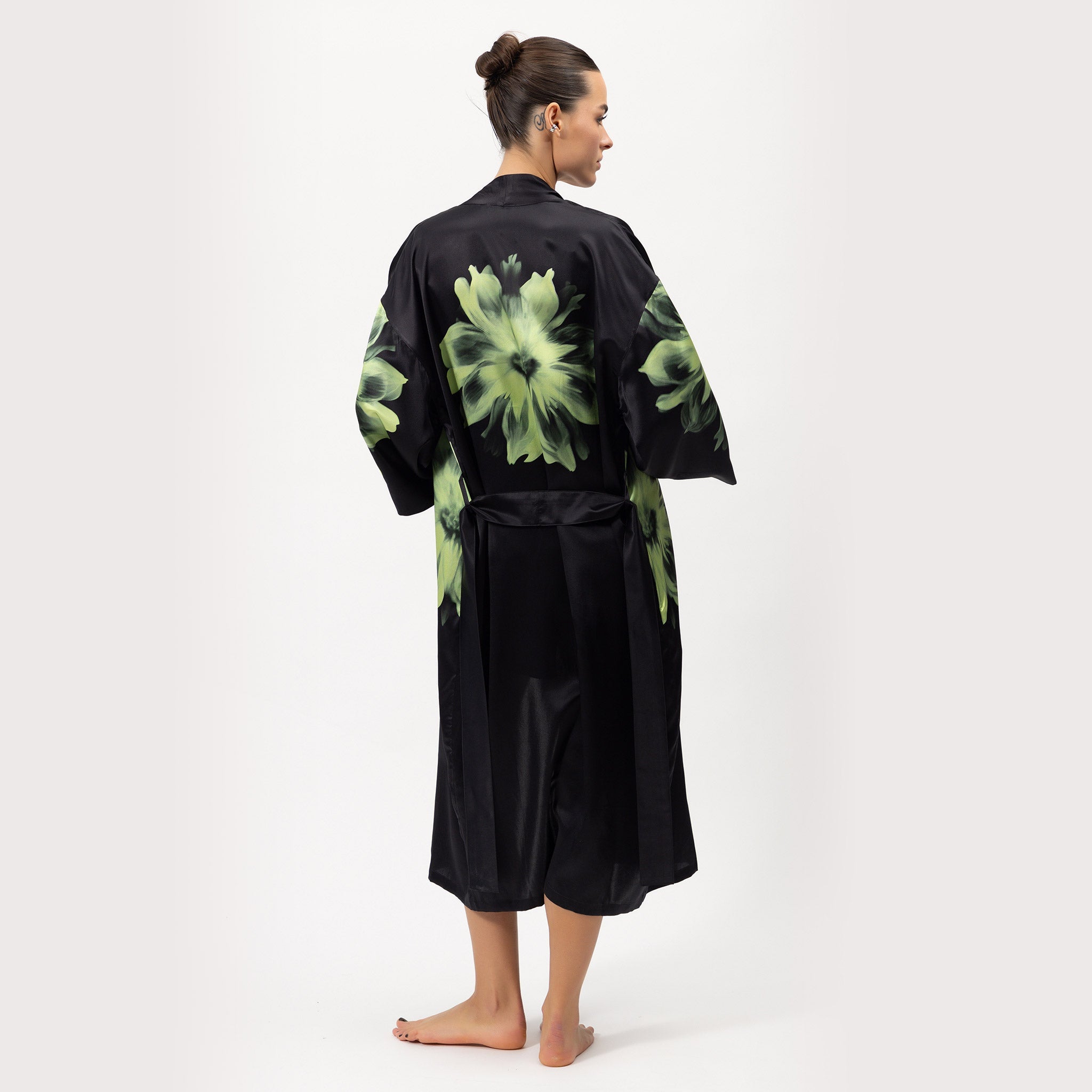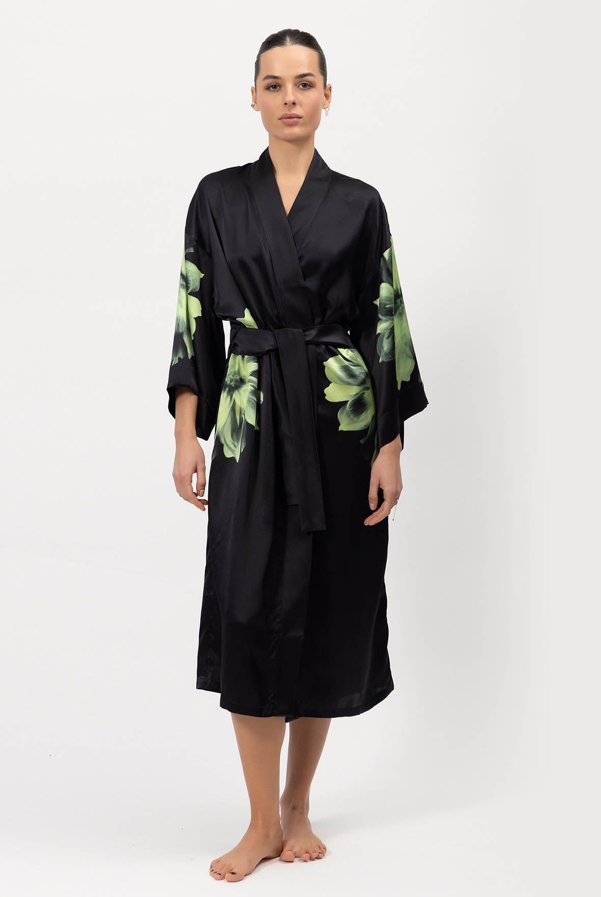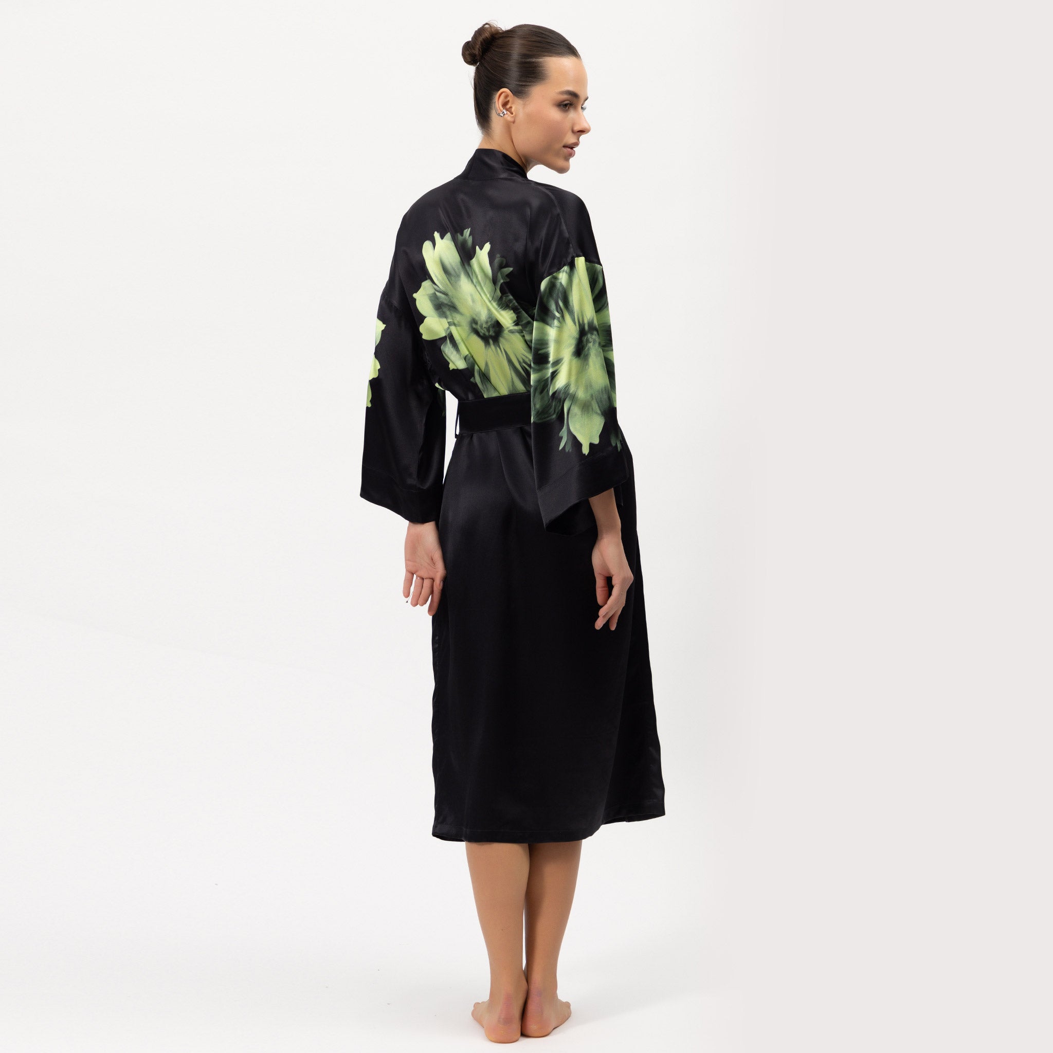 The Silk Dreamscape Long Kimono Robe is crafted from washable 100% Mulberry Silk, perfect for those who embrace a luxurious yet effortless lifestyle. It embodies a seamless blend of comfort and sophistication.