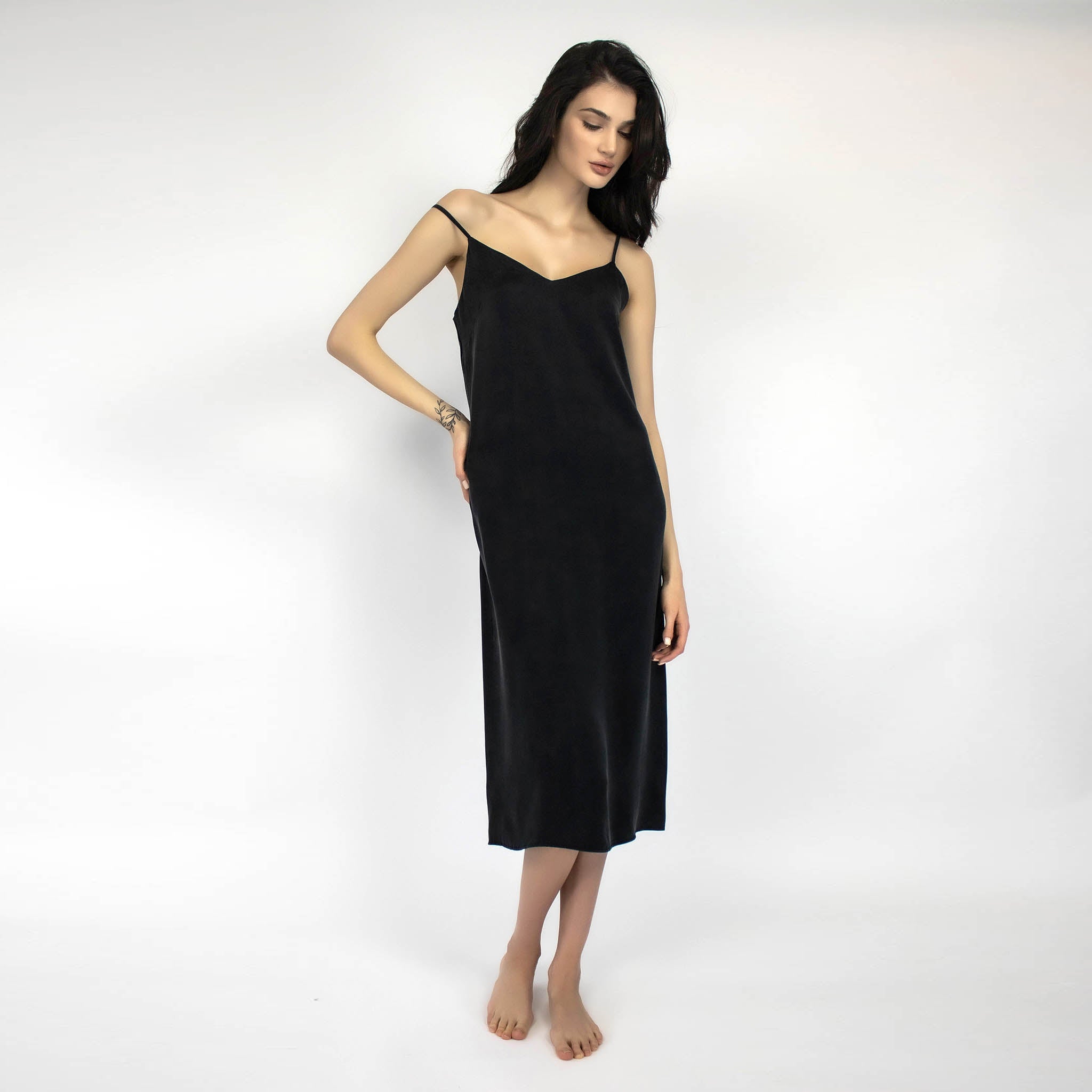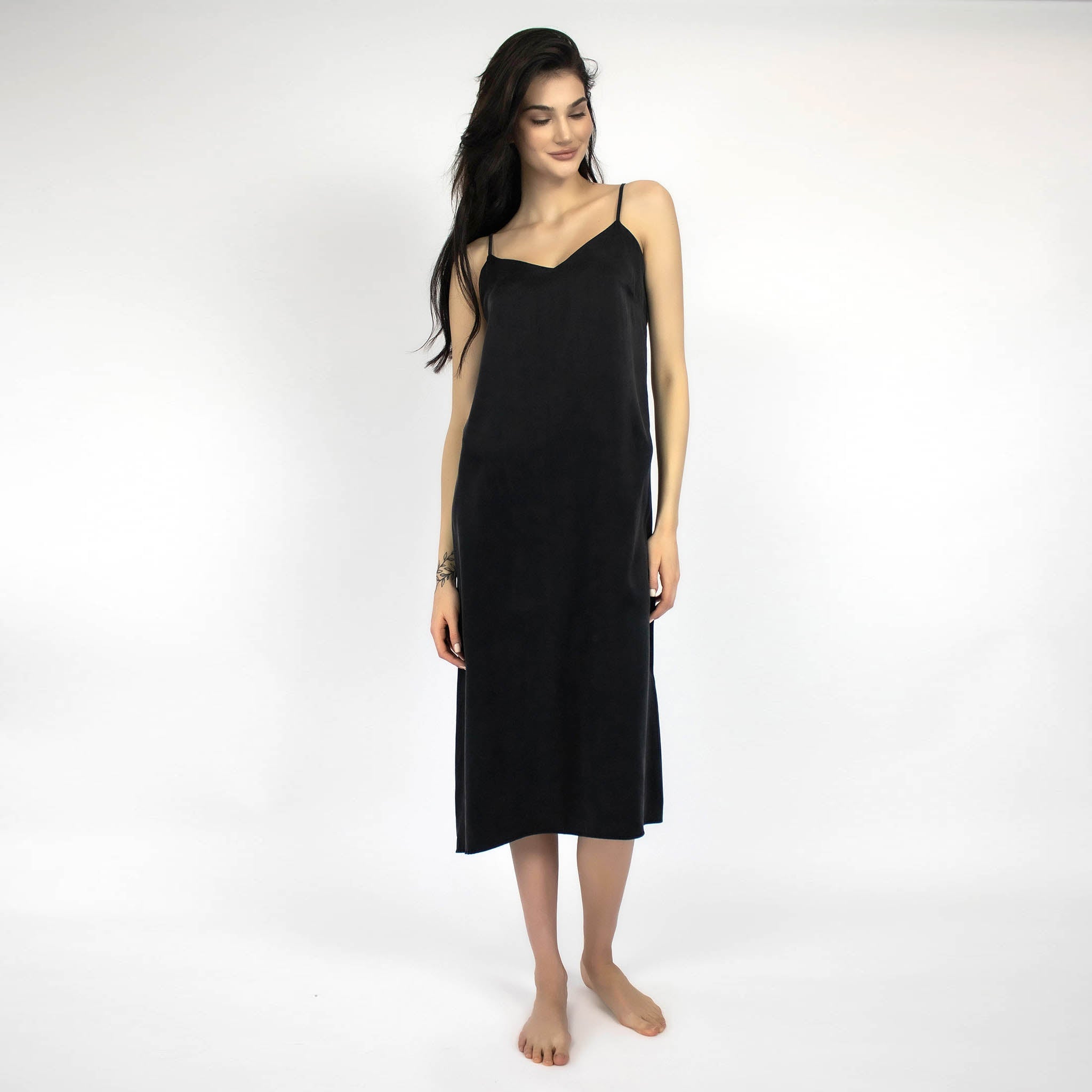 The Silk Dreamscape dress can be worn both as lingerie and fashion apparel. The bold, solid color of the elegant black color is an all-season favorite, easy to wear and match.