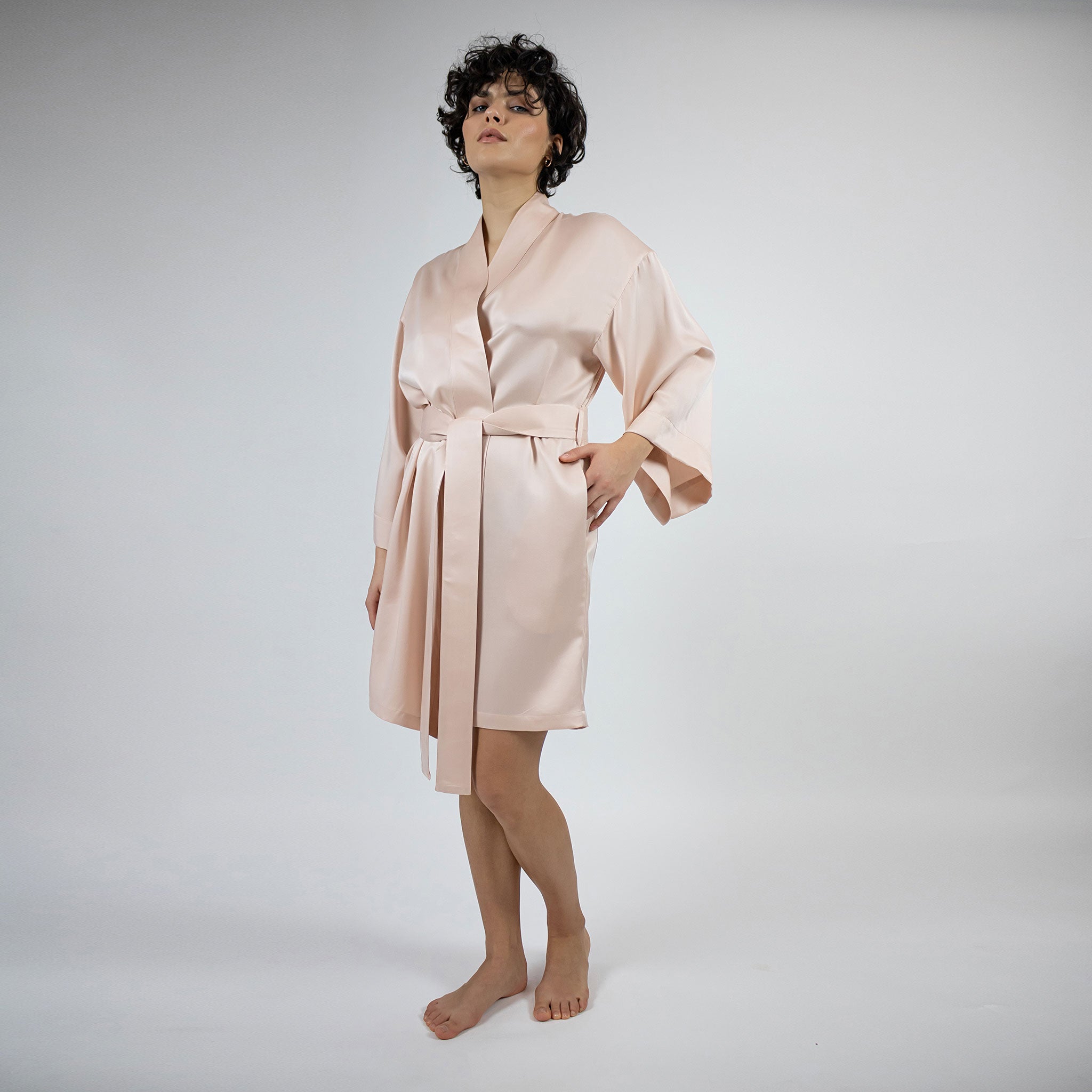 The captivating Transcendent Pink offers a sense of stability and a comforting cocooning quality. The robe is designed with a relaxed straight cut, a front wrap-style, a belted waist, a shorter length, and an overall comfortable fit.