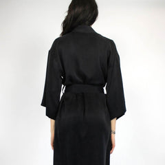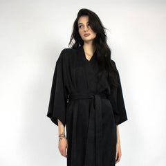 Its alluring black colour, favorite for all-seasons, adds elegance and sophistication. The robe features a relaxed straight cut, a wrap-style front, a wide belted, short length, kimono-style sleeve, and a comfortable fit.